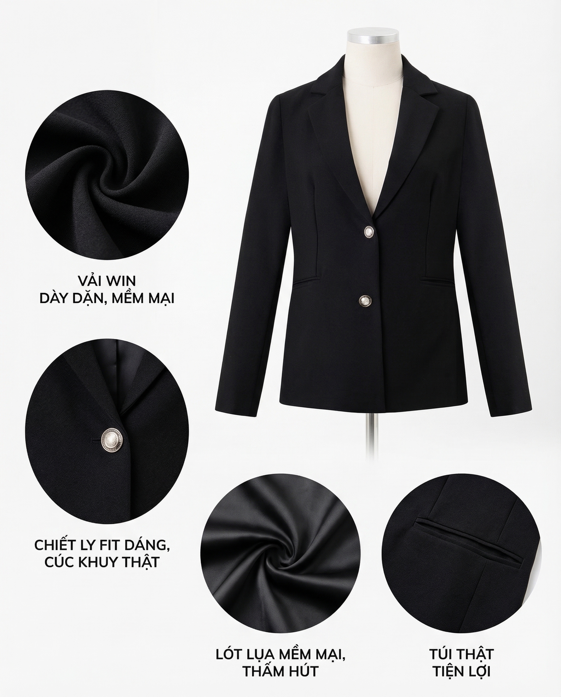 - Chất liệu : vải chính là vải Win có độ dày dặn và mềm mại giúp lên form đẹp mà không bị thô , bên trong có lớp lót lụa mềm mại và thấm hút mồ hôi .