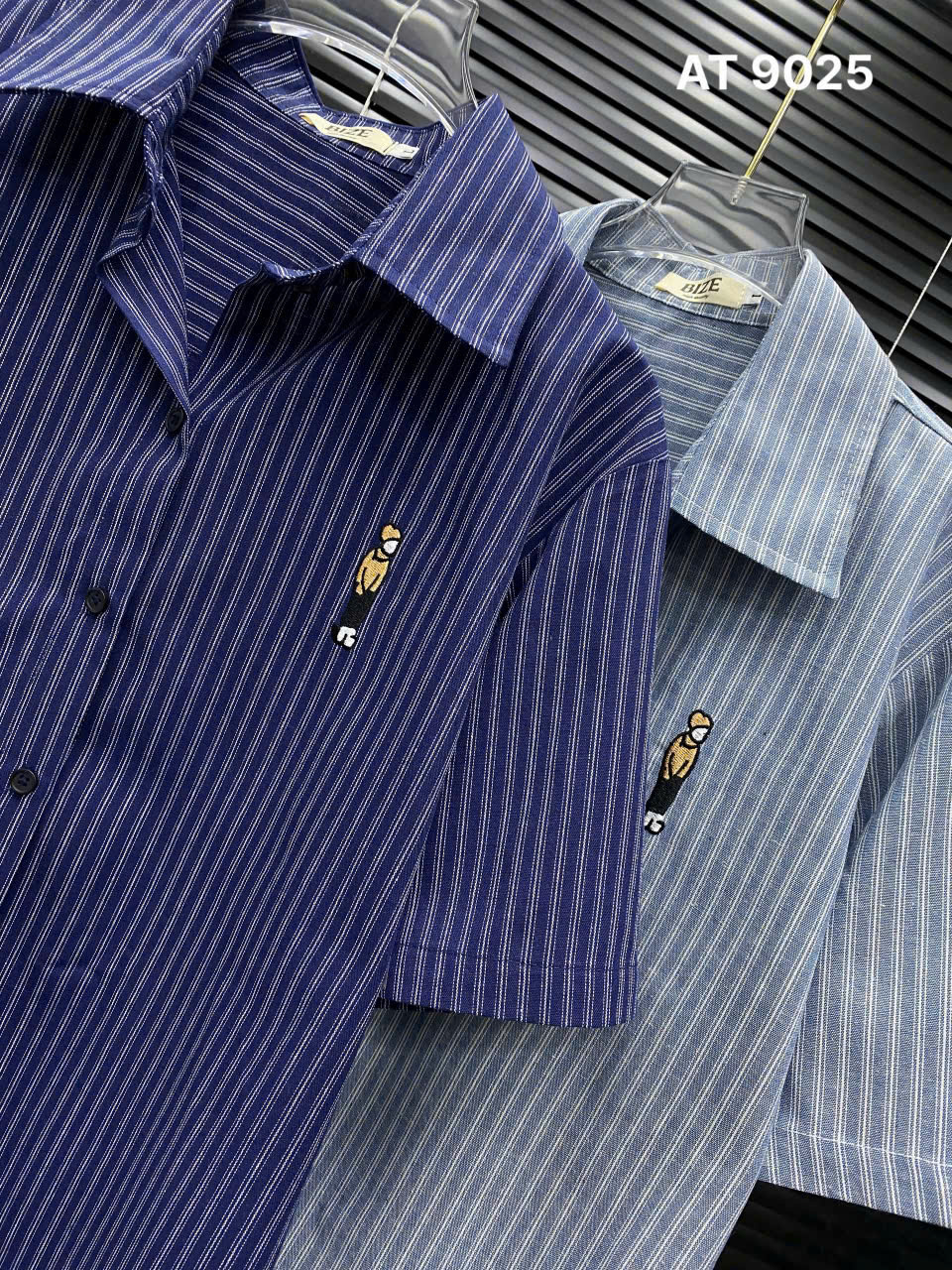 - Kiểu dáng : áo sơ mi kiểu tay ngắn , form vừa , thiết kế sọc kiểu giúp người mặc hack dáng hơn , 1 bên thân thêu hình gấu kiểu tạo điểm nhấn , vạt áo bầu nhẹ .