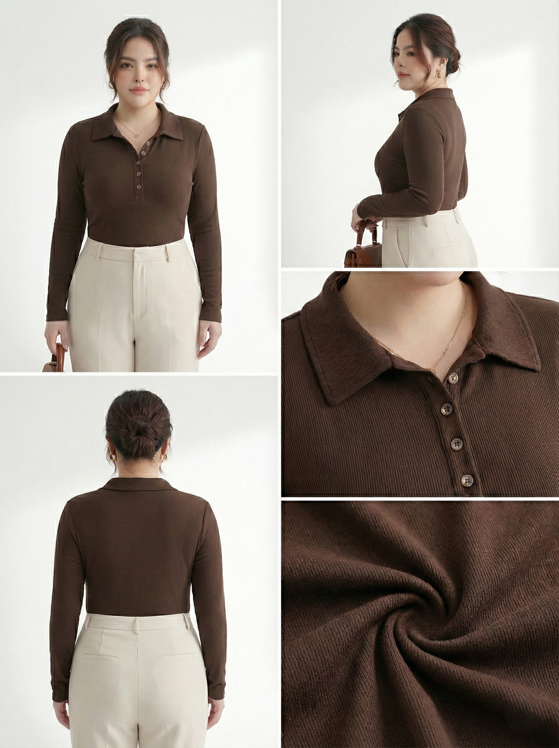 Kiểu dáng: Áo tay dài với cổ bẻ thanh lịch, điểm nhấn là hàng 6 nút cài tinh tế, phù hợp mặc đi làm, đi chơi hay ở nhà.