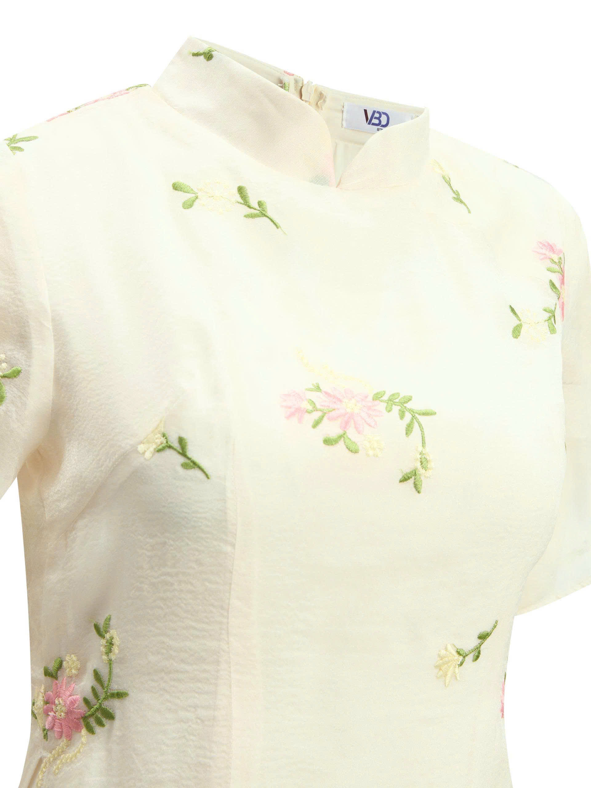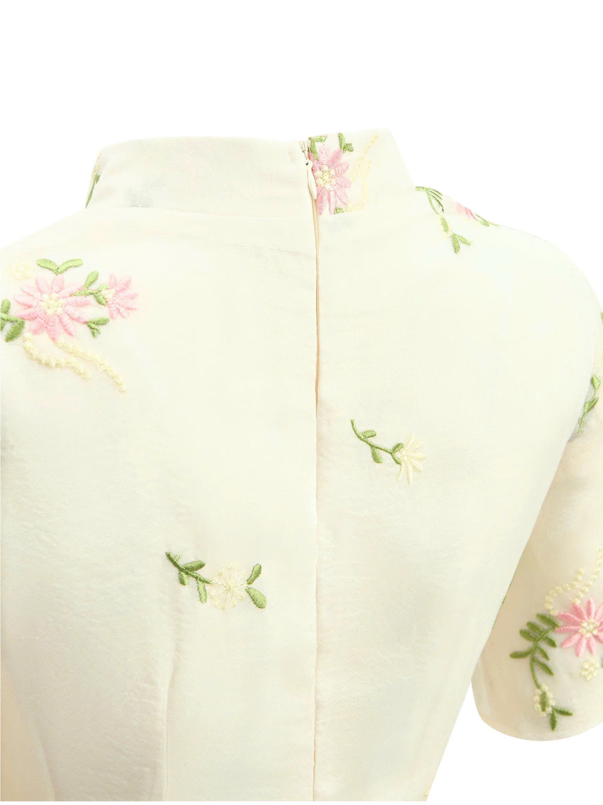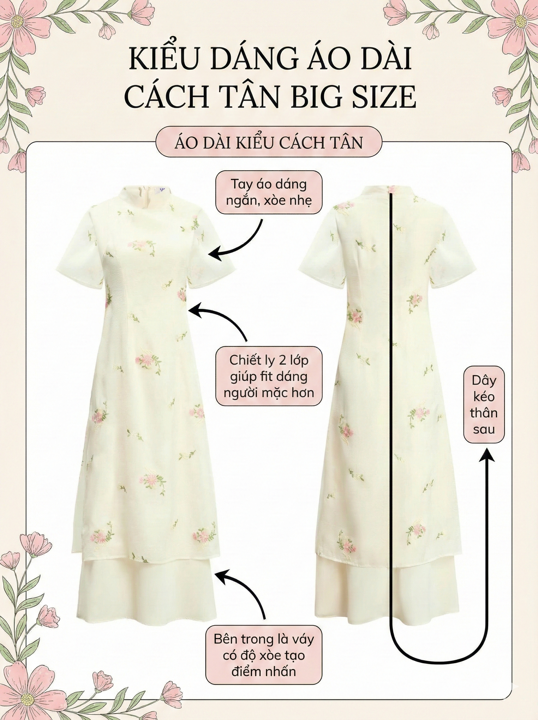 - Kiểu dáng : áo dài kiểu cách tân , tay áo dáng ngắn xòe nhẹ , chiết ly 2 lớp giúp fit dáng người mặc hơn , bên trong là váy có độ xòe tạo điểm nhấn , dây kéo thân sau .