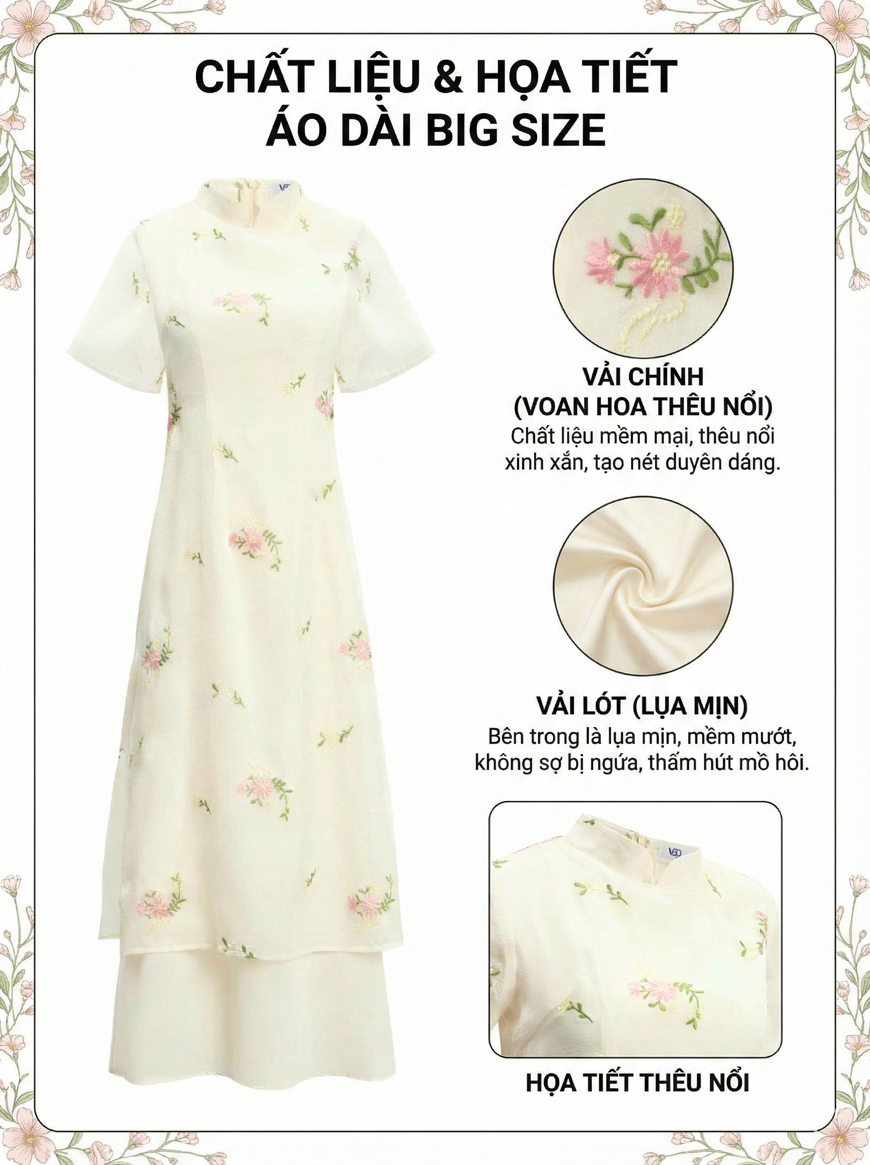 - Chất liệu : vải chính là voan hoa thêu nổi xinh xắn , chất liệu mềm mại , bên trong là lụa mịn , mềm mướt , không sợ bị ngứa , thấm hút mồ hôi .