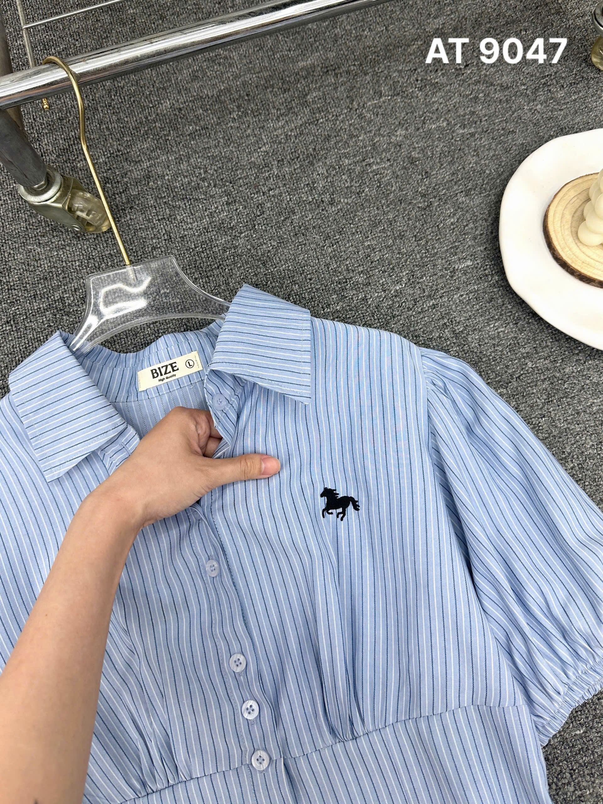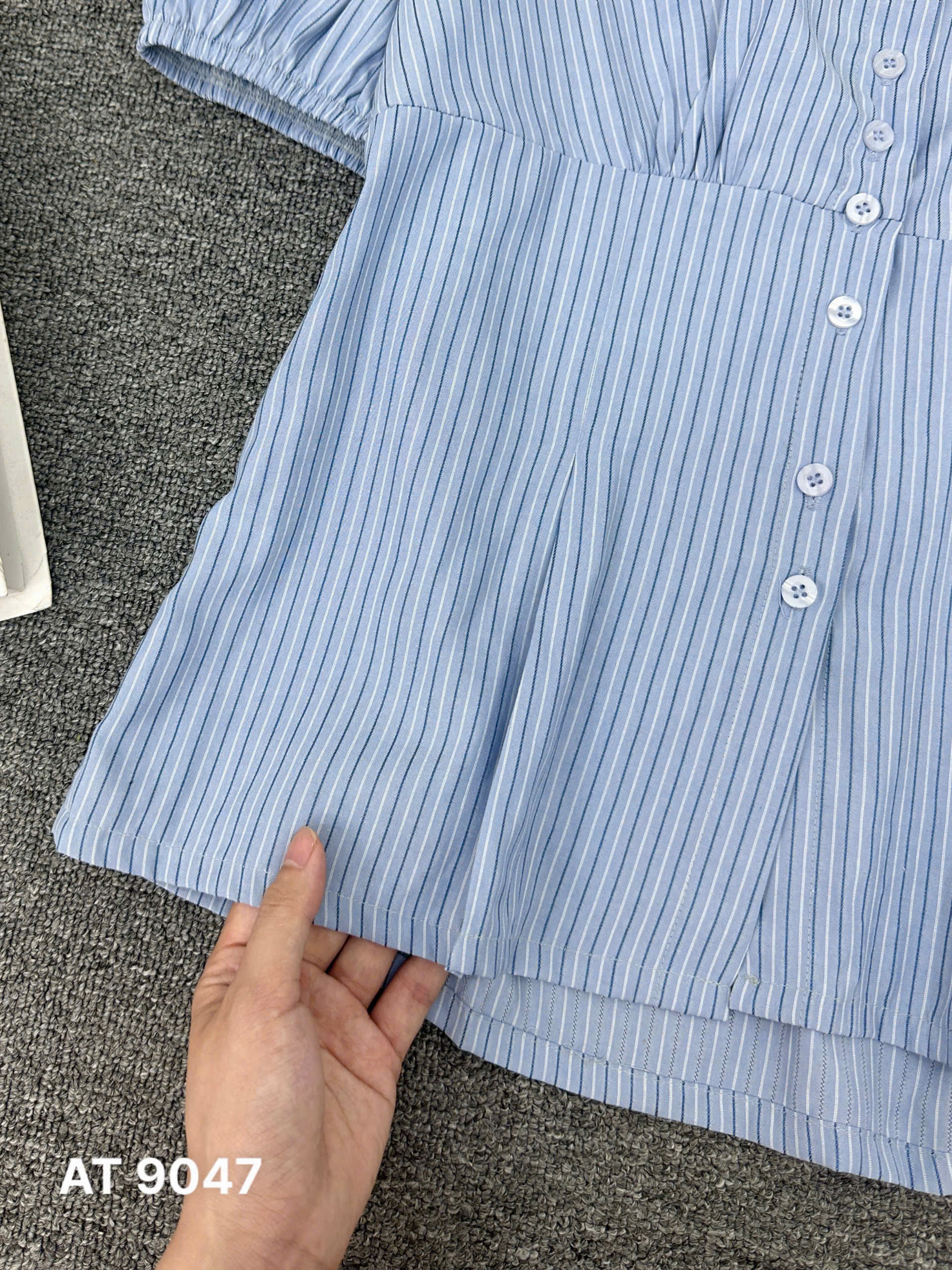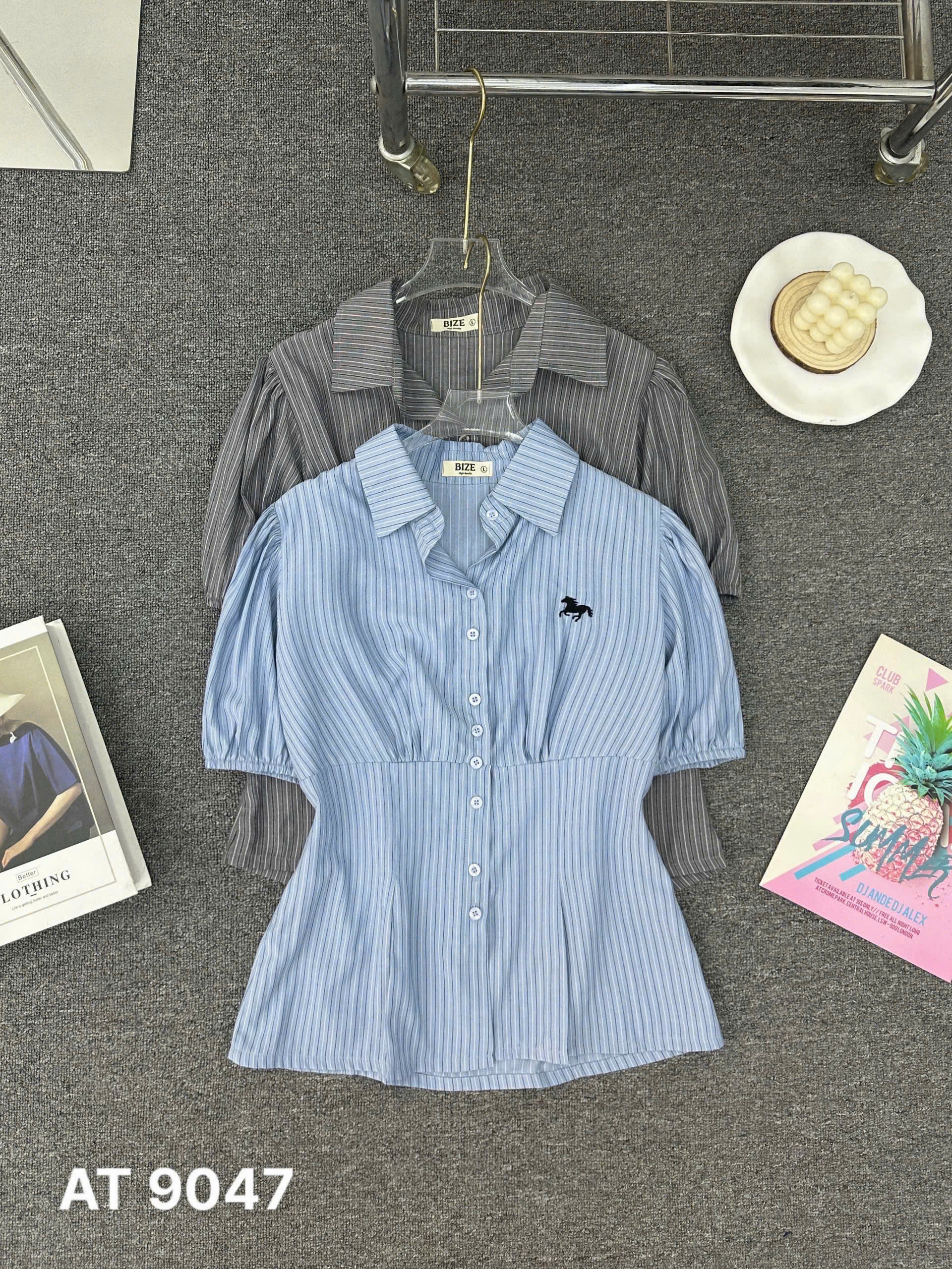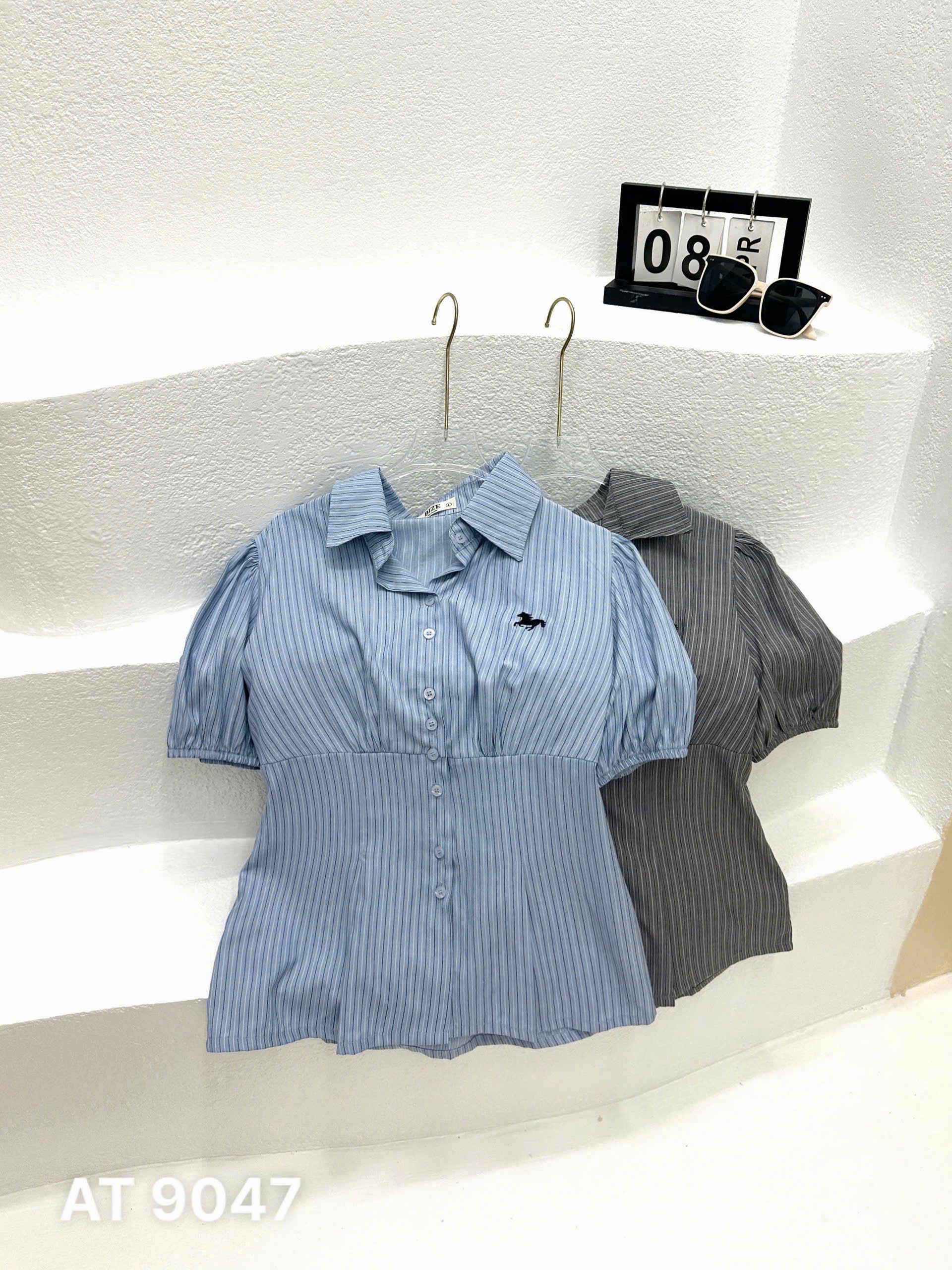 Kiểu dáng: Áo sơ mi cổ bẻ, tay ngắn phồng, chiết eo.