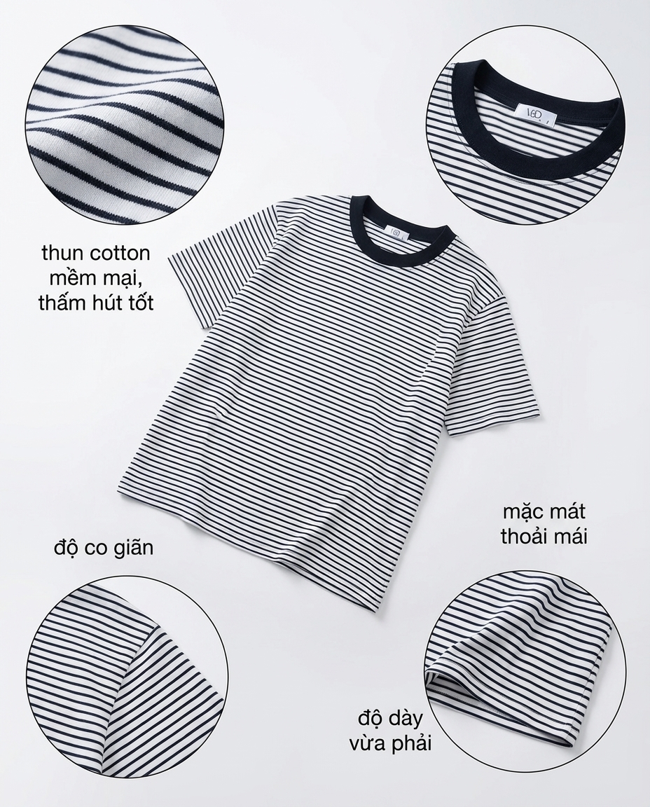 - Kiểu dáng : áo kiểu form rộng , sọc ngang kiểu , cổ tròn , có độ dài vừa phải , tay áo ngắn .