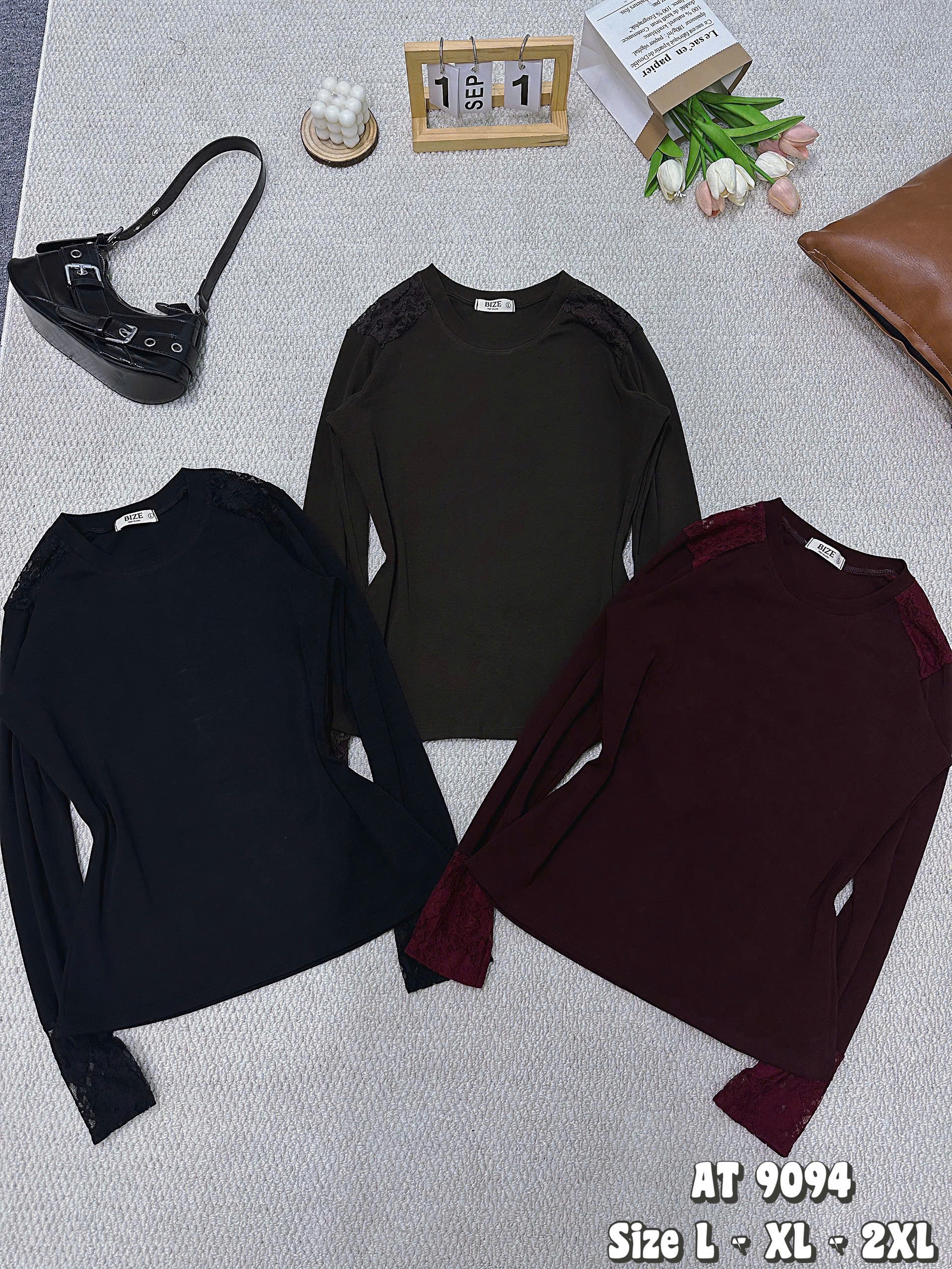 Kiểu dáng: Áo thun tay dài, cổ tròn, phối ren vai và tay.