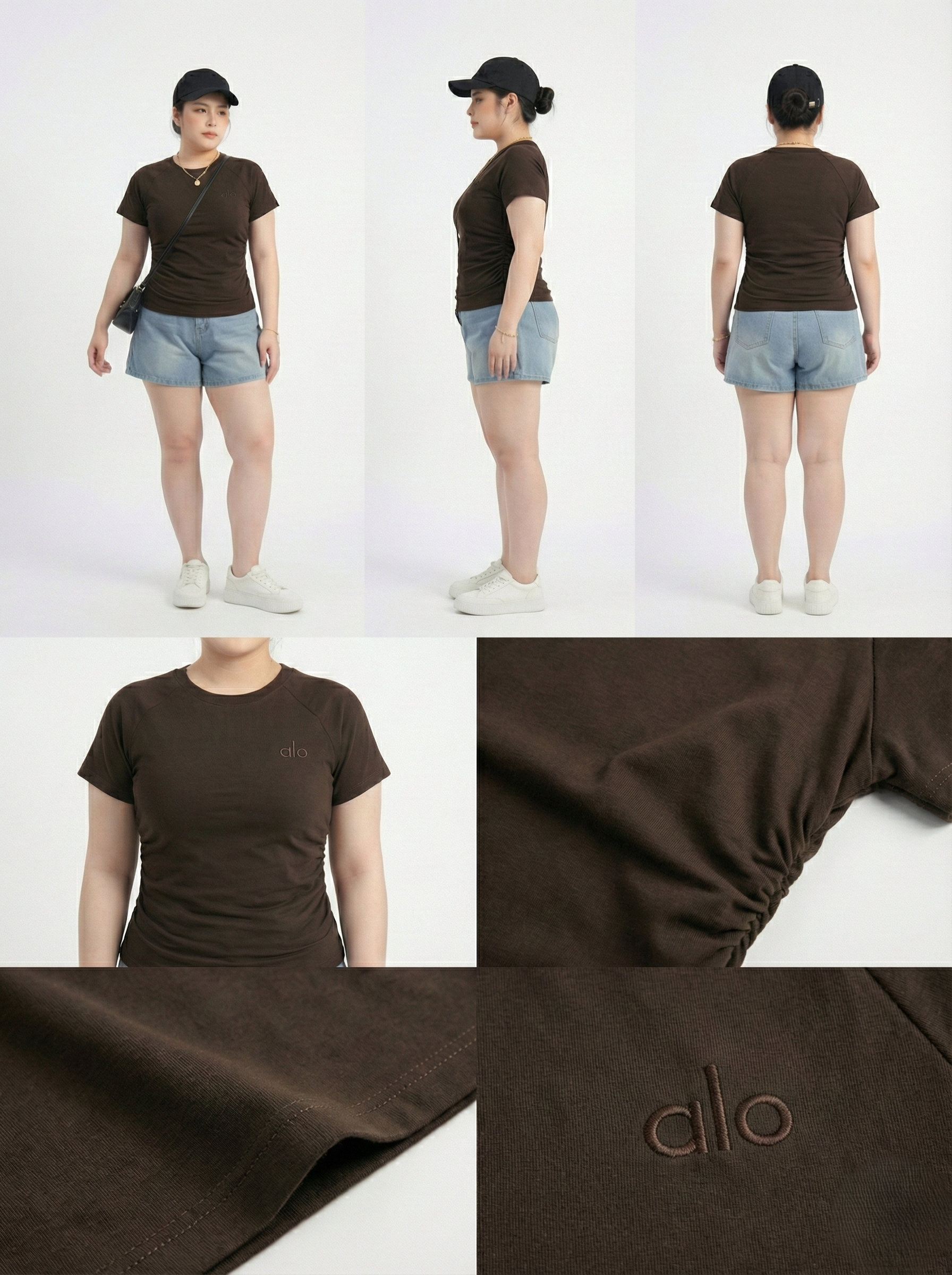 Kiểu dáng: Áo thun cổ tròn, tay ngắn Raglan, nhún sườn 2 bên.