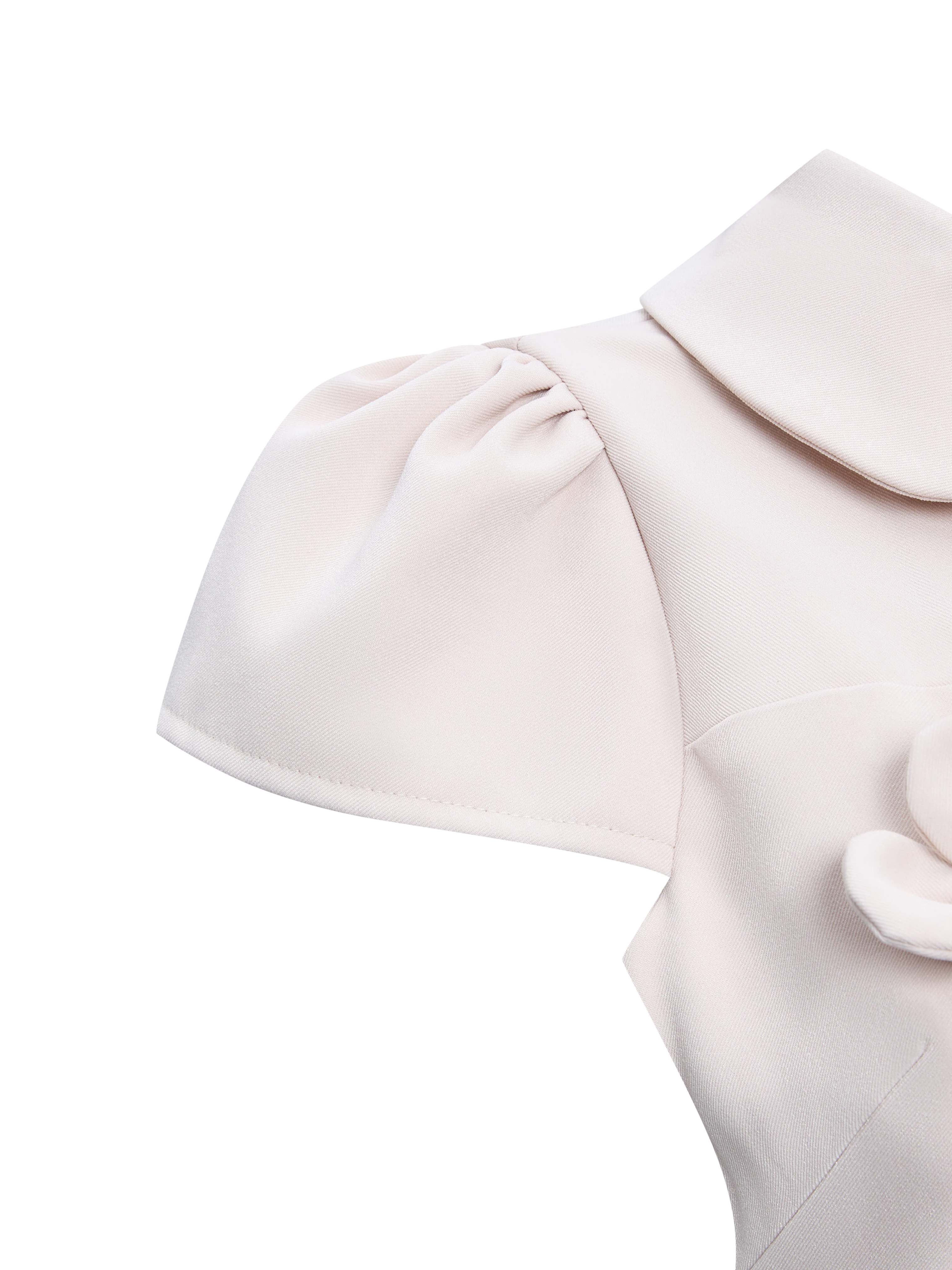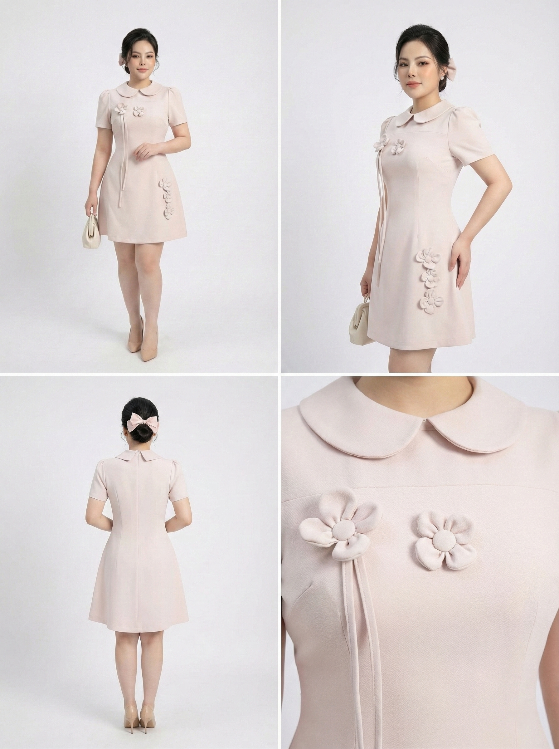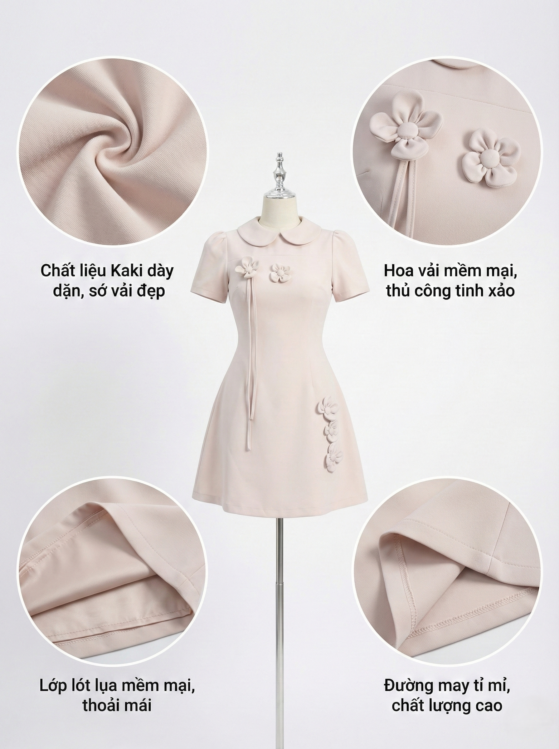 - Kiểu dáng : đầm 2 lớp , dáng ngắn , thiết kế rã mảnh giúp fit dáng người mặc , phần trên kiểu cổ tròn có cổ siêu xinh , tay nhún kiểu trên vai , dây kéo đầm thân sau , trên đầm đính hoa kiểu tạo điểm nhấn .