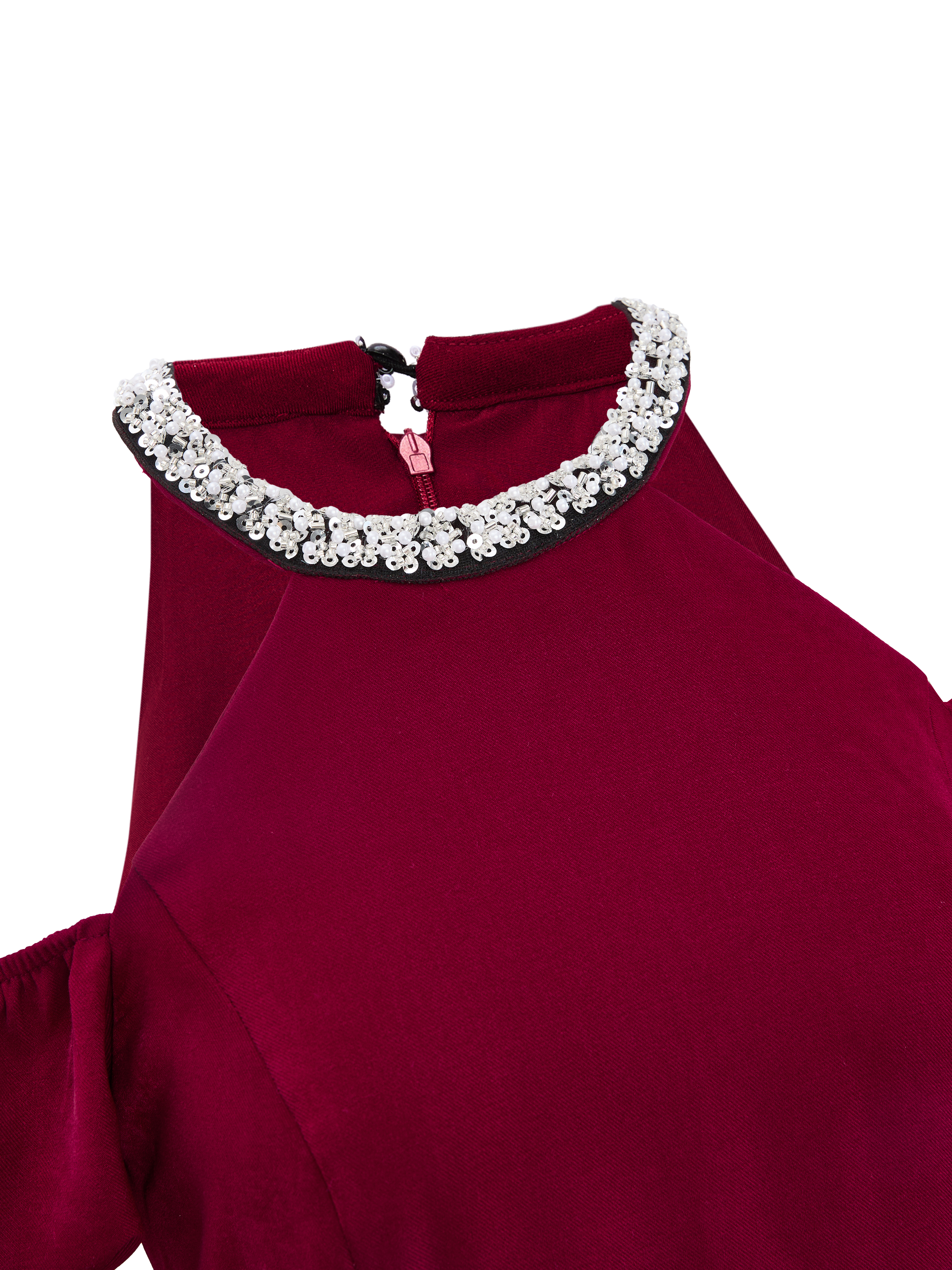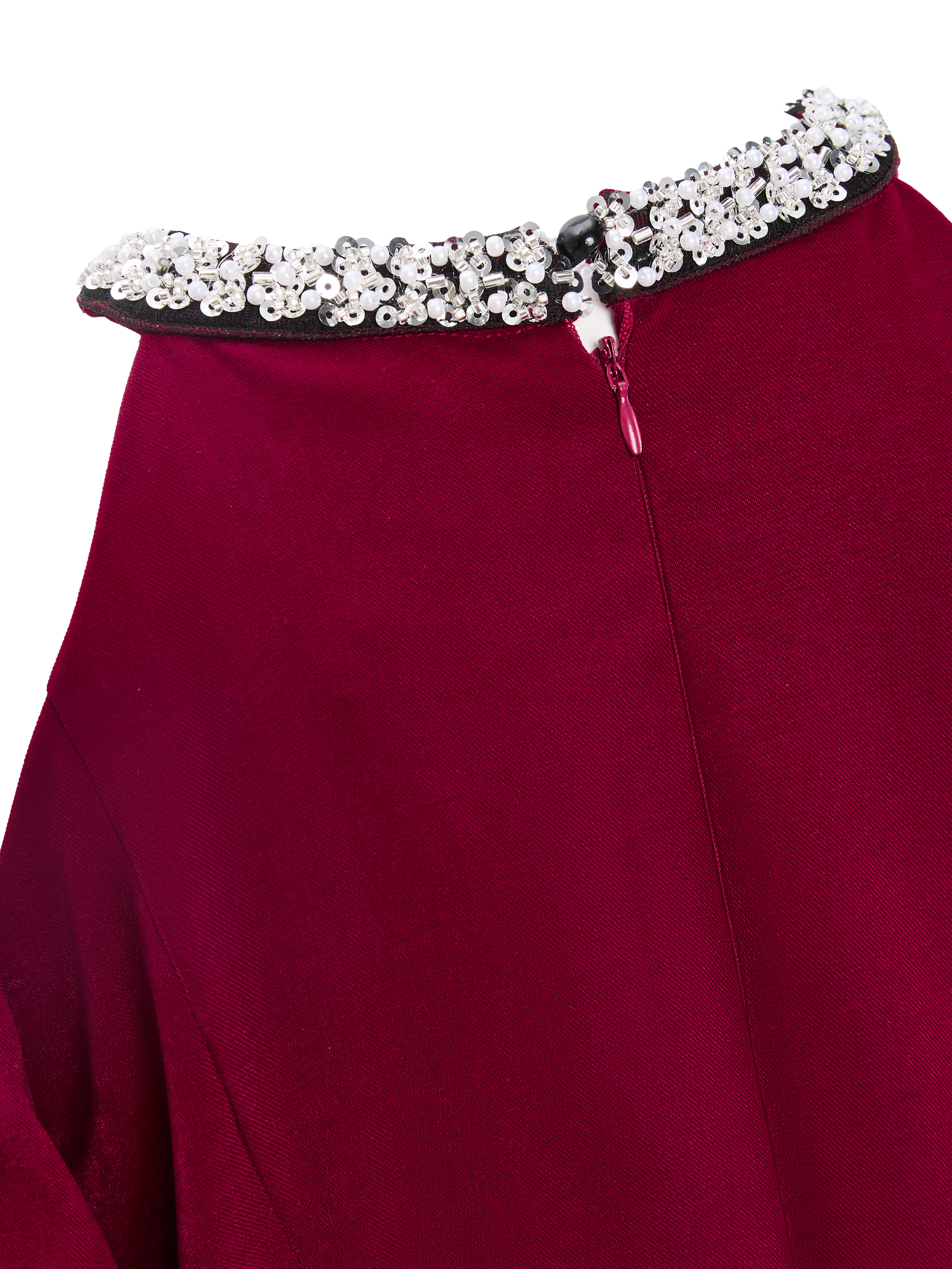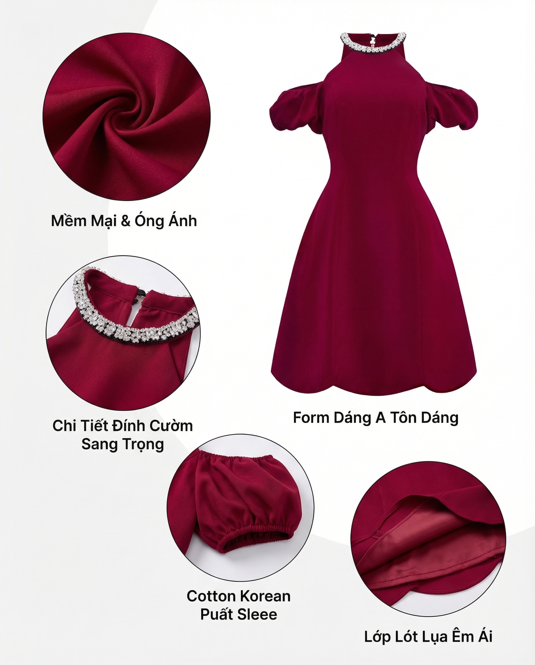 - Kiểu dáng : đầm dáng A , có 2 lớp , đầm thiết kế rã mảnh thân trước và sau giúp fit dáng người mặc , cổ trồn phối cườm đính làm điểm nhấn , tay áo mặc kiểu trễ vai hoặc trên vai tùy ý có phần bo chun tạo độ ôm, tùng váy kiểu đánh cong tạo kiểu , dây kéo thân sau .