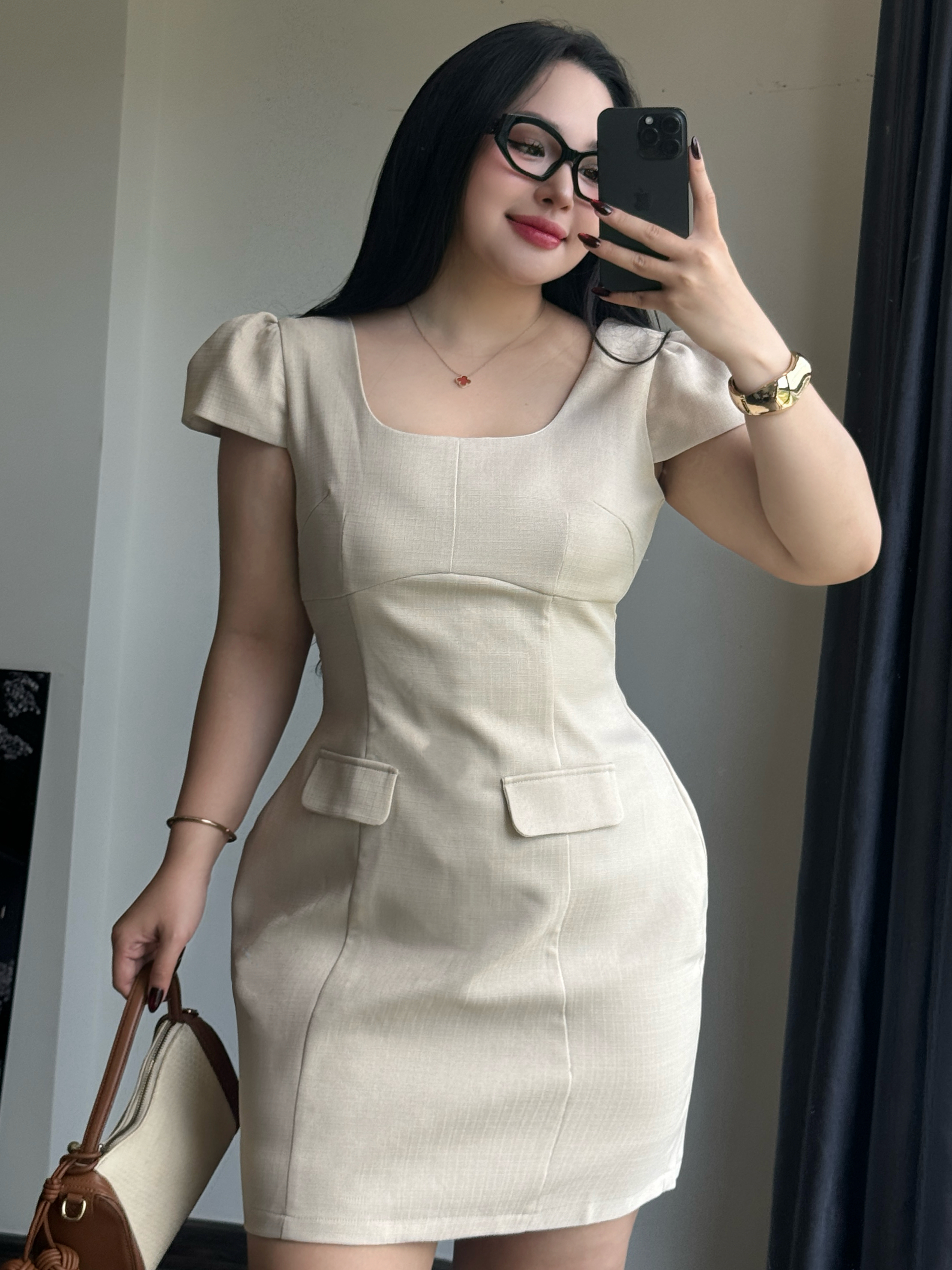 - Kiểu dáng : đầm 2 lớp , dáng ngắn , đầm cổ vuông , thiết kế rã mảnh thân trước giúp fit dáng người mặc hơn , thân sau chiết ly kiểu , đầm phần hông đánh cong tạo điểm nhấn , phần tay ngắn phồng kiểu mới .