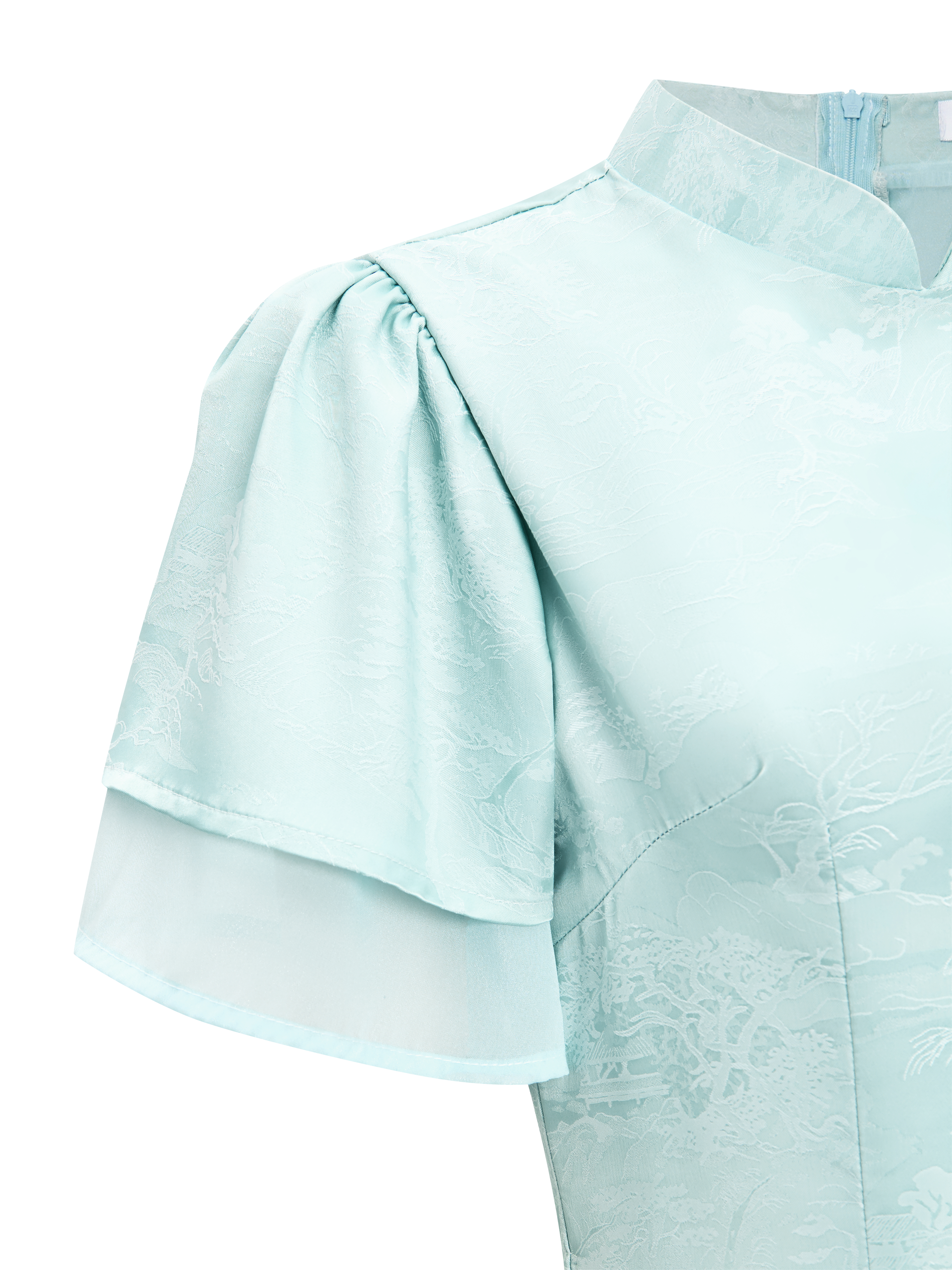 + Áo : áo dài 2 lớp , bên ngoài là lớp lụa bên trong là lớp tơ ánh kim , tay áo 2 tầng xoè nhẹ và nhún kiểu trên vai , thiết kế có pen giúp fit dáng người mặc , dây kéo sau .