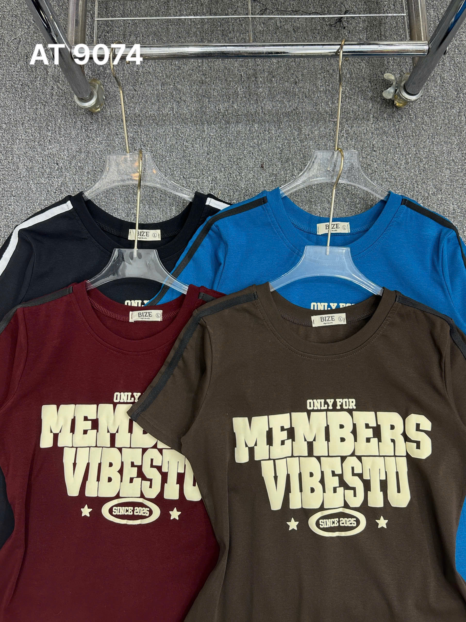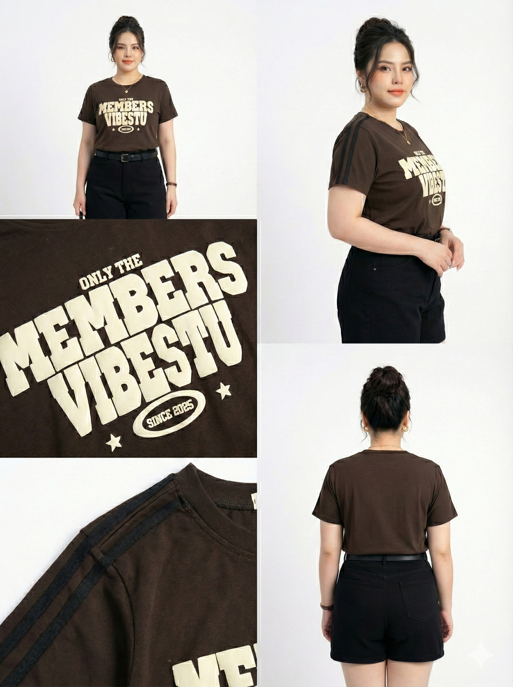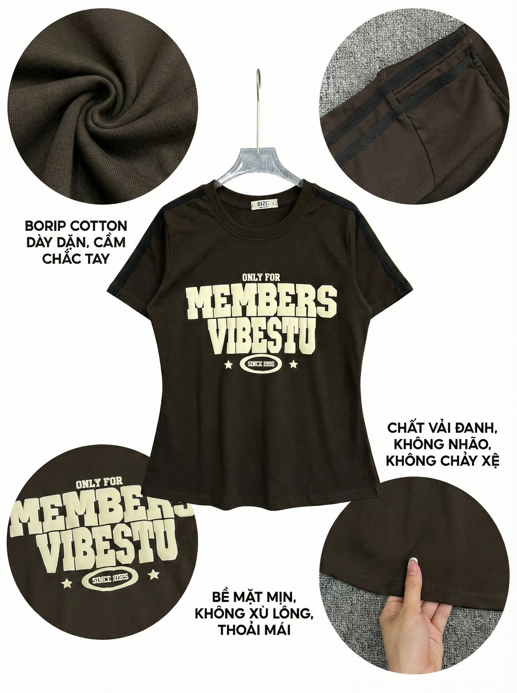 Hình in lụa cao cấp: Dòng chữ "MEMBERS VIBESTU" được in lụa sắc nét, bền màu, cam kết không bong tróc hay dính vào nhau khi giặt.