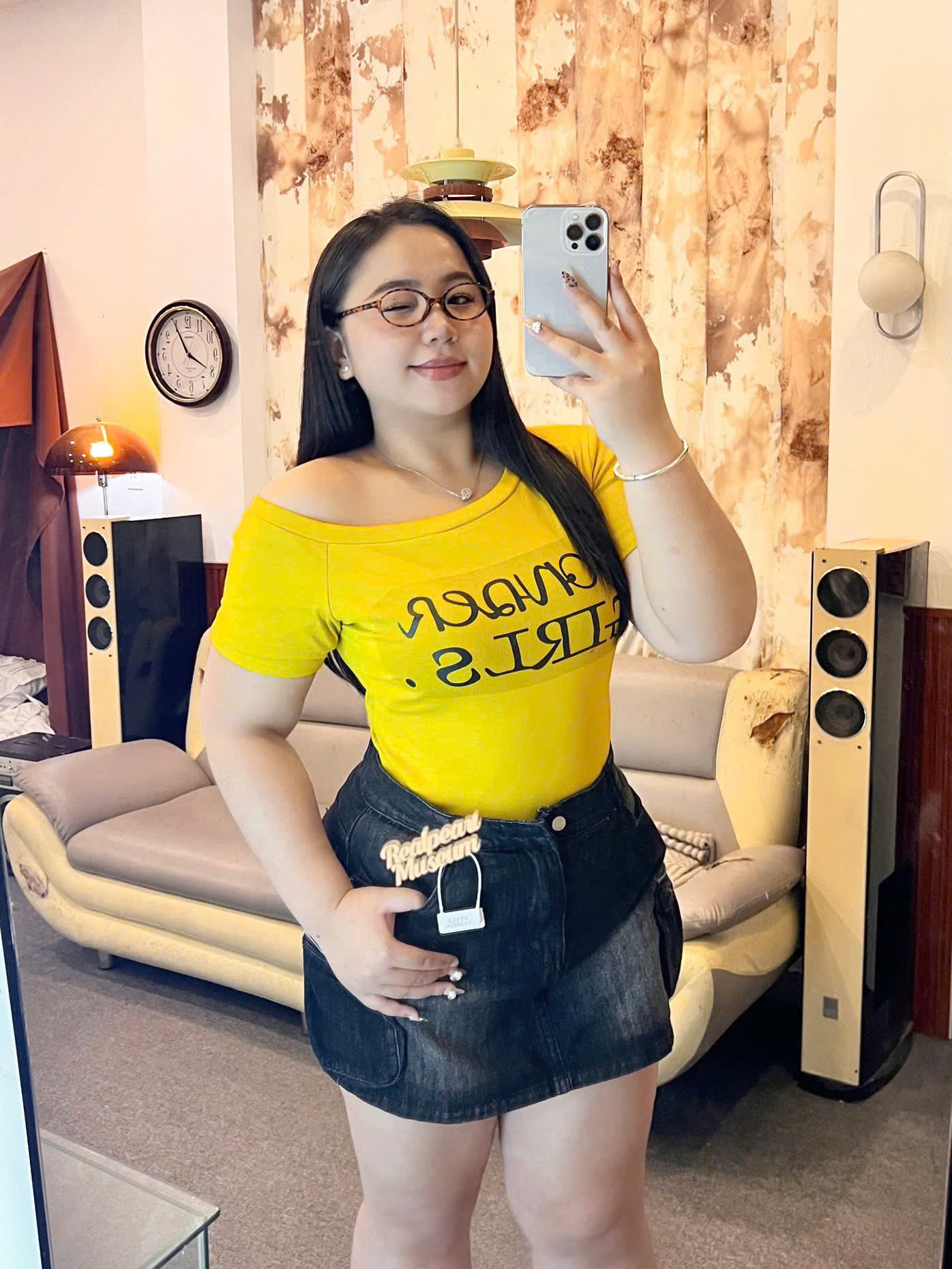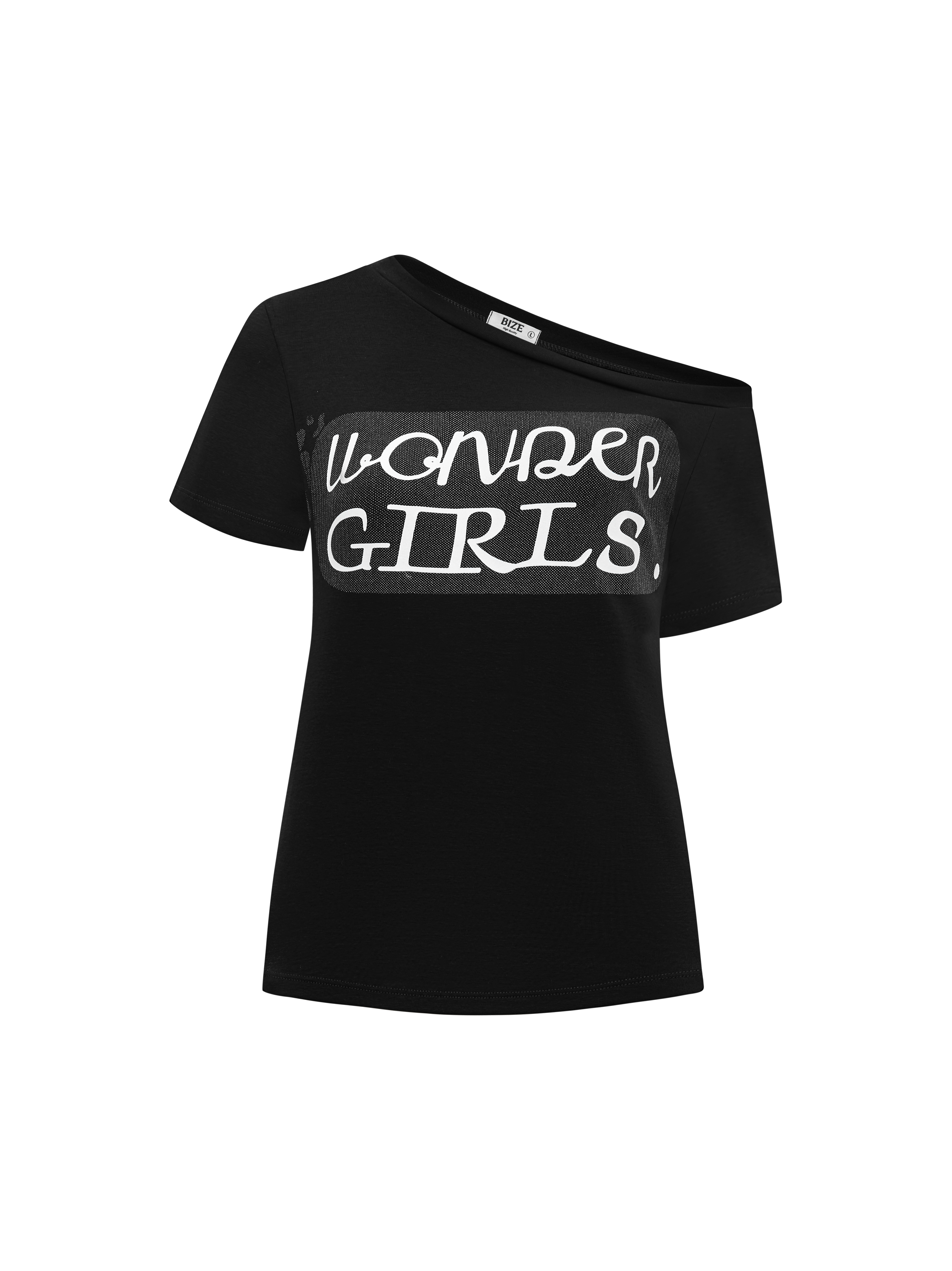 - Kiểu dáng : form vừa ôm , áo kiểu lệch vai 1 bên tạo kiểu , vạt áo bầu tạo điểm nhấn , thân trước in chữ .