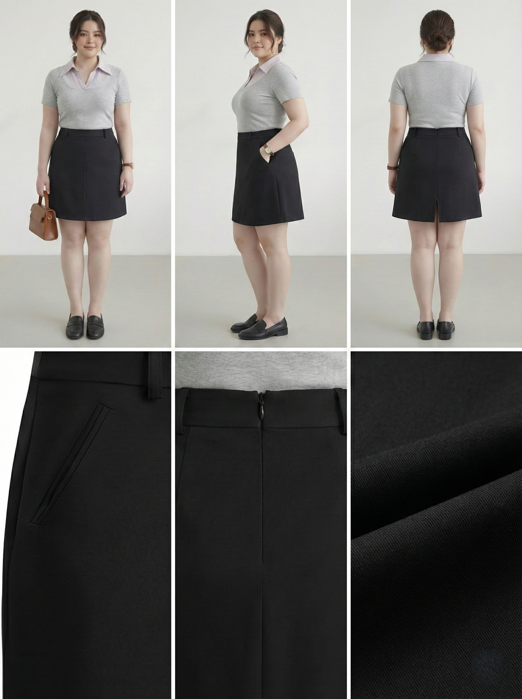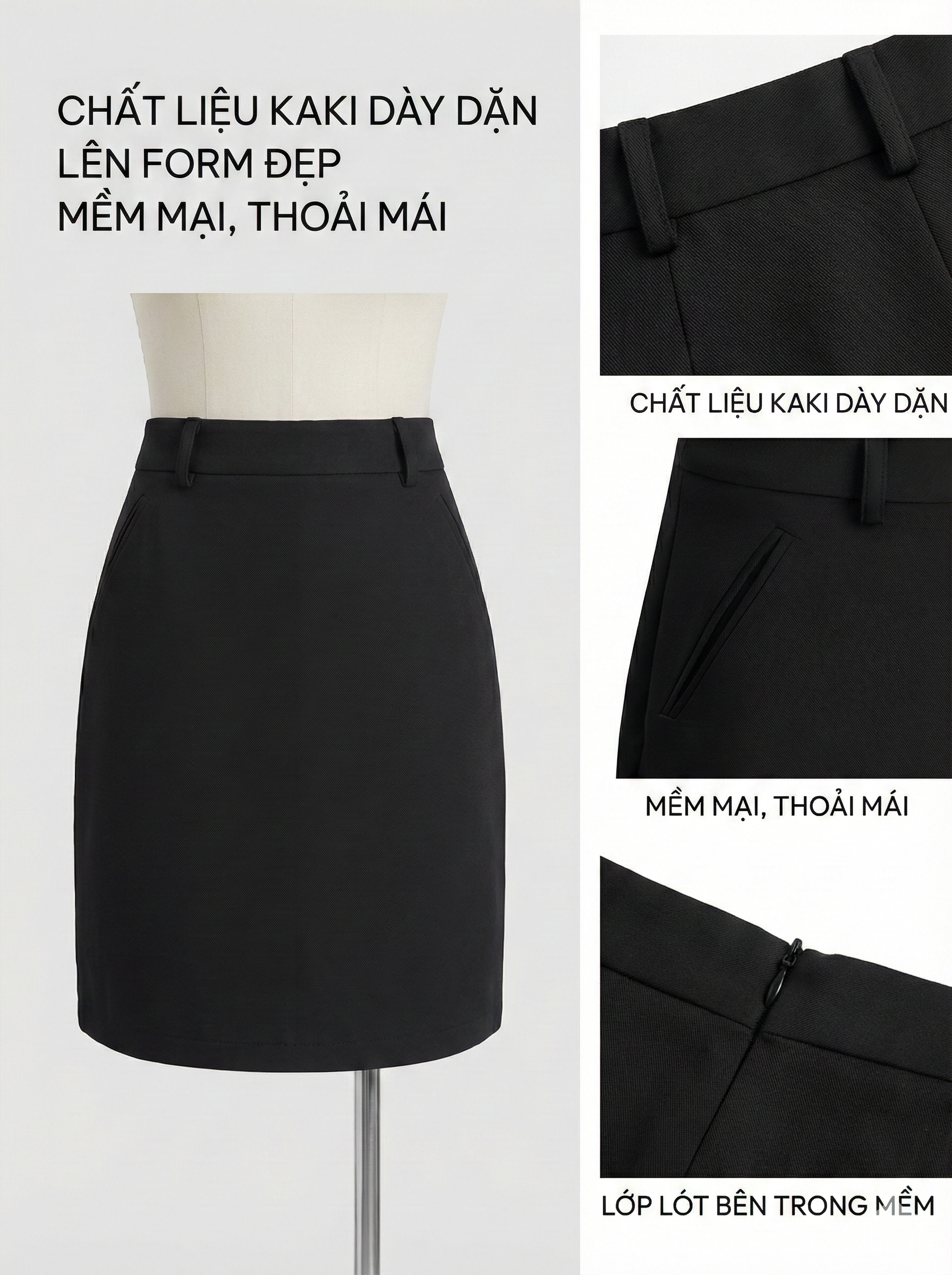 - Kiểu dáng : chân váy 2 lớp , dáng A , lưng cao , phía sau có khóa kéo , phần lai có phần xẻ tà giúp người mặc thoải mái , có túi thân trước .