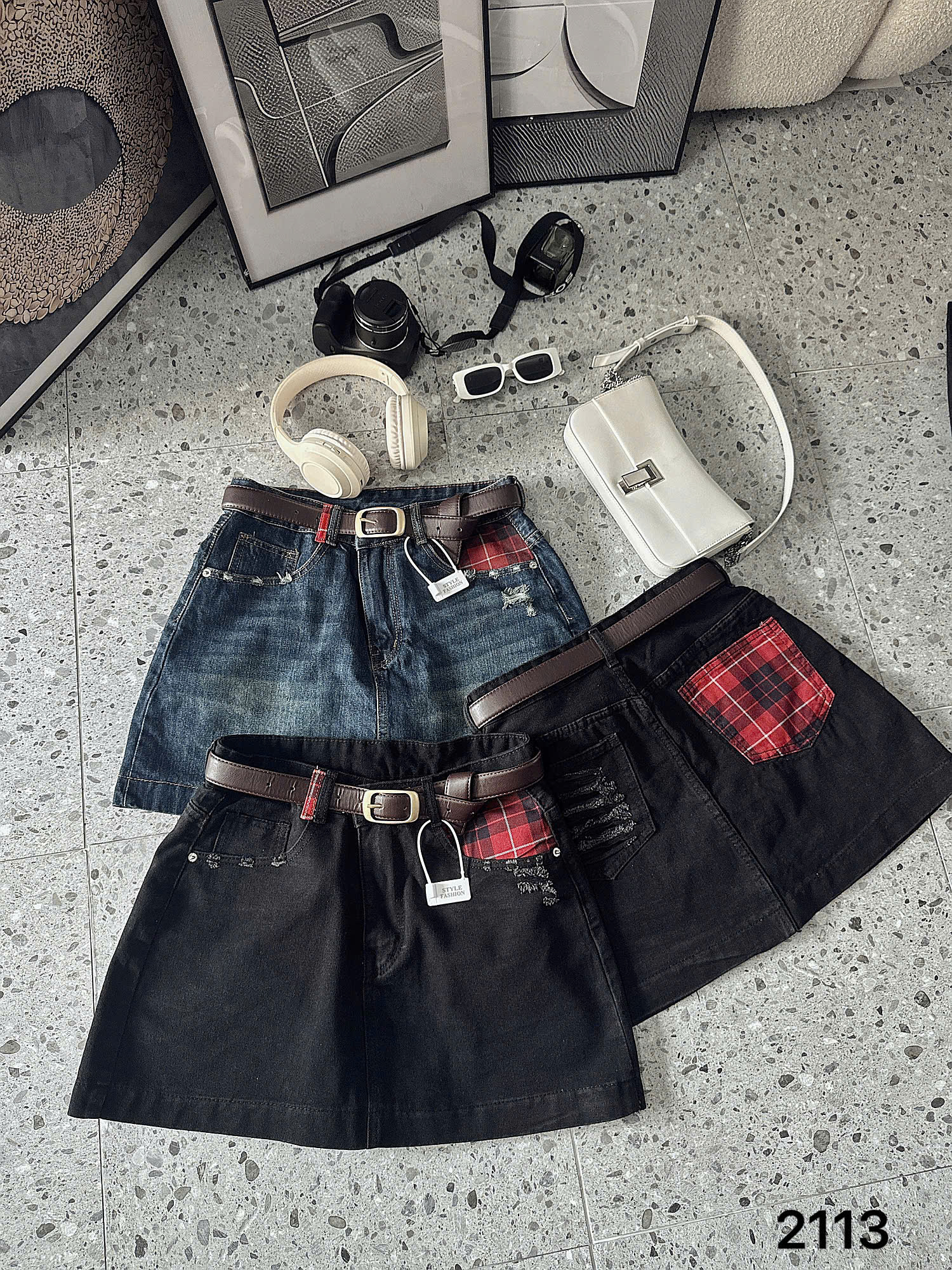 Điểm nổi bật: Phối túi caro đỏ, rách xước, lưng siêu cao.