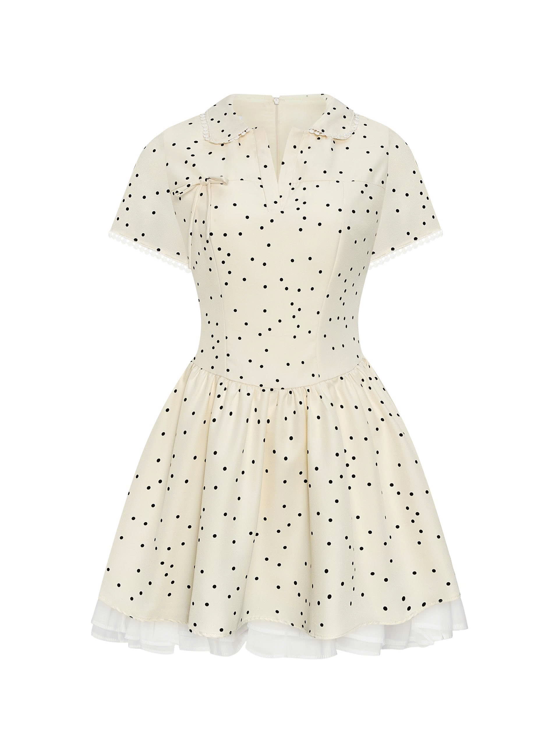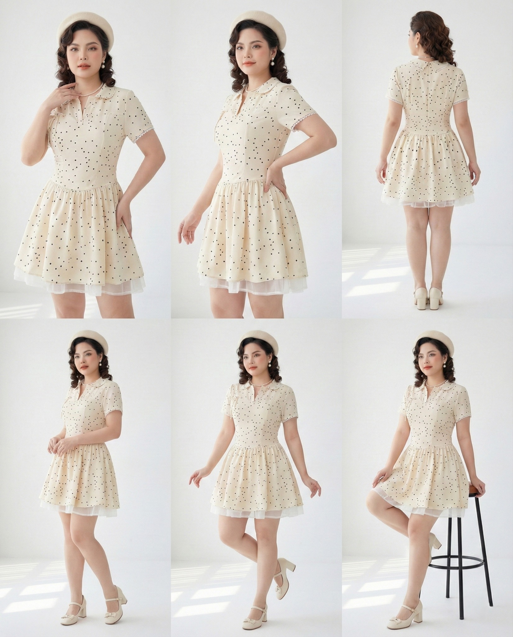 - Kiểu dáng : đầm dáng ngắn 2 lớp , họa tiết chấm bi , thân trên rã mảnh giúp fit dáng người mặc hơn , cổ kiểu cổ trụ phối phần cổ tròn có ren kèm theo tạo điểm nhấn , tay áo ngắn phối ren , phần tùng nhún tạo phồng , bên dưới tùng phối 2 tần voan kiểu .