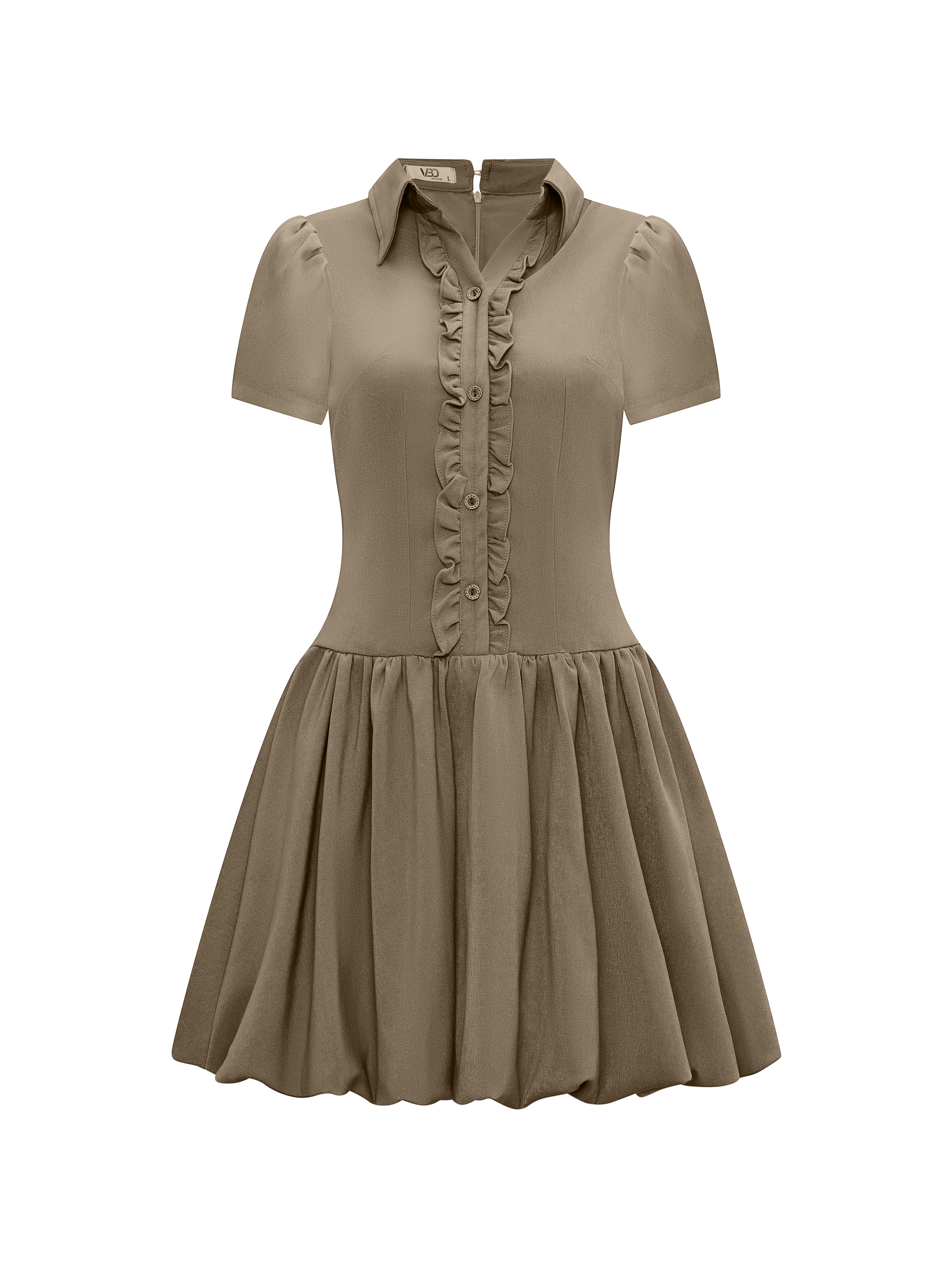 - Kiểu dáng : đầm dáng A , có 2 lớp , đầm thiết kế rã mảnh thân trước và sau giúp fit dáng người mặc , cổ kiểu sơ mi có nẹp kiểu đính nút gỗ xinh xắn , tay áo ngắn nhún nhẹ phần vai , tùng bí tạo phồng , dây kéo thân sau .