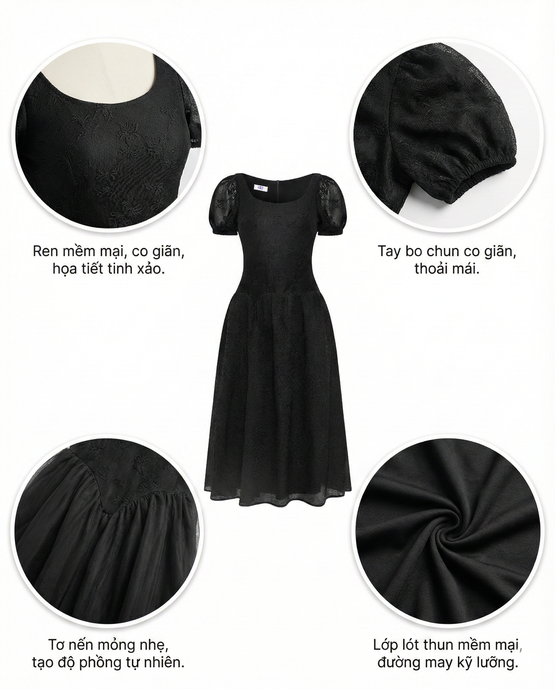 - Kiểu dáng : đầm dáng dài 2 lớp , thiết kế cổ bầu nhẹ , phần trên là ren co giãn ôm giúp fit dáng , phần tùng đánh cong kiểu kèm nhún tạo độ phồng , tay đầm ngắn có bo chun ở tay giúp người mặc thoải mái hơn .