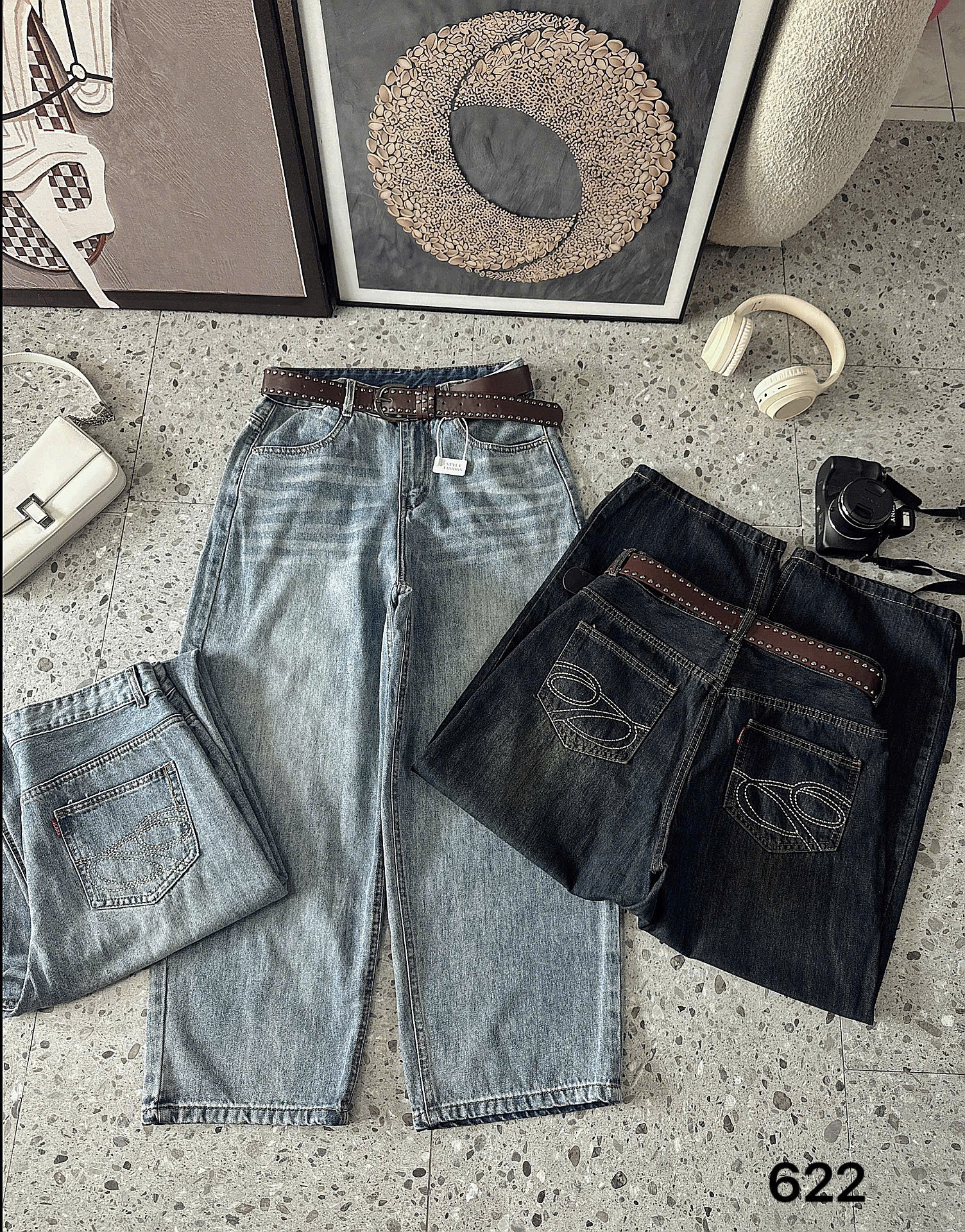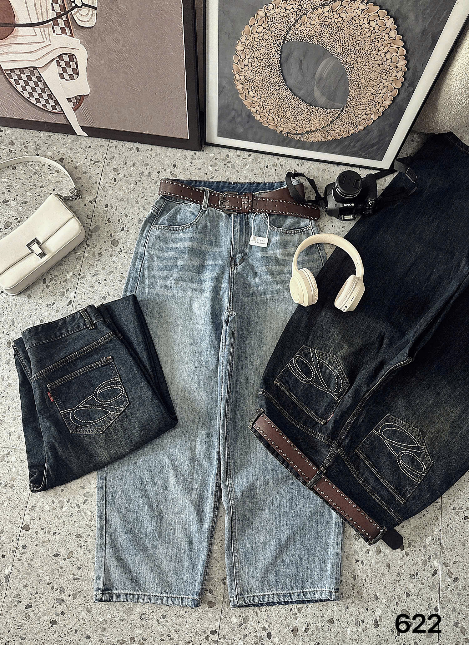 Điểm nhấn tinh tế: Đường chỉ thêu nghệ thuật ở túi sau kết hợp cùng phụ kiện thắt đai đính tán (tặng kèm tùy đợt) tạo nên nét bụi bặm, cá tính và vô cùng thời thượng.