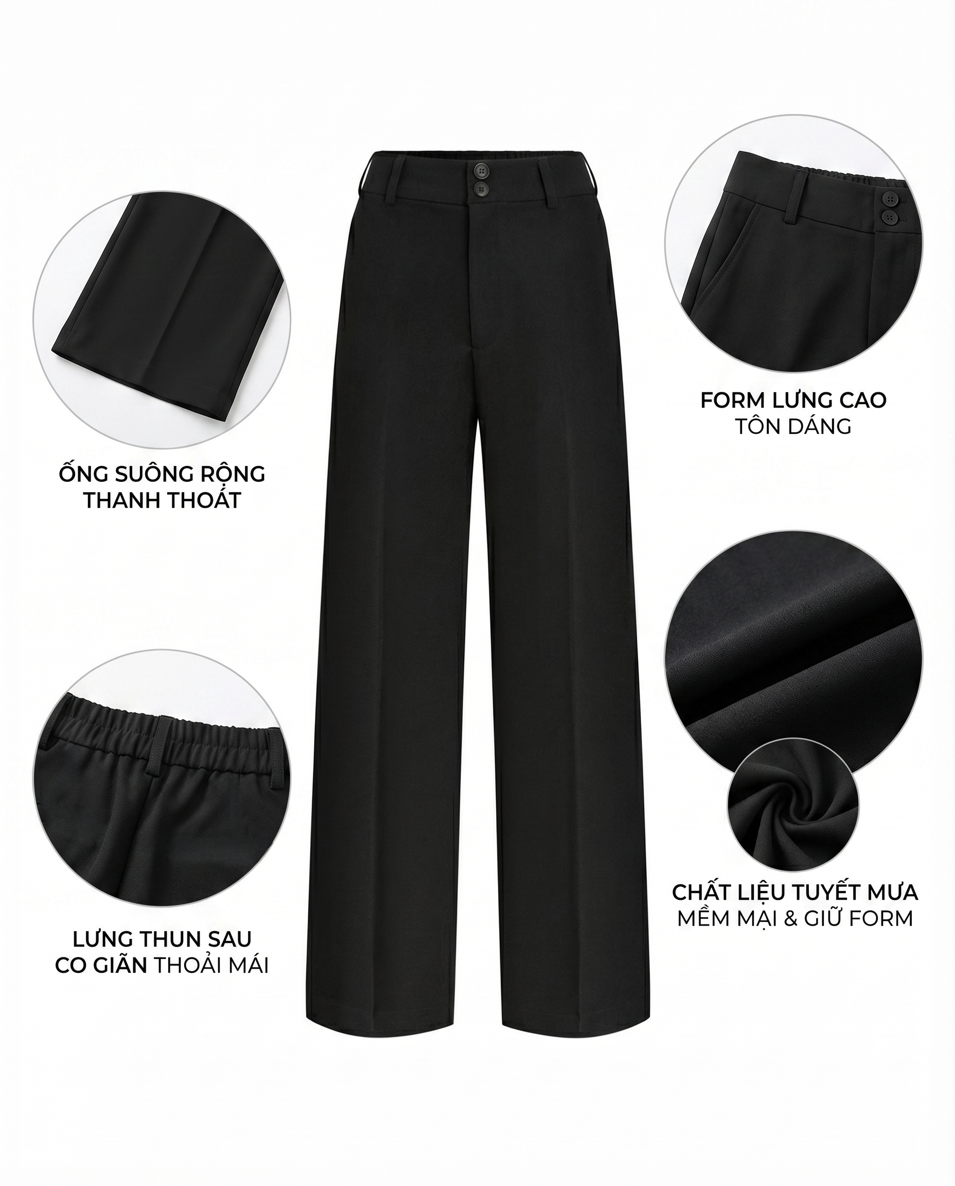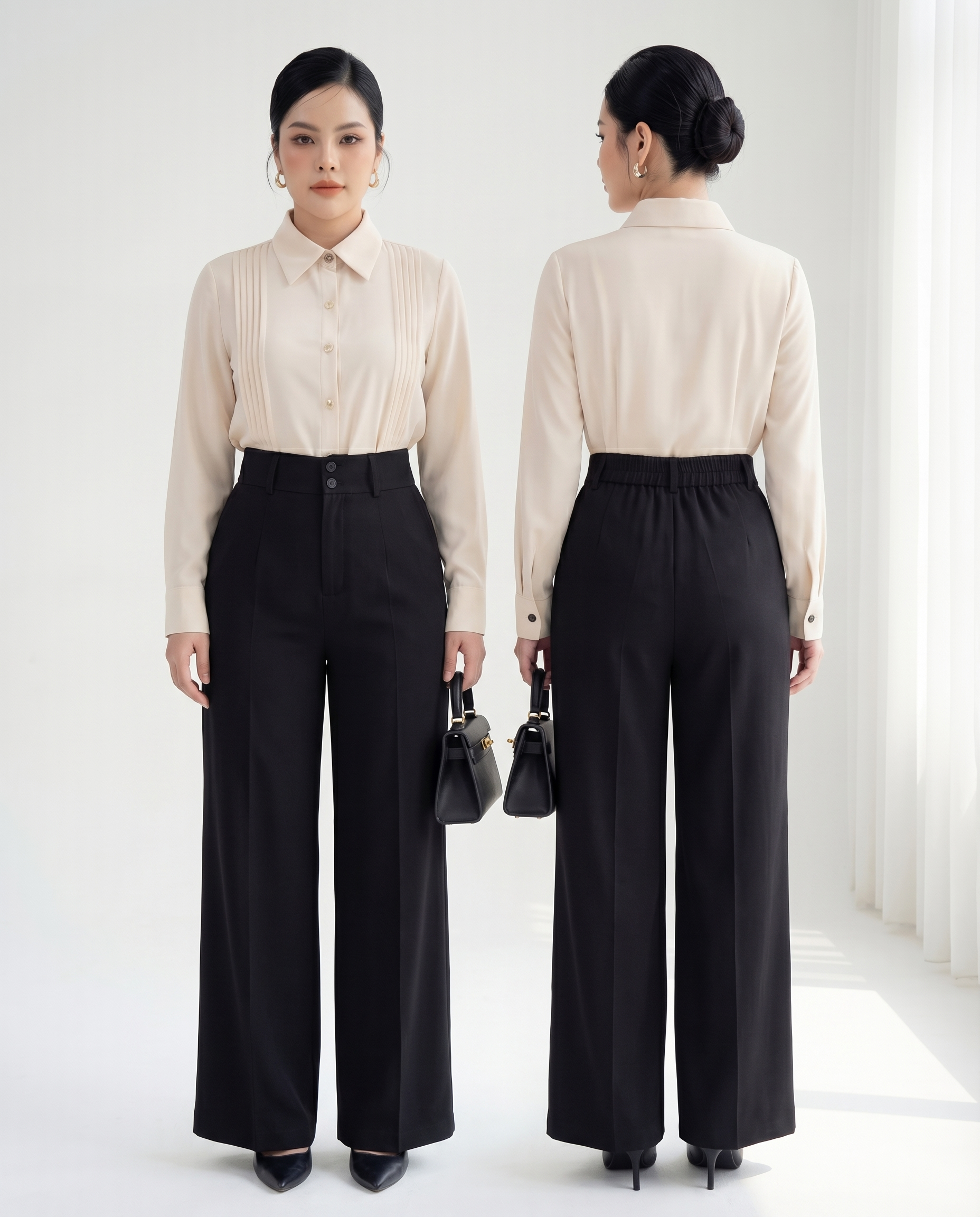Ống suông rộng thời thượng: Dáng quần suông thẳng từ hông xuống gấu khéo léo che đi khuyết điểm đùi và bắp chân to, tạo nên một tổng thể thanh thoát, sang trọng.