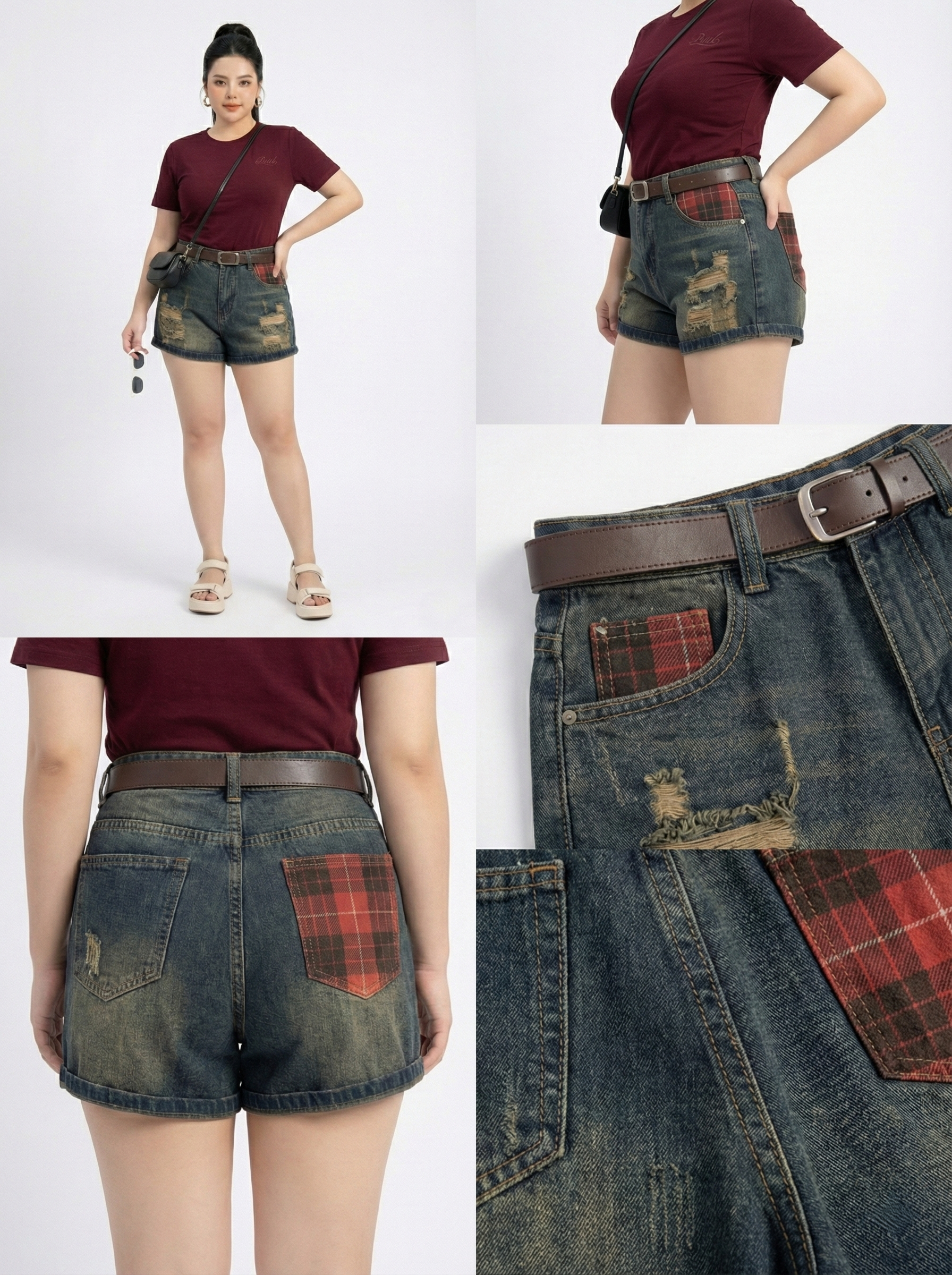 Điểm nổi bật: Wash màu bụi (màu dơ), phối túi/viền Caro đỏ mận.