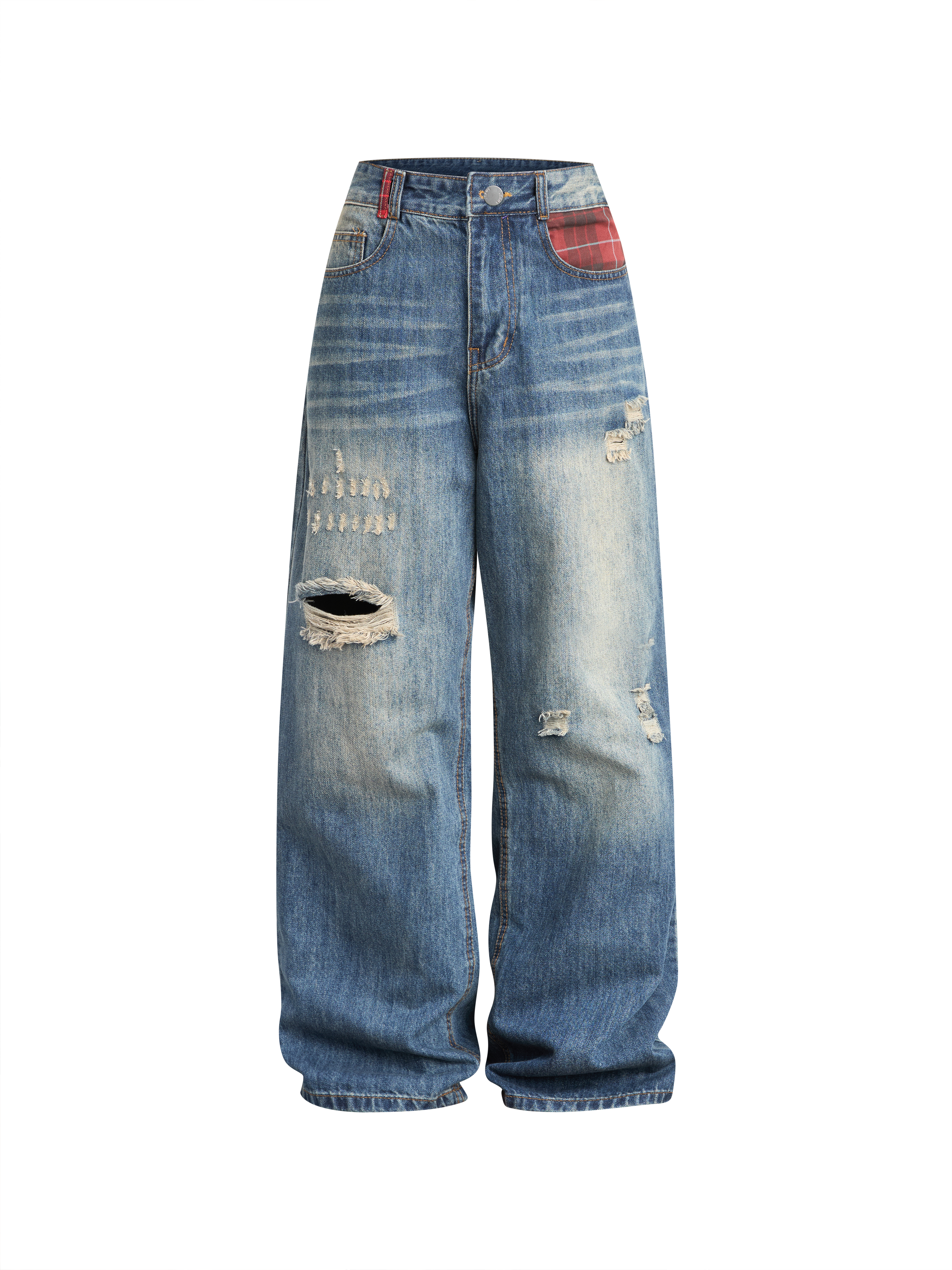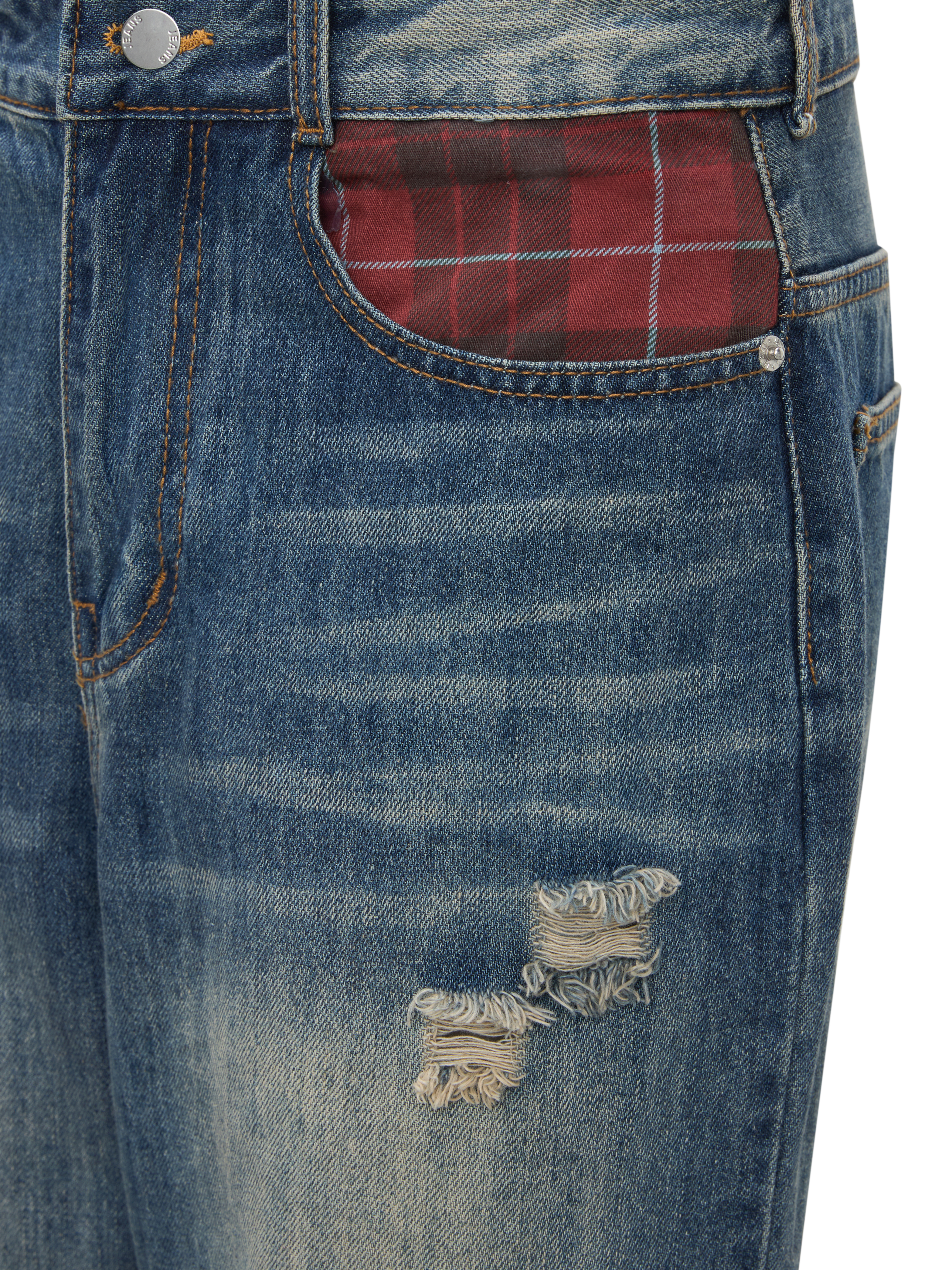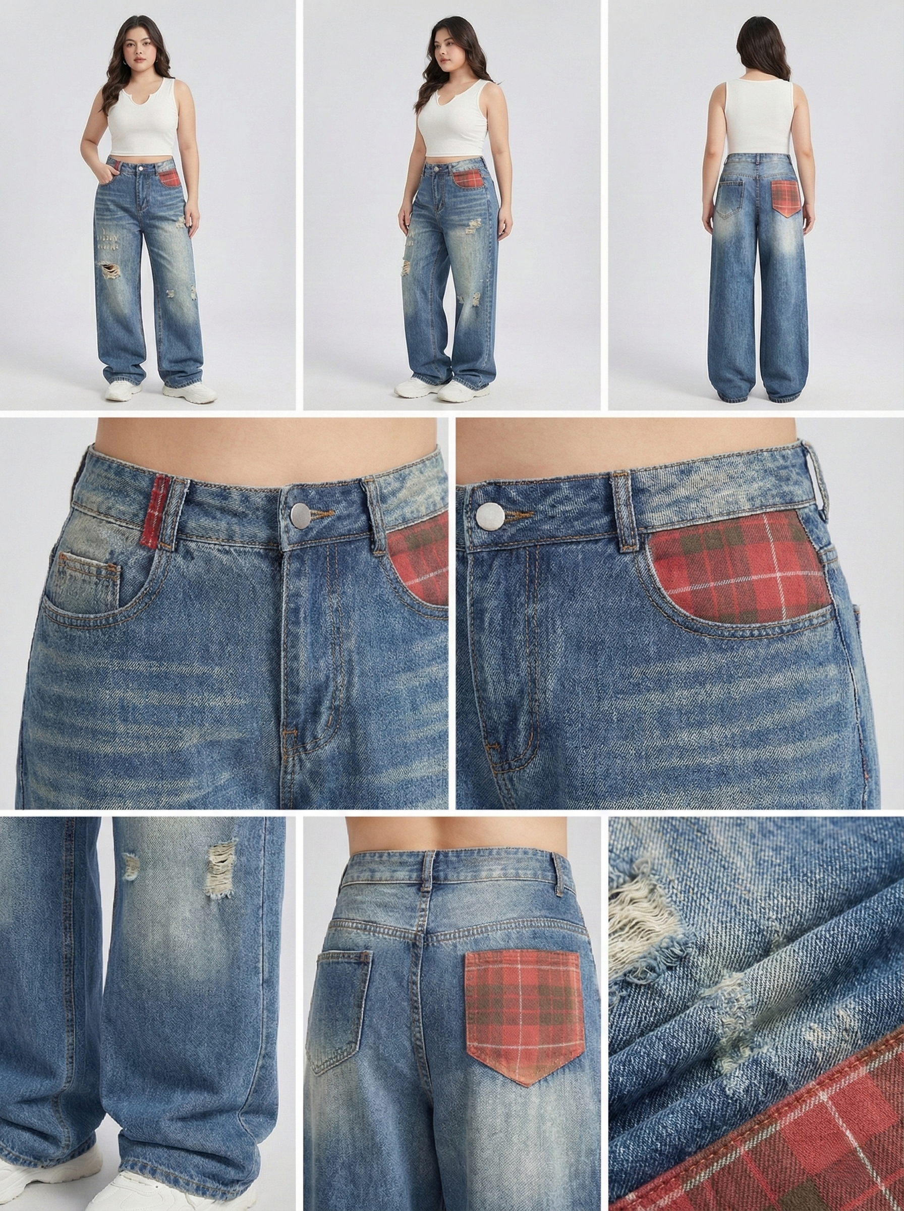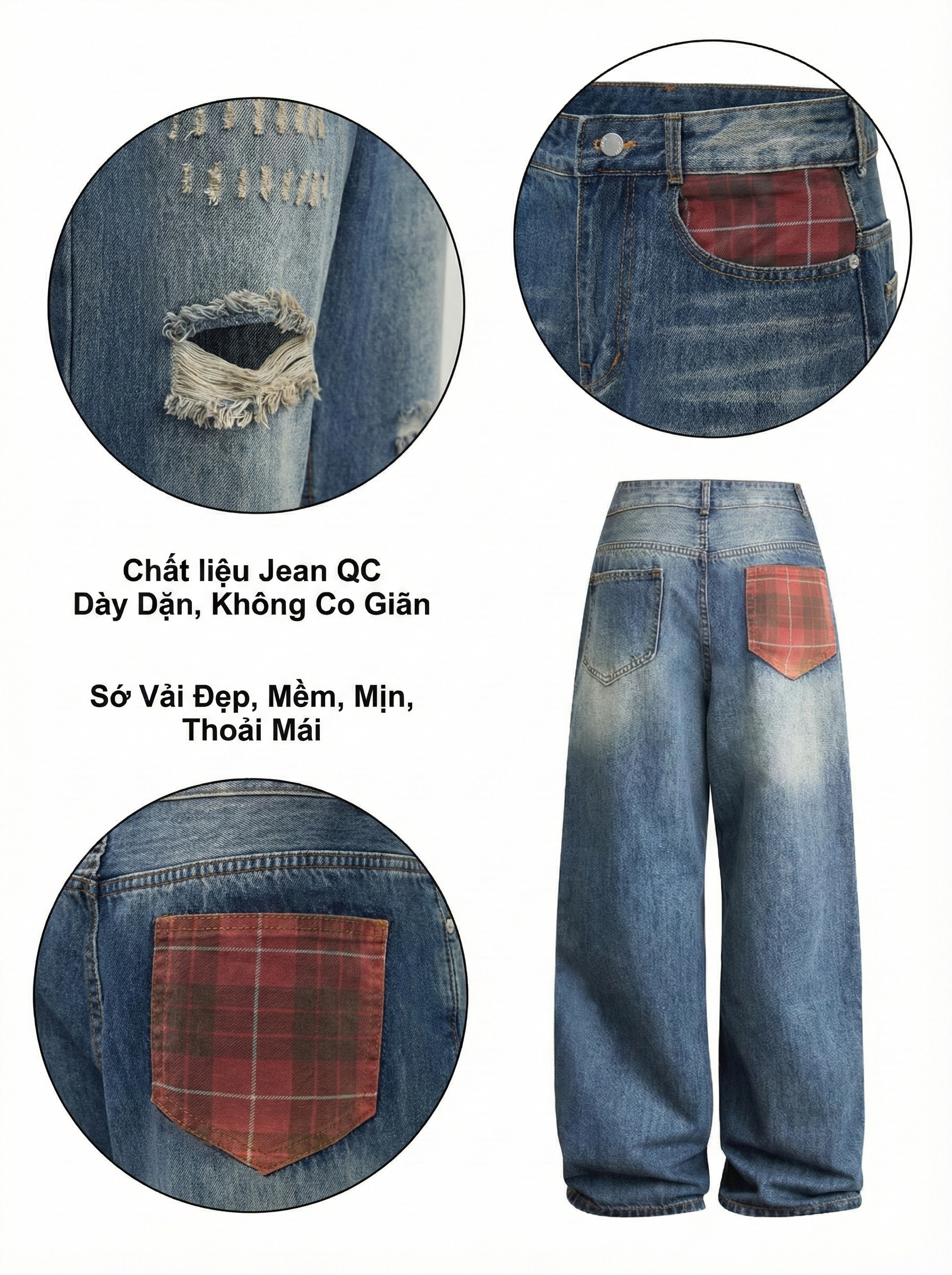 - Kiểu dáng : quần jean ống suông lưng cao , form basic , có túi thật trước và sau , lưng cao giúp hack dáng che bụng mỡ , quần rách nhẹ thân trước , túi trước và sau phối caro đỏ siêu xinh xắn .