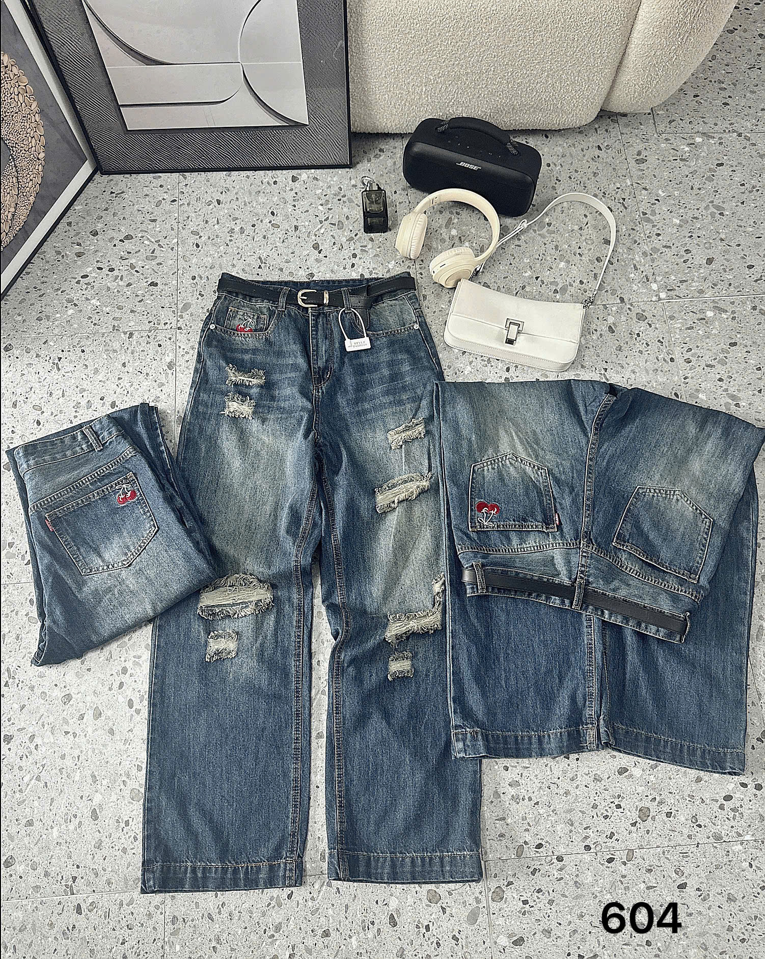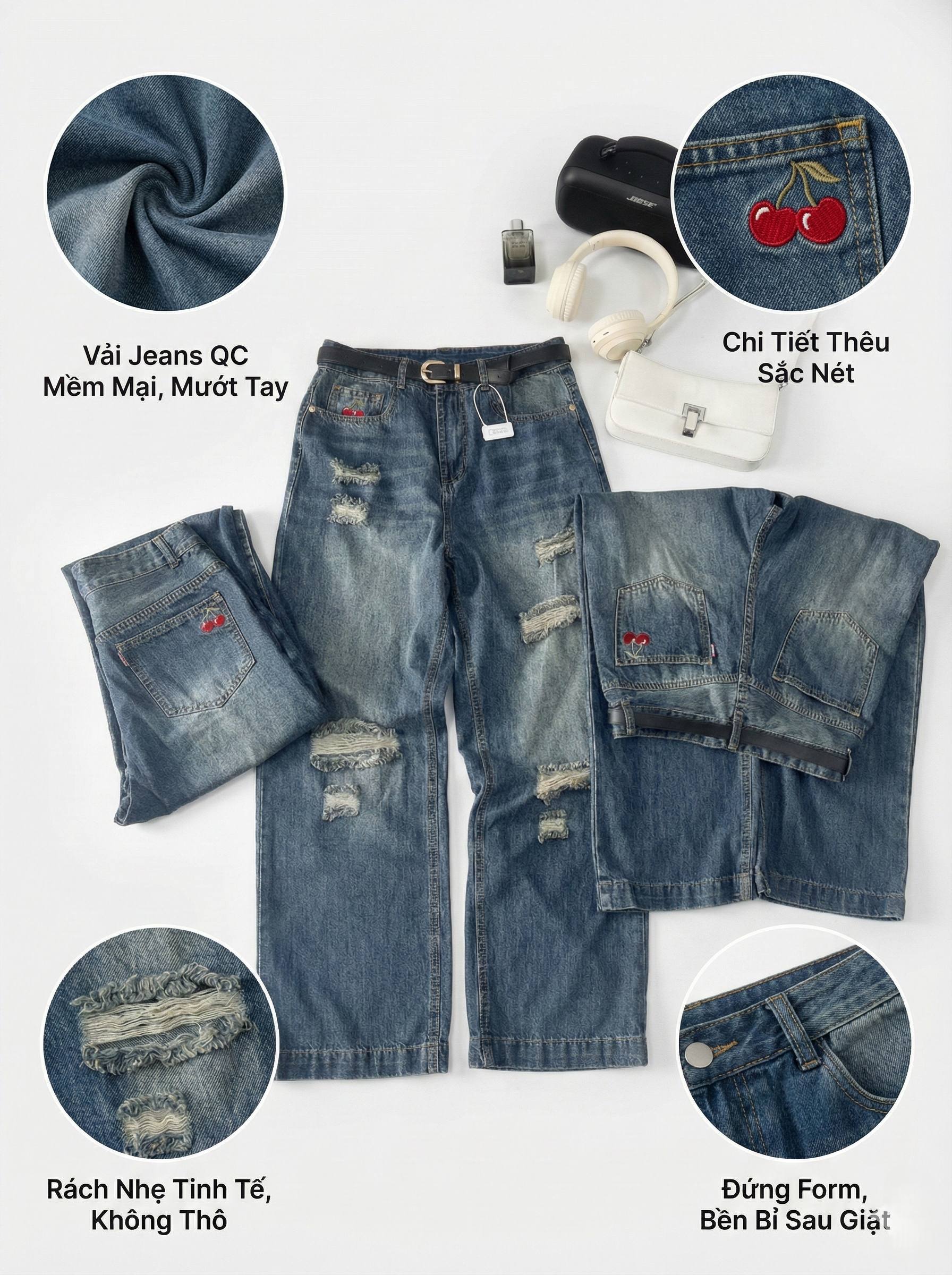 Ống suông rộng & Rách cá tính: Dáng quần suông thẳng đứng giúp che đi bắp đùi to hoặc chân cong. Các chi tiết mài rách (rách xước) được bố trí hợp lý tạo nét "bụi" và sành điệu mà không quá hở hang.