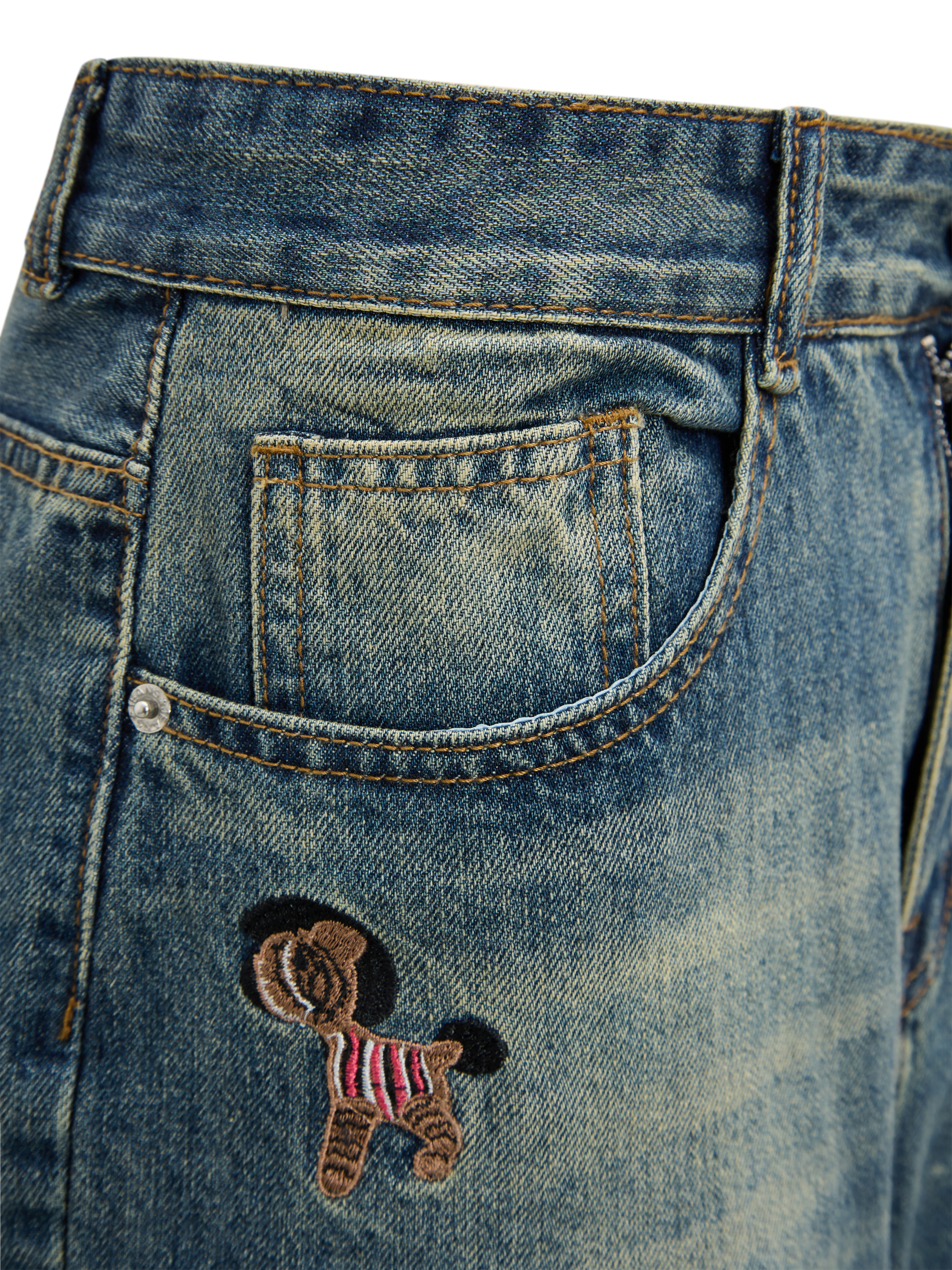 Hình thêu nổi: Điểm nhấn là hình thêu nhân vật nhỏ xinh ở túi trước, tạo sự khác biệt so với các mẫu jeans trơn thông thường.