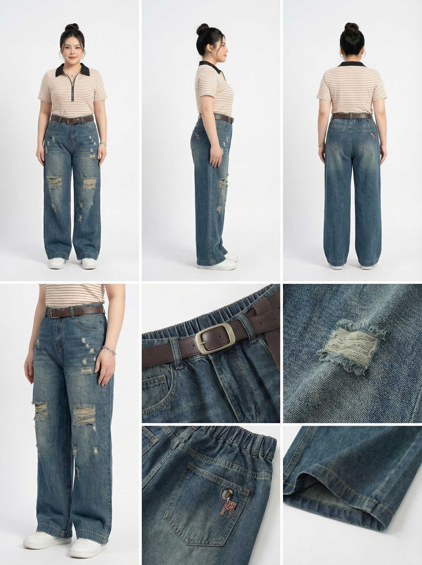 Chi tiết Rách & Thêu Ngựa: Những vết rách (hoặc xước) nghệ thuật tạo nét cá tính, trẻ trung. Đặc biệt, túi sau được thêu hình chú ngựa tỉ mỉ, tạo điểm nhấn thương hiệu sang trọng.