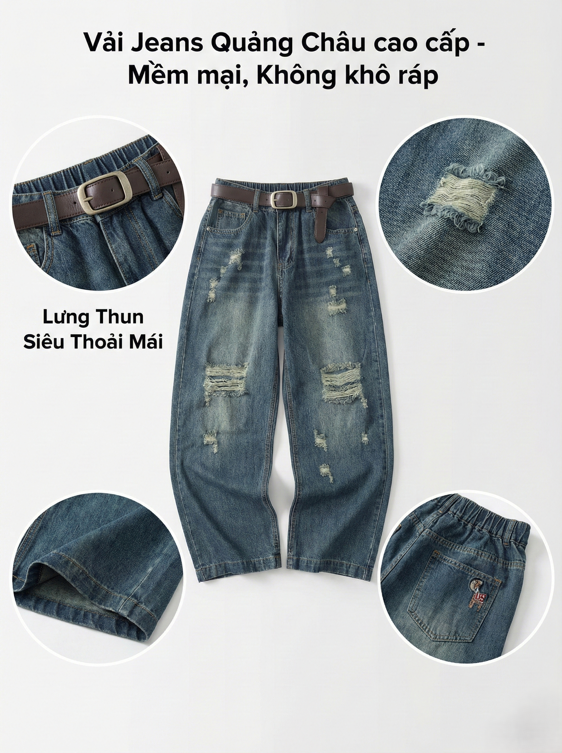 Kiểu dáng: Quần Jeans ống suông, mài rách, lưng thun.