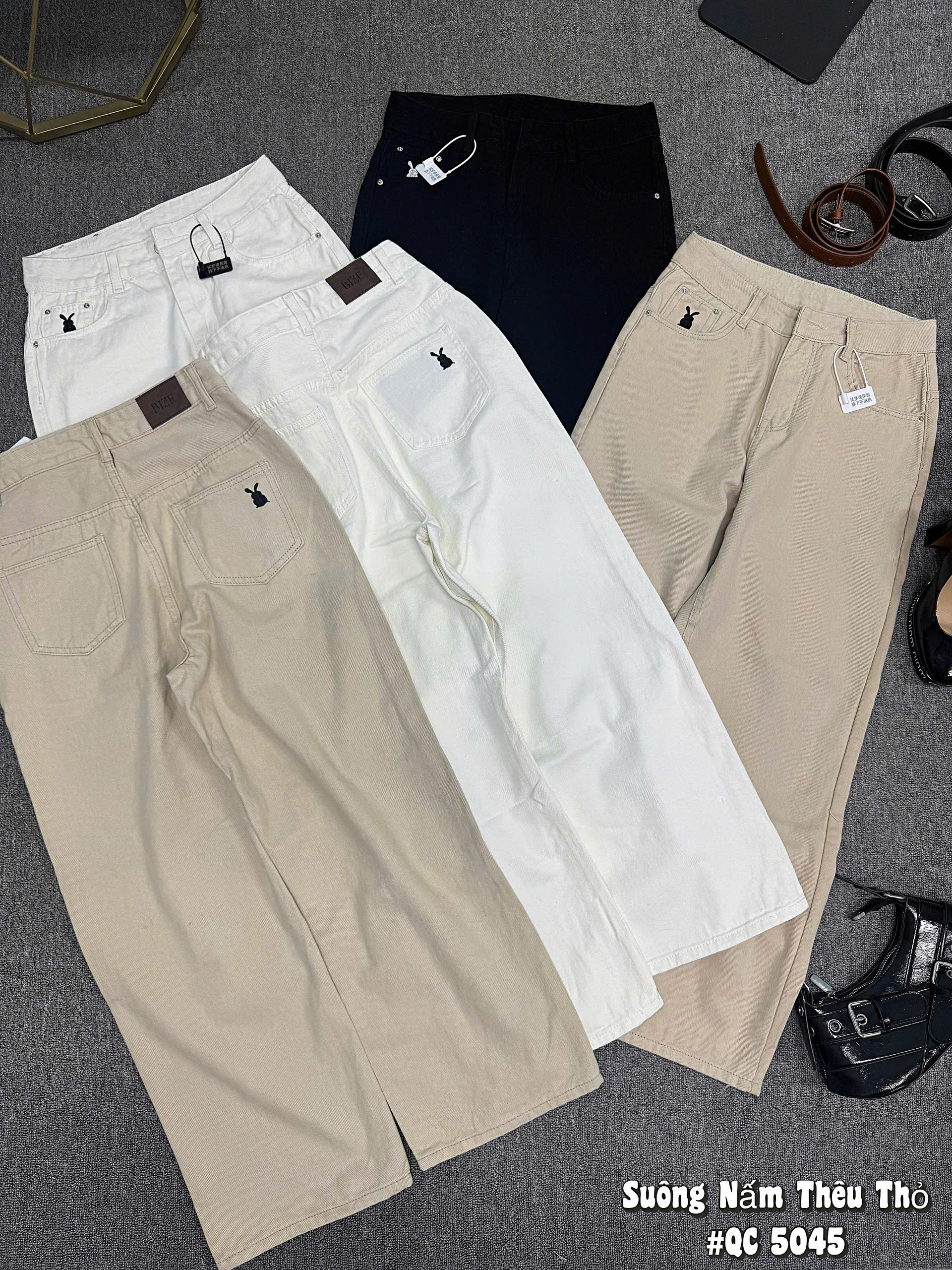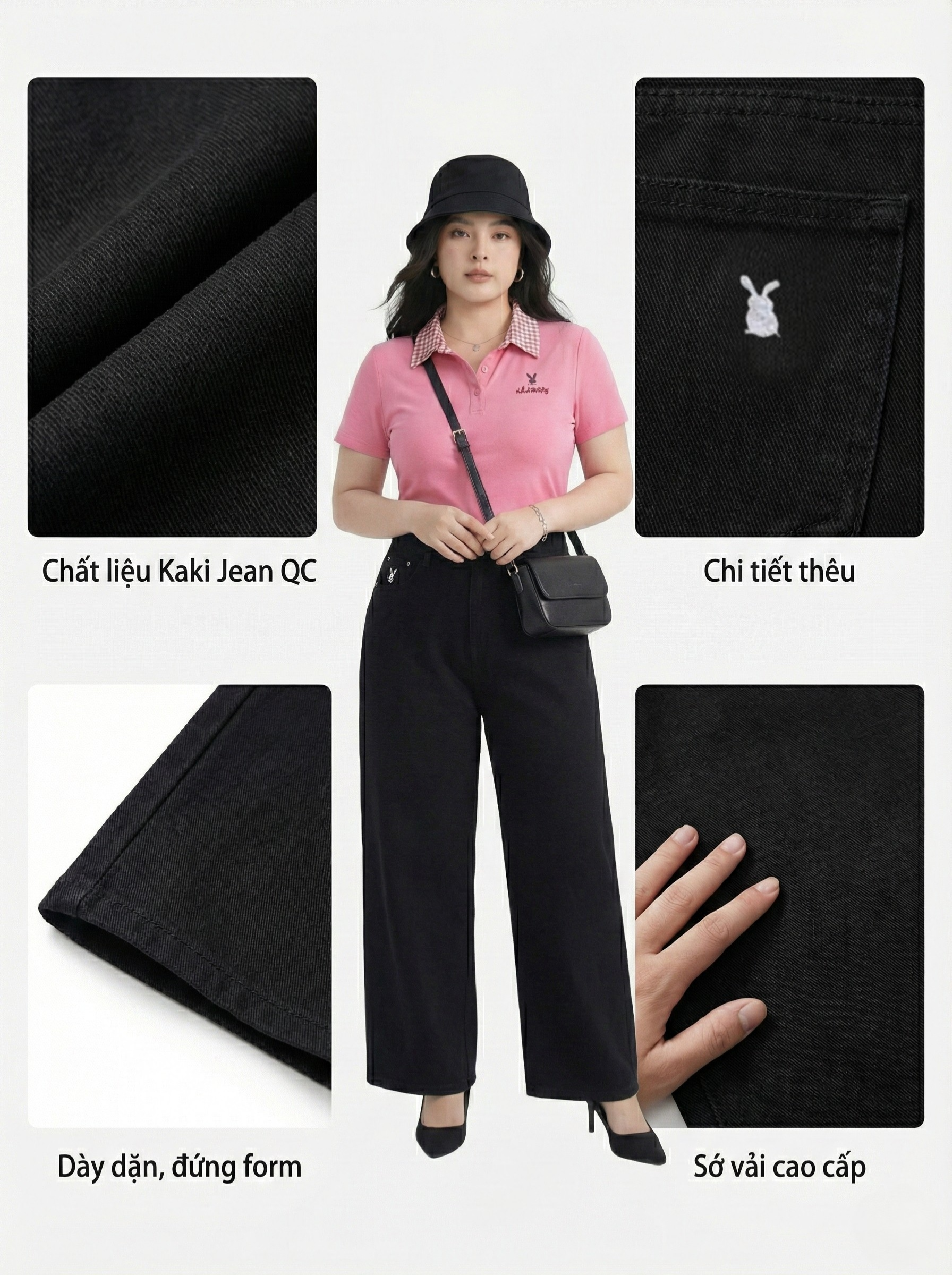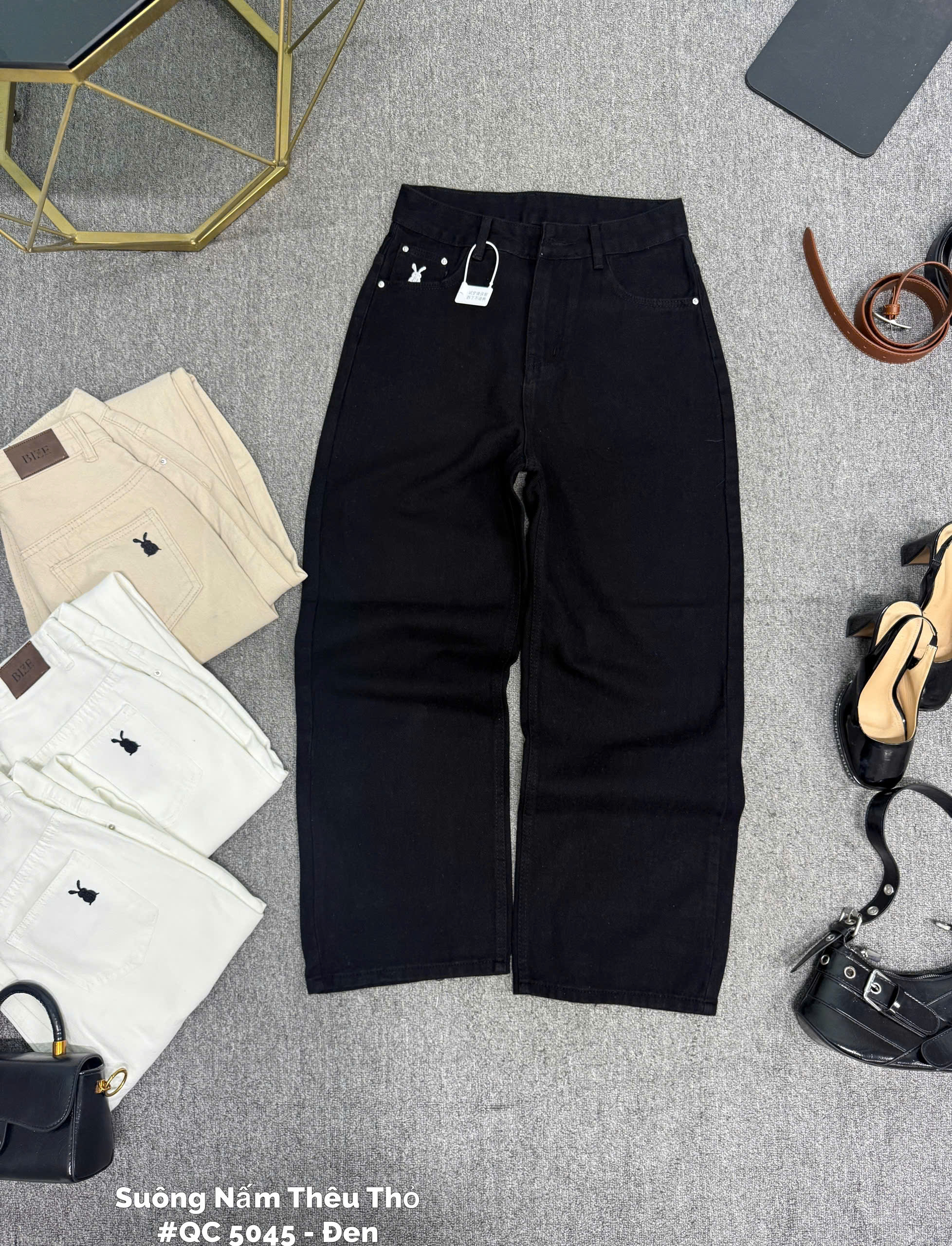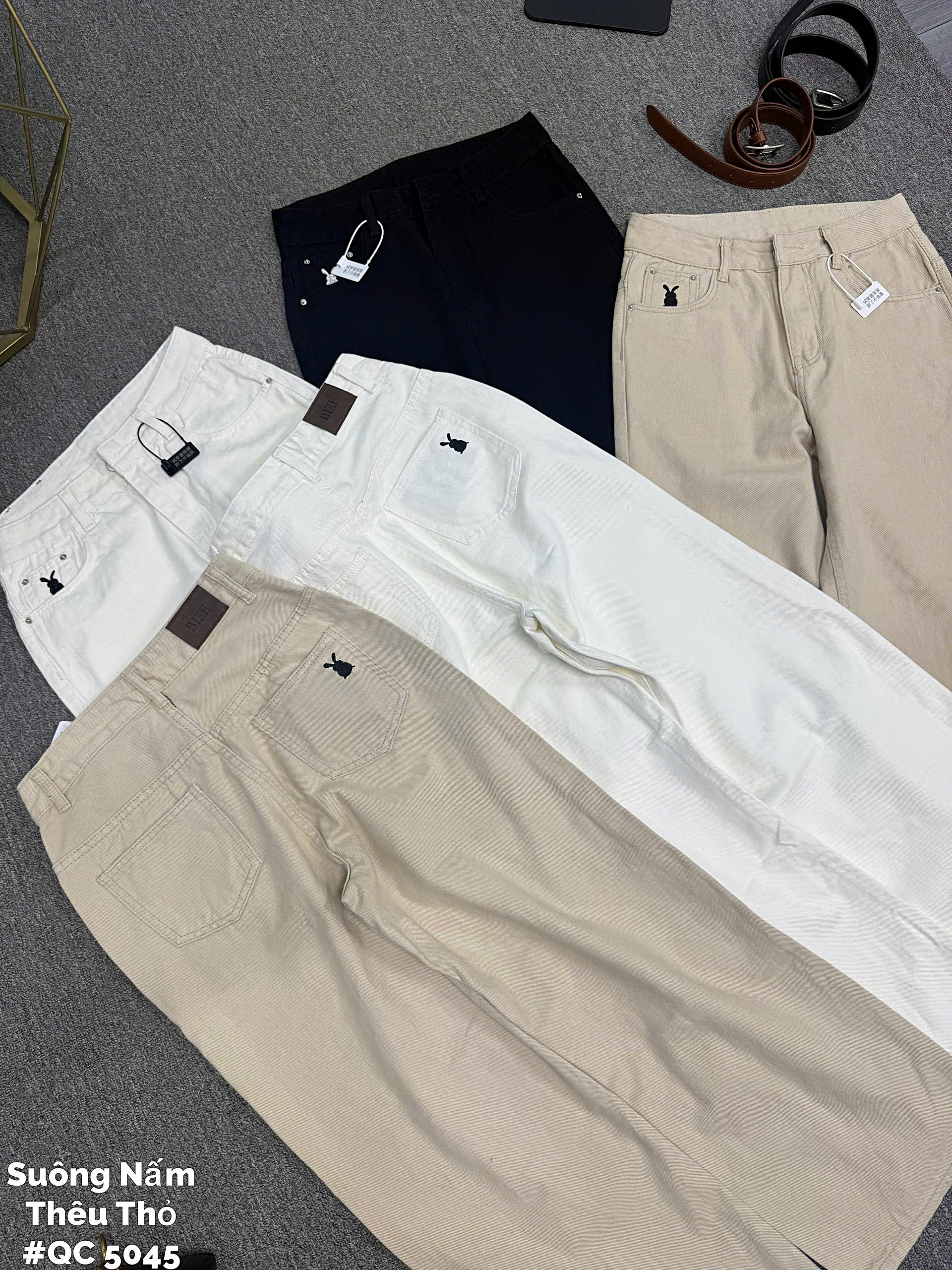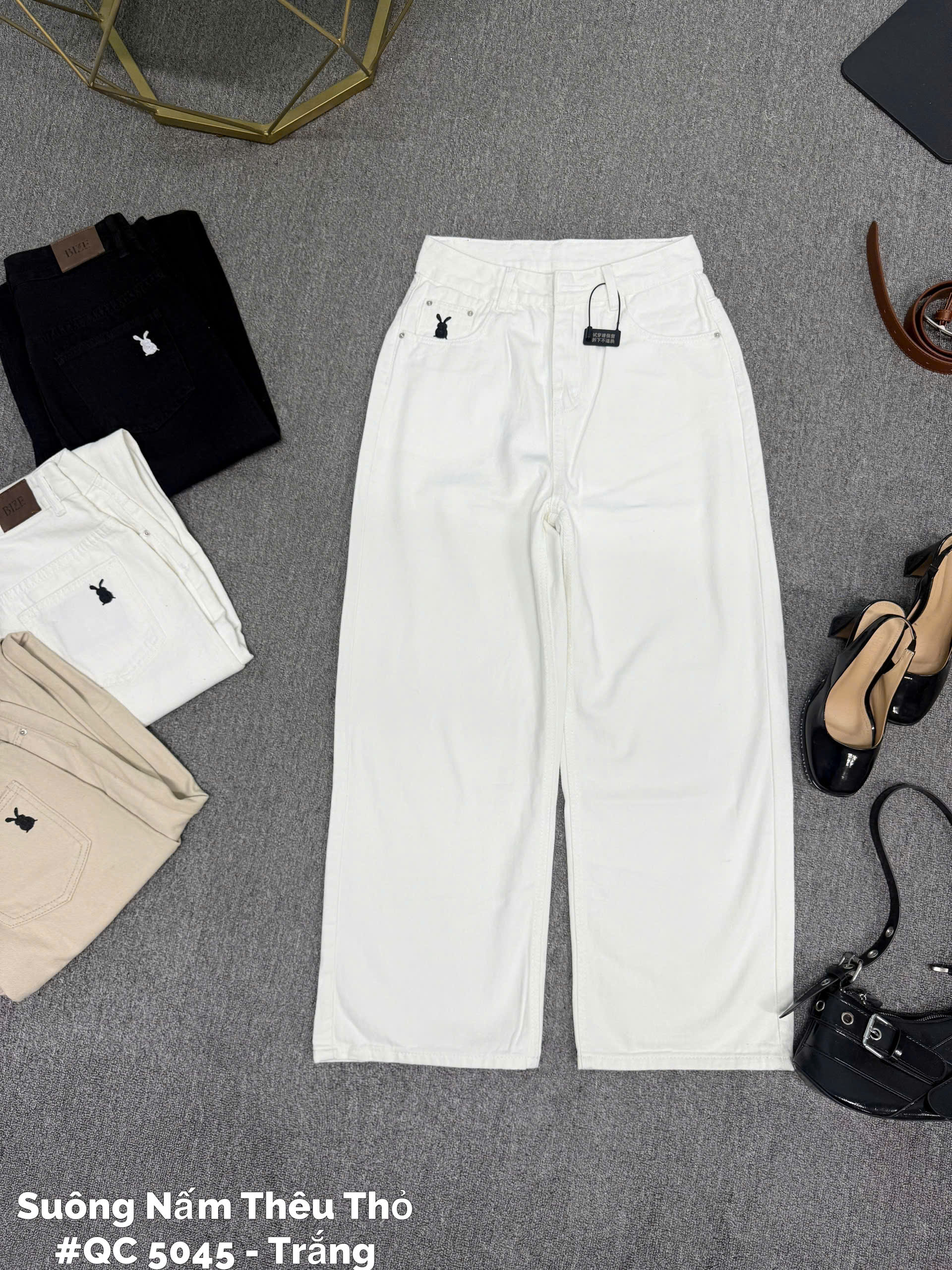 - Kiểu dáng : quần jean ống suông lưng cao , form basic , có túi thật trước và sau , lưng cao giúp hack dáng che bụng mỡ , thêu thỏ ở thân trước và sau tạo điểm nhấn cho quần , độ dài từ 97cm.