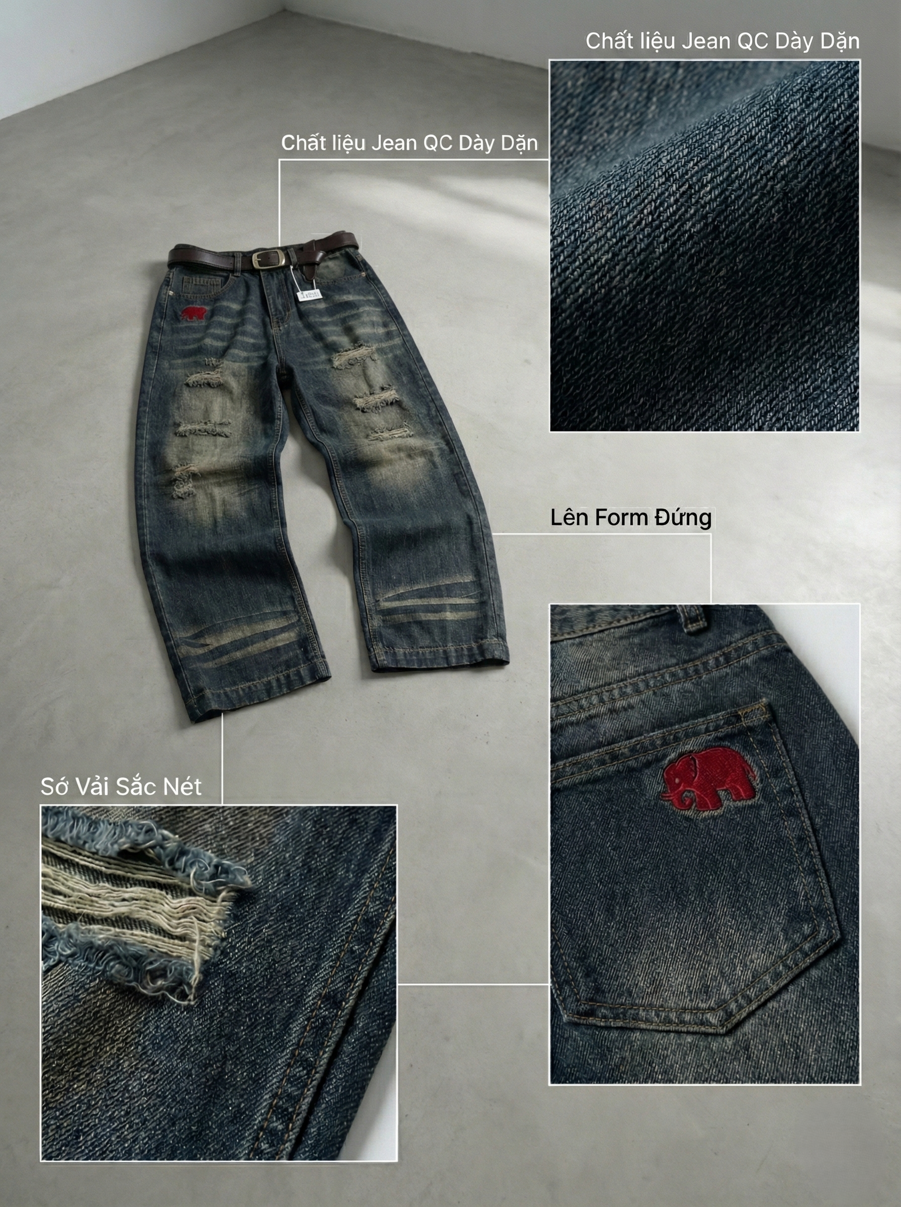 - Kiểu dáng : quần jean ống suông lưng cao , form basic , có túi thật trước và sau , lưng cao giúp hack dáng che bụng mỡ , quần rách nhẹ thân trước , túi trước và sau phối thêu voi xinh xắn , độ dài 103-105cm .