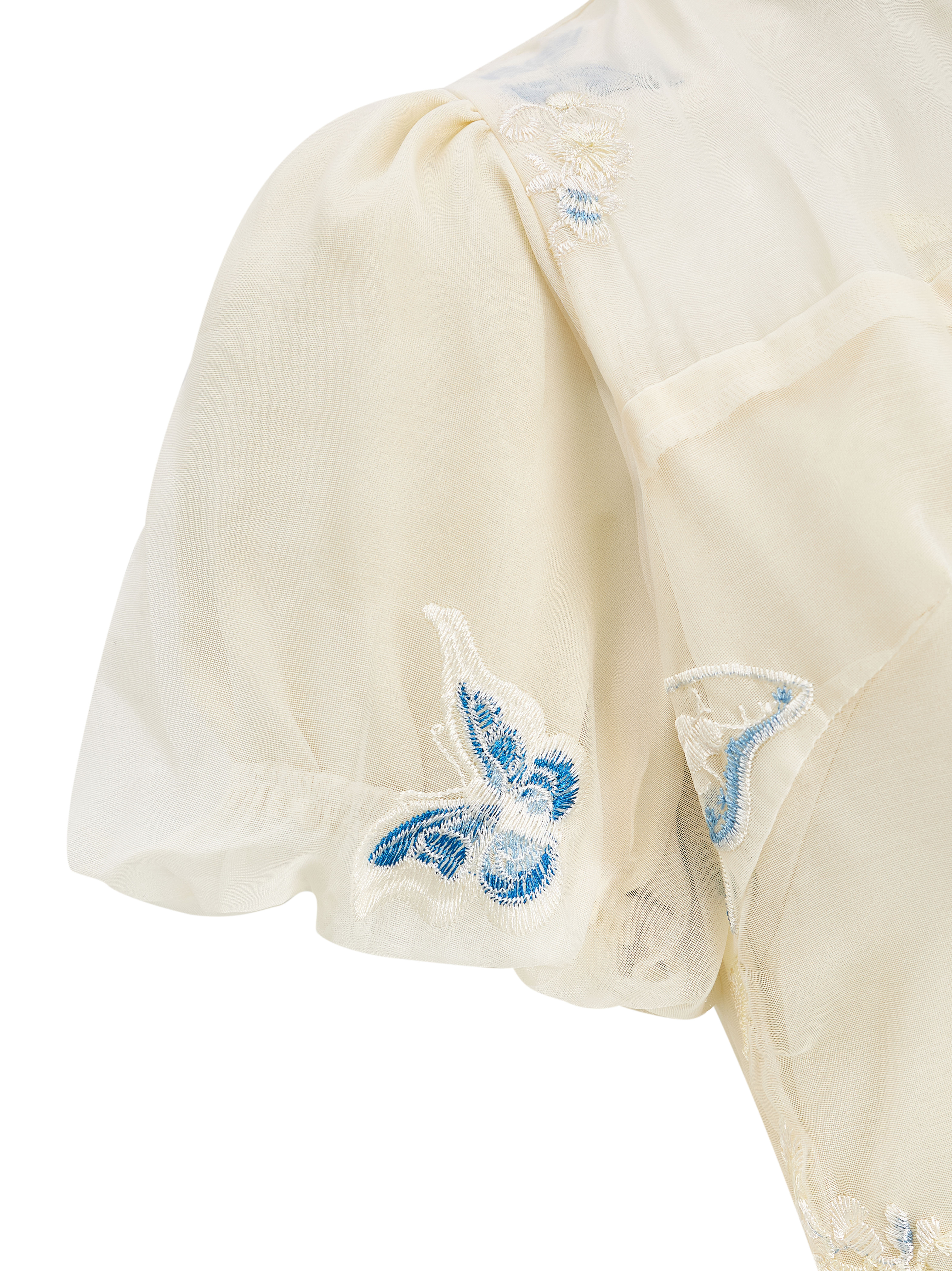 + Áo : vải chính là voan tơ thêu hình hồ điệp, hình thêu đẹp , bên trong là lớp lụa satin có độ dày vừa phải , độ ánh nhẹ , mềm mại , mặc thoải mái , không sợ ngứa .
