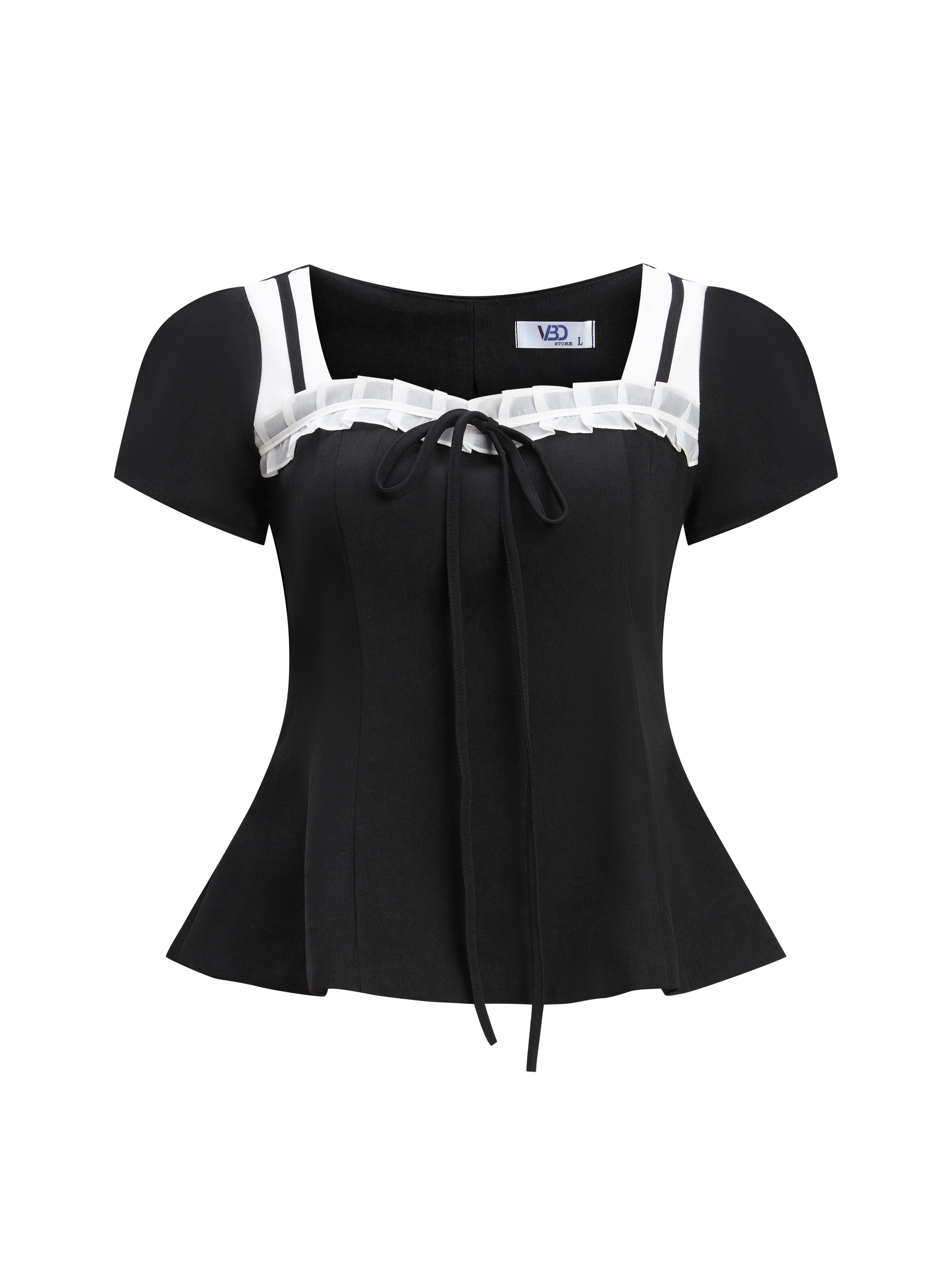 + Áo : áo 2 lớp , thiết kế kiểu cổ vuông , tay áo ngắn xếp ly nhẹ trên phần đỉnh vai tạo độ phồng , thiết kế rã mảnh giúp fit dáng người mặc , thân trước là phần voan may kiểu tạo điểm nhấn , dây kéo thân sau .