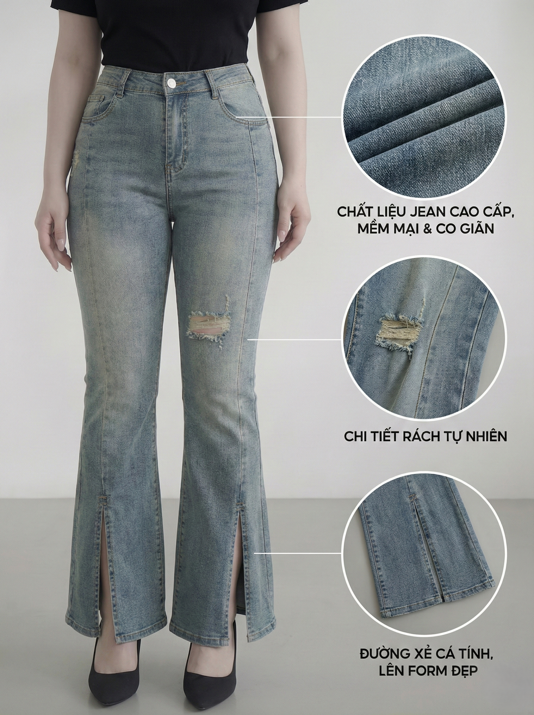 - Kiểu dáng : quần jean ống loe , lưng cao hack dáng che phần bụng , có túi thật trước và sau , thiết kế rách ống 1 bên , ống quần loe kết hợp xẻ tạo sự cá tính , độ dài 100cm.