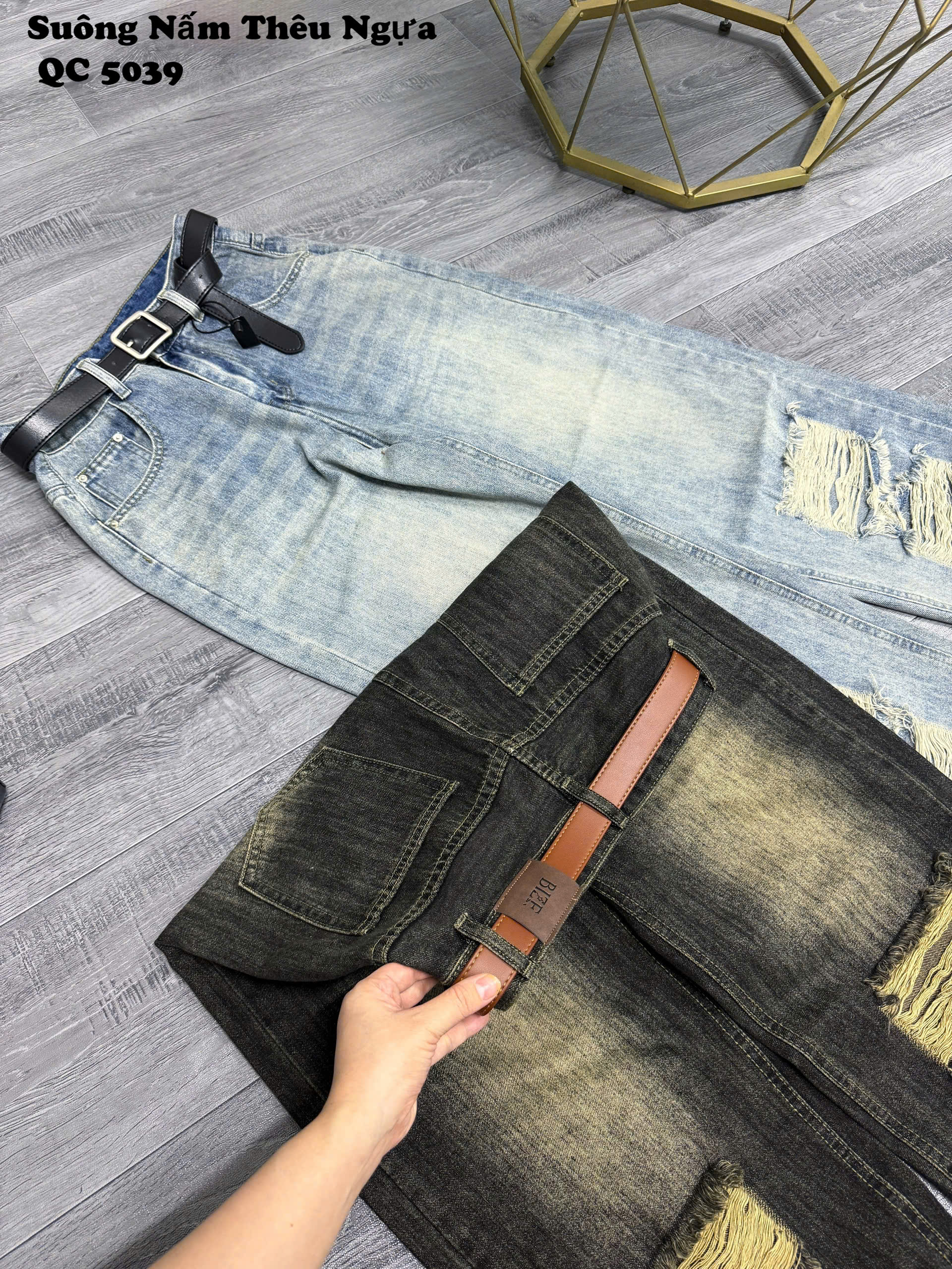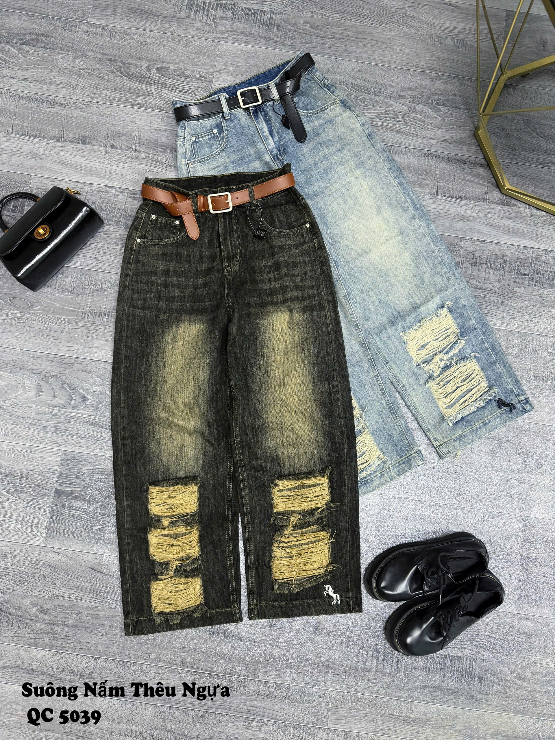 Kiểu dáng: Quần Jeans ống suông, rách, thêu ngựa.