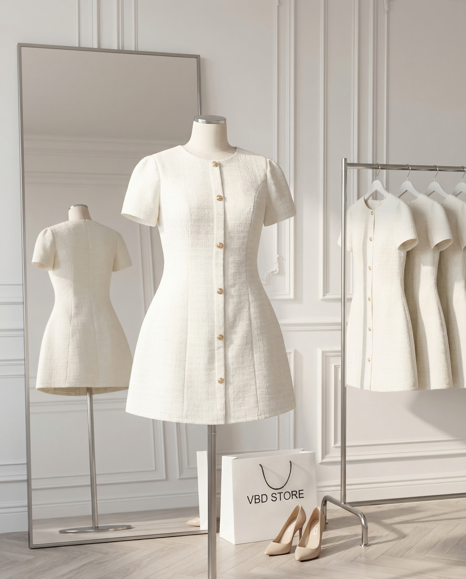 - Kiểu dáng : đầm dáng A ngắn 2 lớp , thiết kế rã mảnh nhiều giúp fit dáng người mặc hơn , cổ đầm tròn , tay đầm ngắn có nhún tạo phồng trên vai , thân trước đính nút kiểu tạo điểm nhấn , dây kéo thân sau .