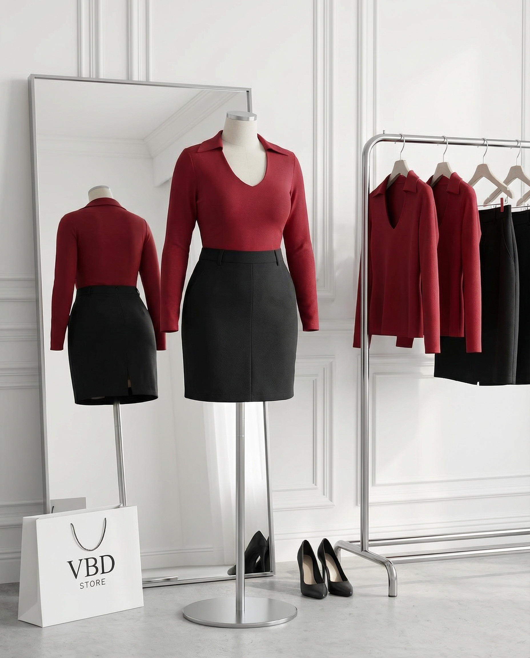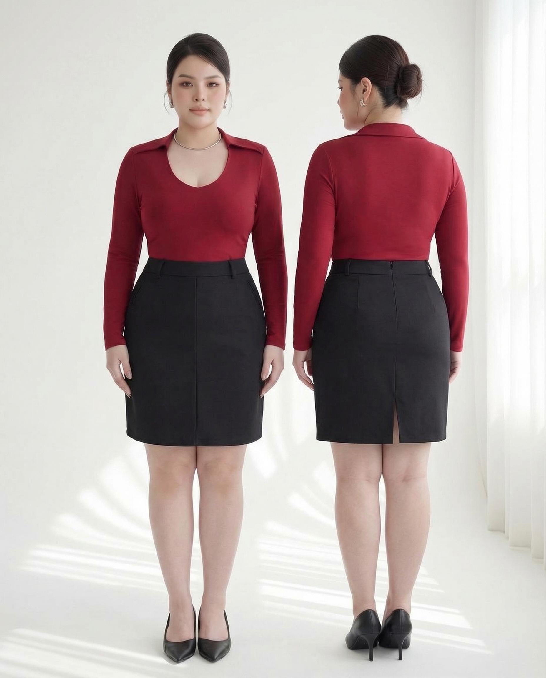 - Kiểu dáng : form áo dáng ôm , tay áo dài , cổ kiểu bẻ kiểu tạo điểm nhấn , phần cổ bo vuông tròn , tay áo dài .