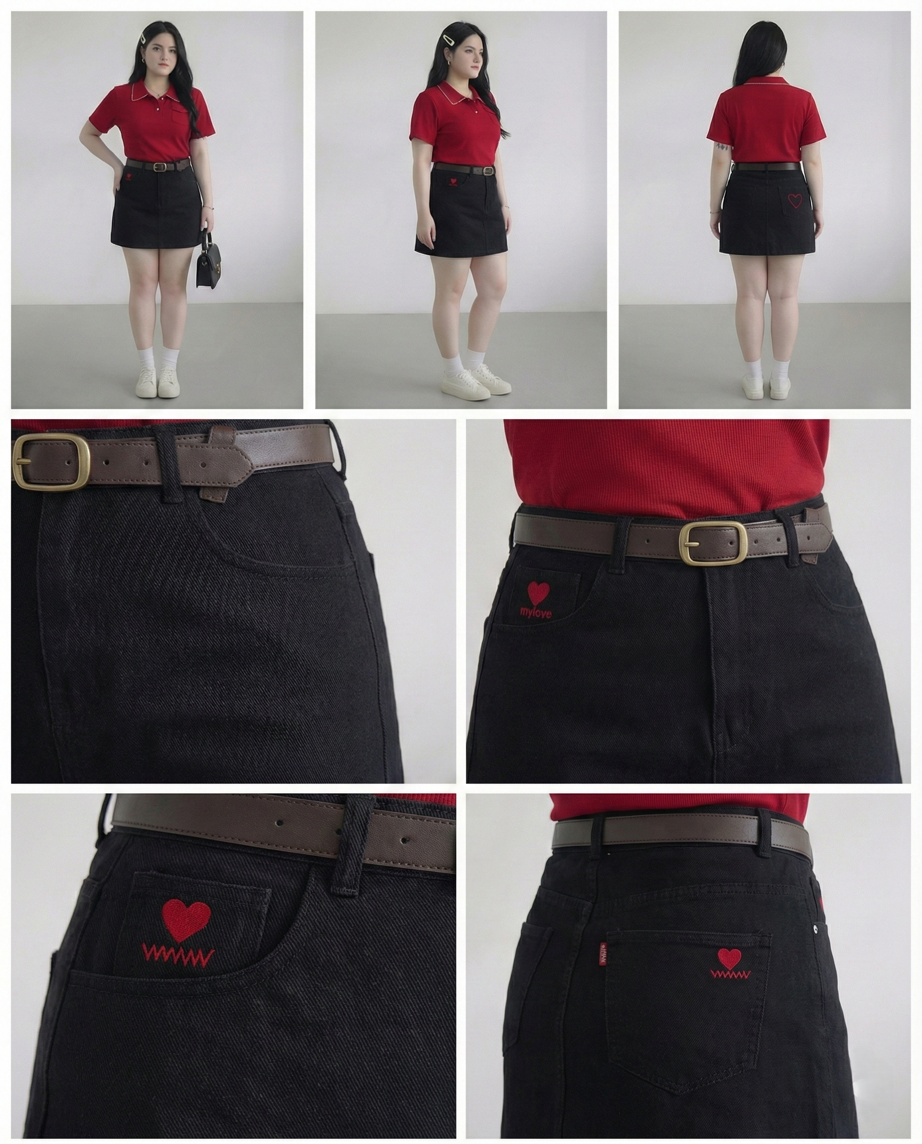 - Kiểu dáng : chân váy dáng A , có lớp lót lụa bên trong , lưng váy cao giúp hack dáng che bụng , túi thật trước và sau , thêu hình trái tim ở túi trước và sau tạo điểm nhấn , lai váy lớn .