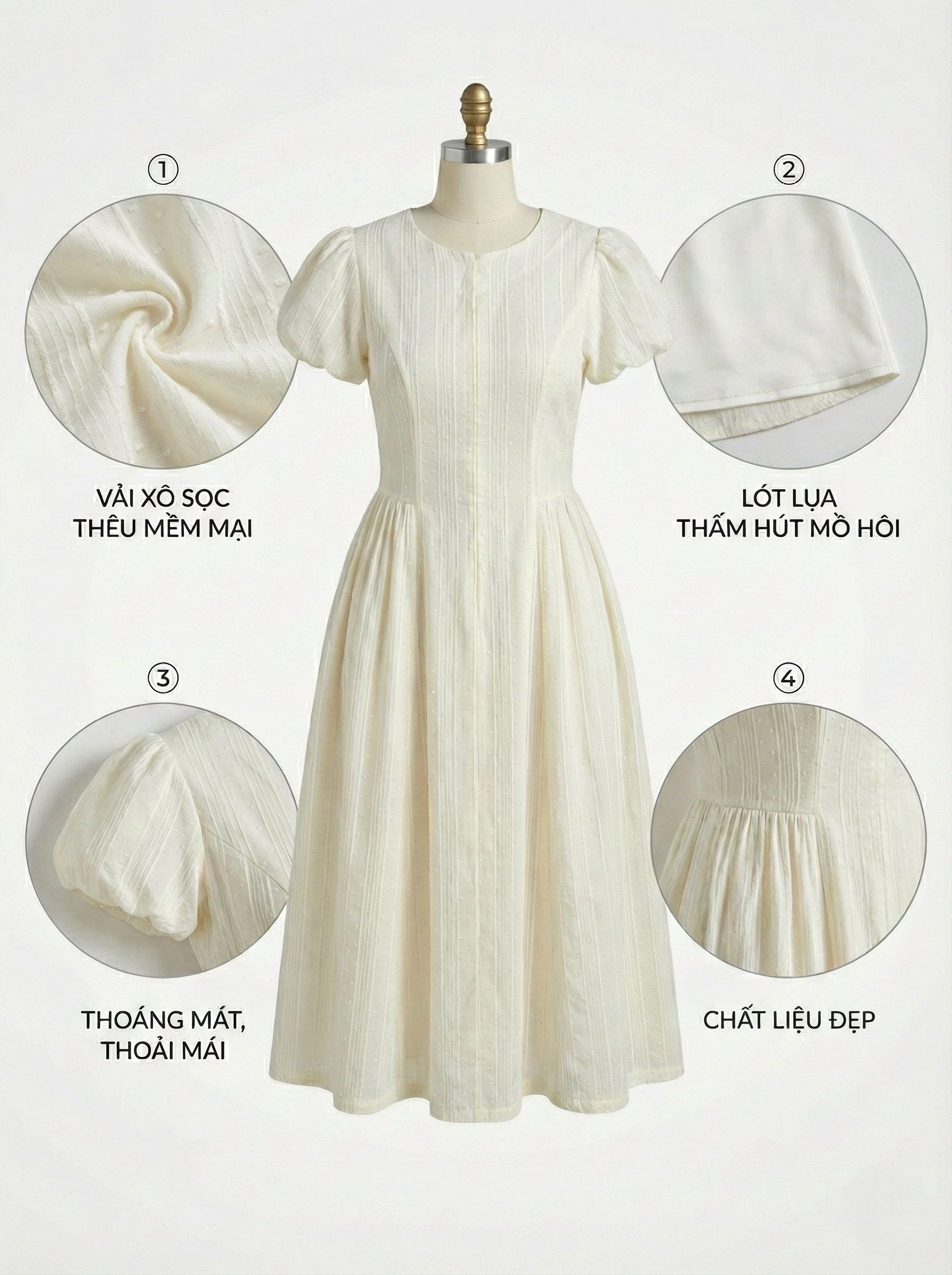 - Kiểu dáng : đầm dáng dài , 2 lớp , có phần cổ tròn vừa kín đáo vừa nữ tính , tay áo phồng kiểu , thân trước có dây kéo tùy chỉnh , đầm thiết kế rã mảnh nhiều giúp tôn eo hơn , phân dưới eo có 1 phần nhún kiểu tạo độ phồng và thắt eo cho đầm .