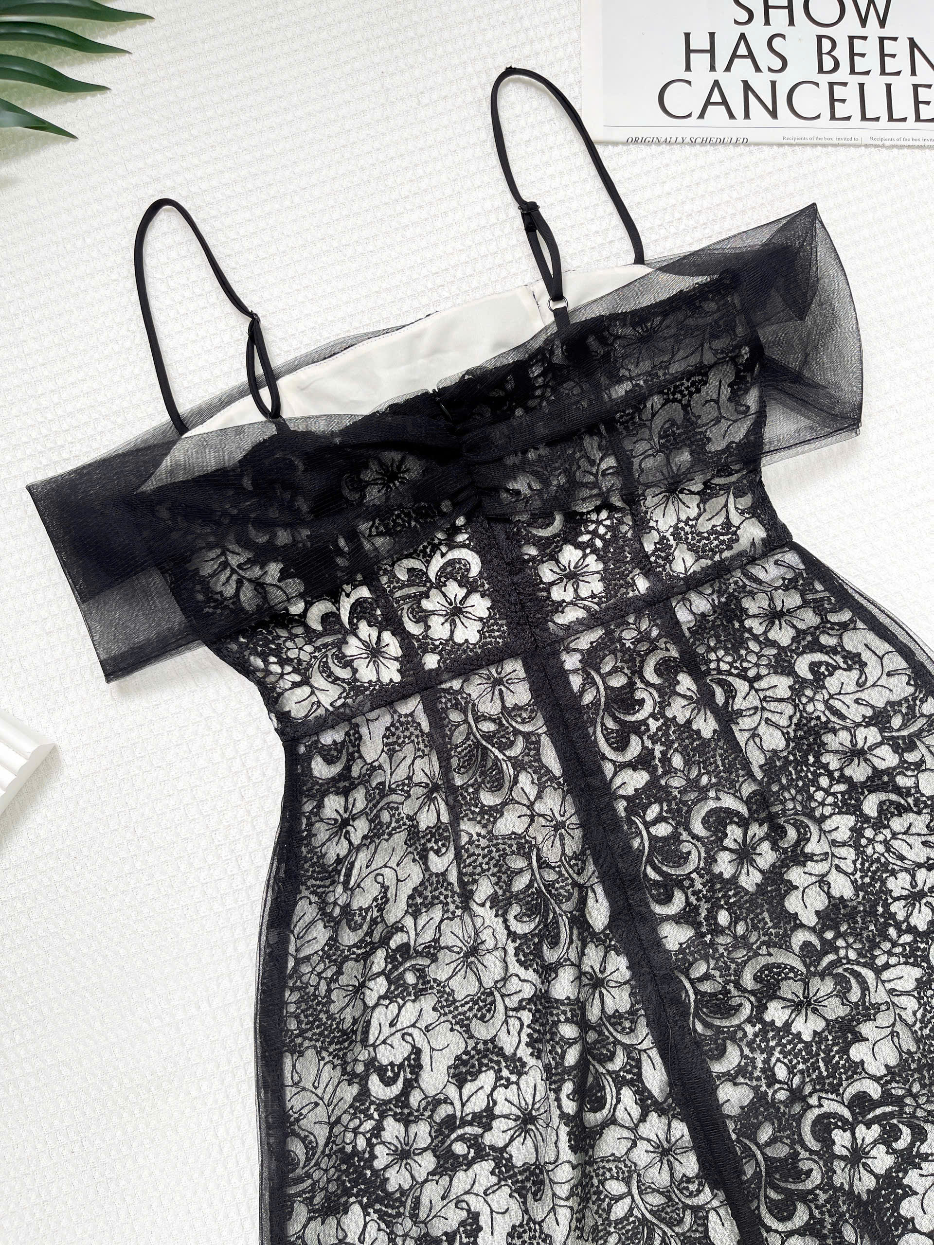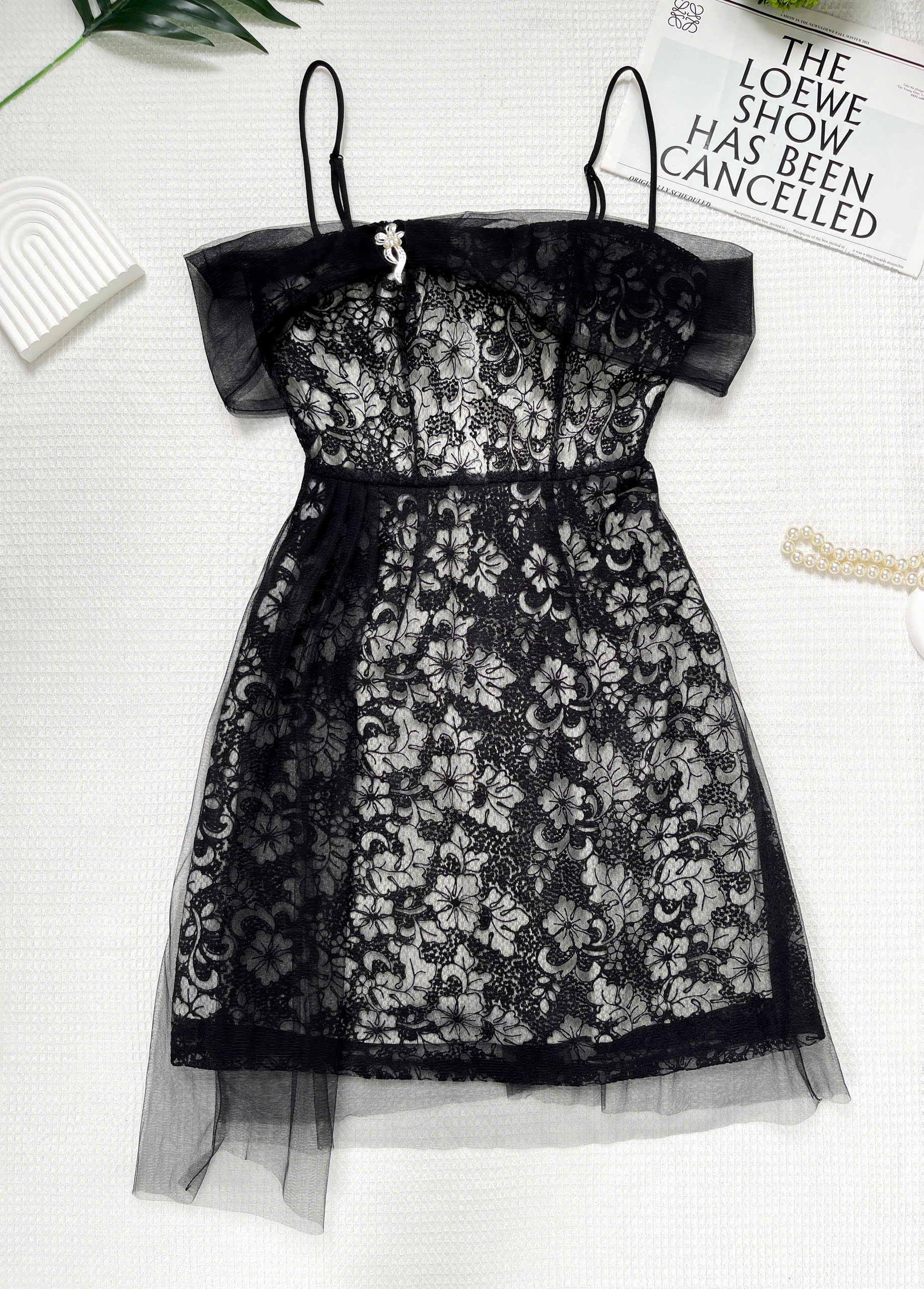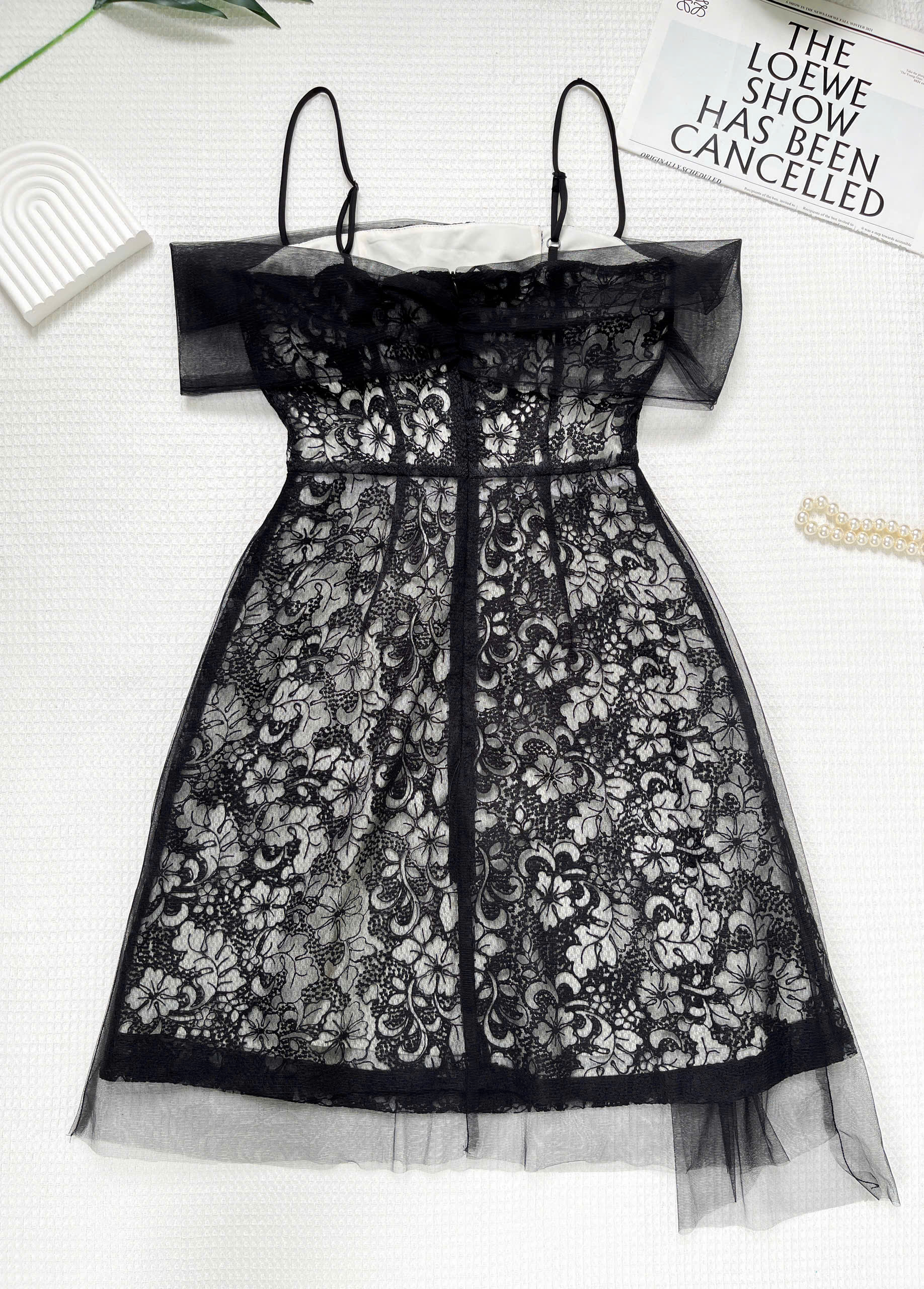 - Kiểu dáng : đầm A 2 lớp dáng ngắn , có dây tăng đơ điều chỉnh độ dài tùy ý , phần lưới kiểu trễ vai , thân trên đầm rã mảnh giúp fit dáng người mặc hơn , phần dưới kiểu xếp ly nhẹ phần lưới làm điểm nhấn , phía sau có dây kéo , trên ngực phối khoen kiểu .