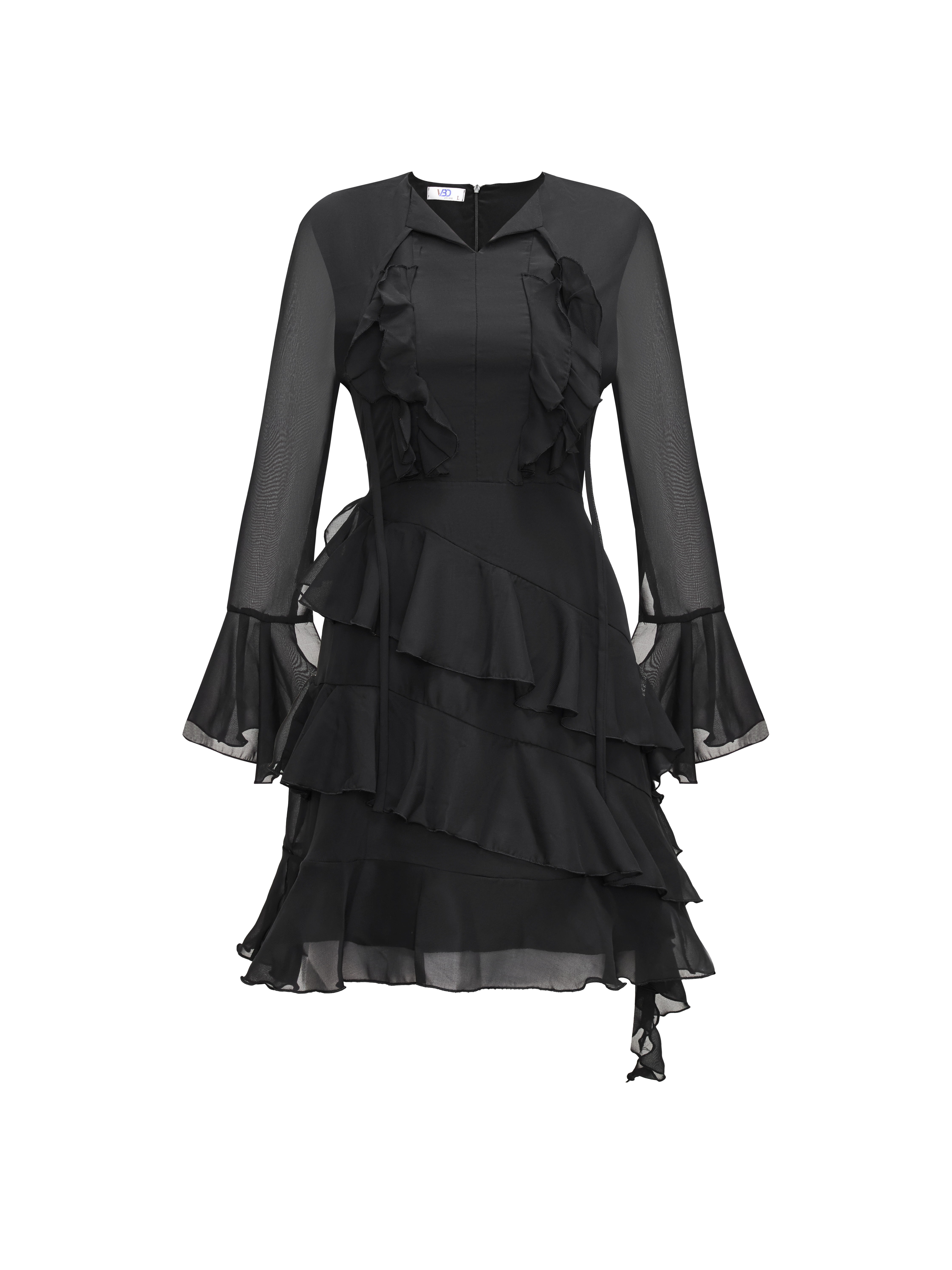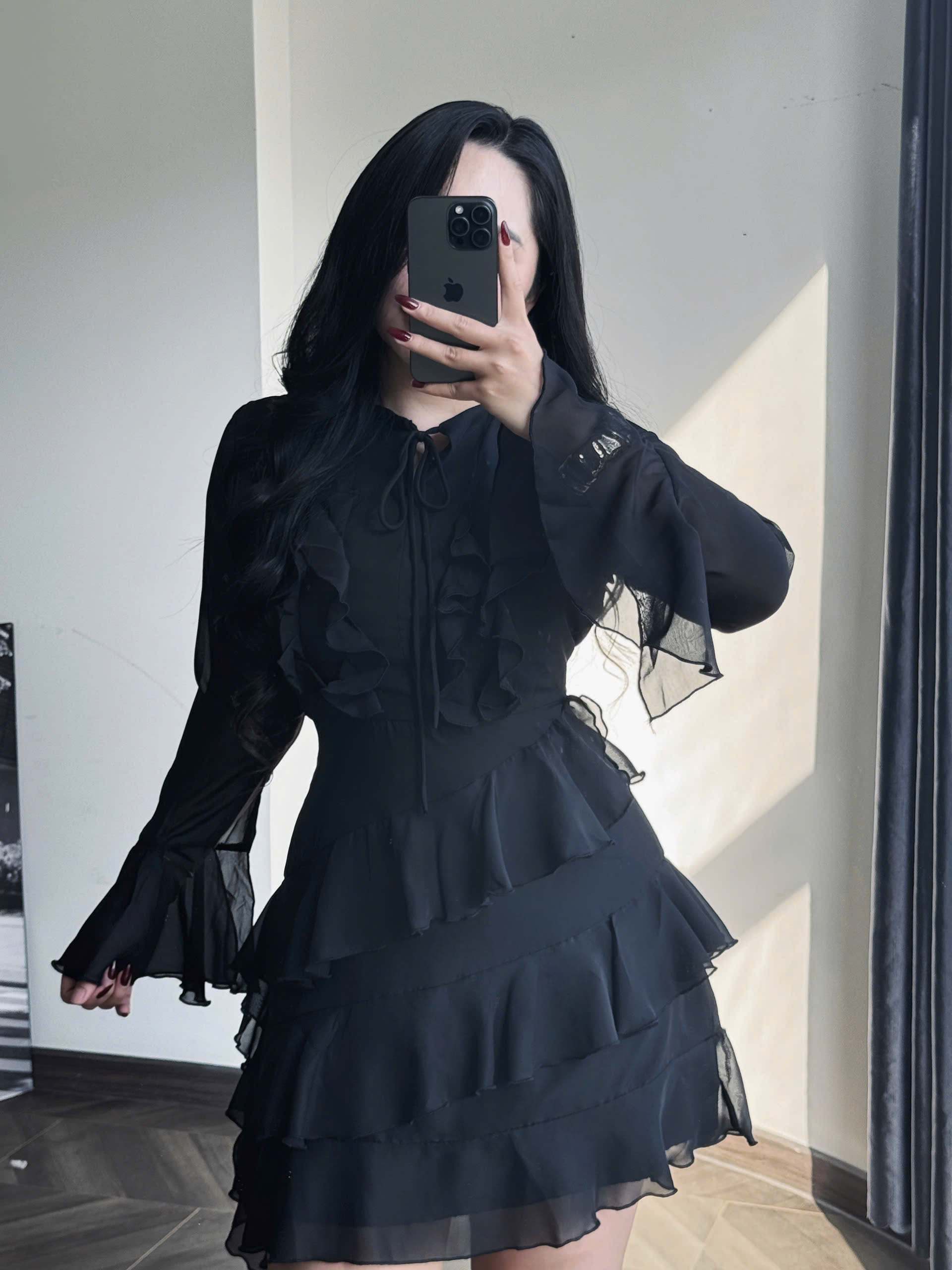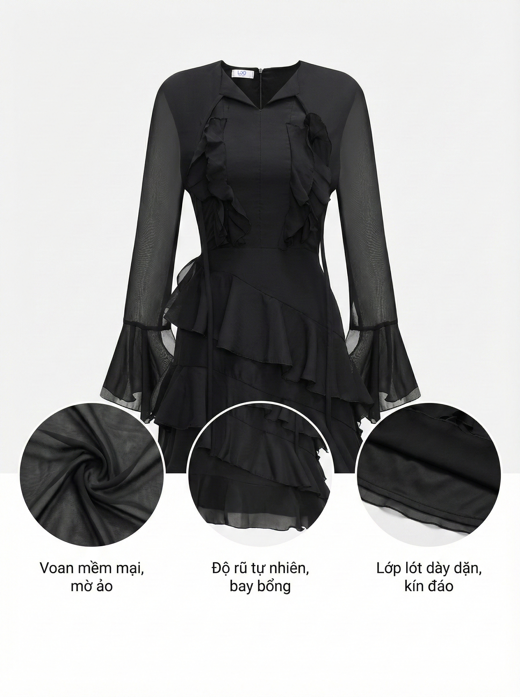 - Kiểu dáng : đầm voan 2 lớp , tay dài xòe ở phần tay , cổ kiểu cổ bẻ phối dây nơ kiểu có thể tháo hoặc gập ra tùy ý , phần tùng kiểu xoắn, dây kéo phía sau, có 1 bên xoắn dài tạo điểm nhấn