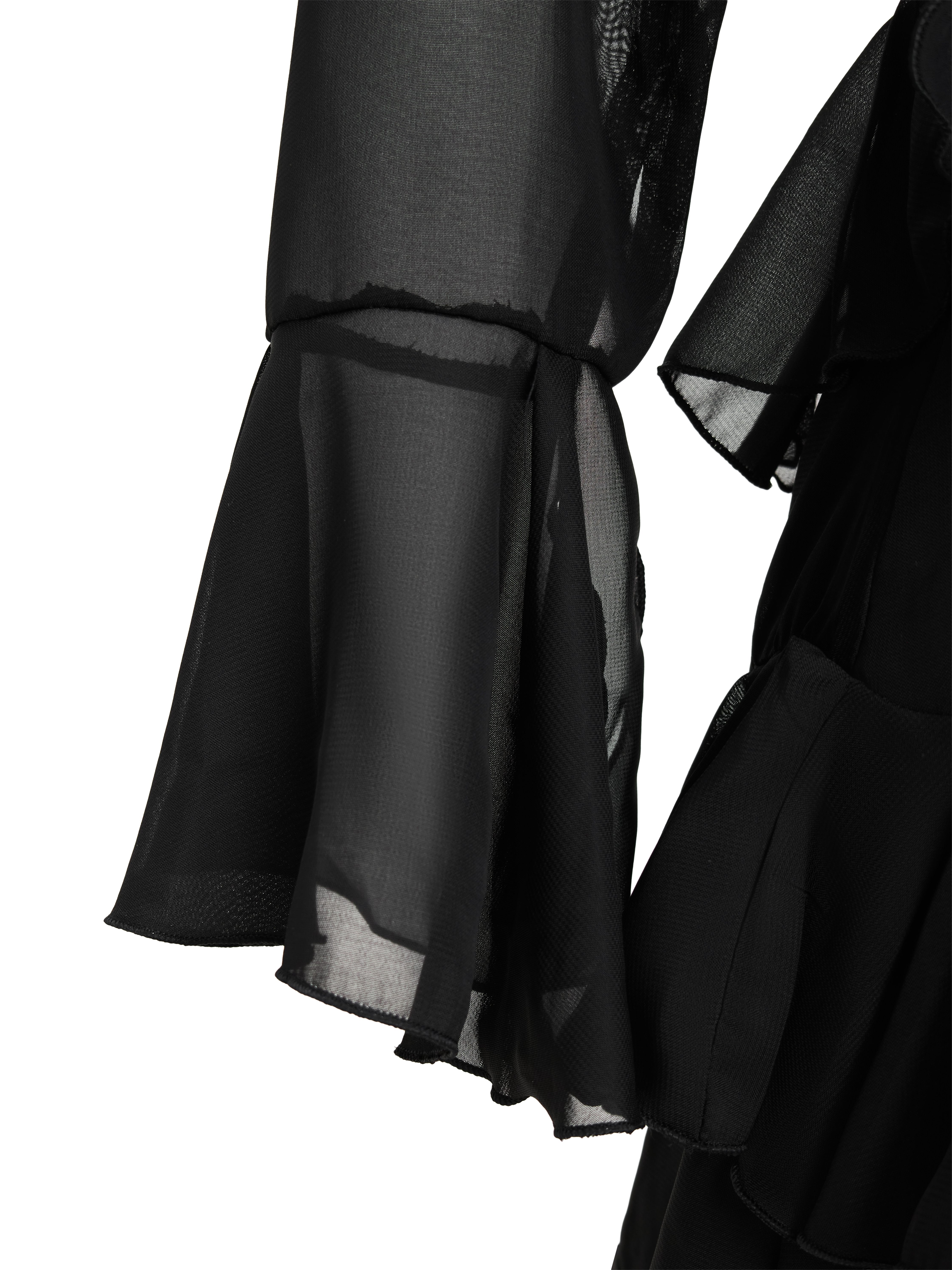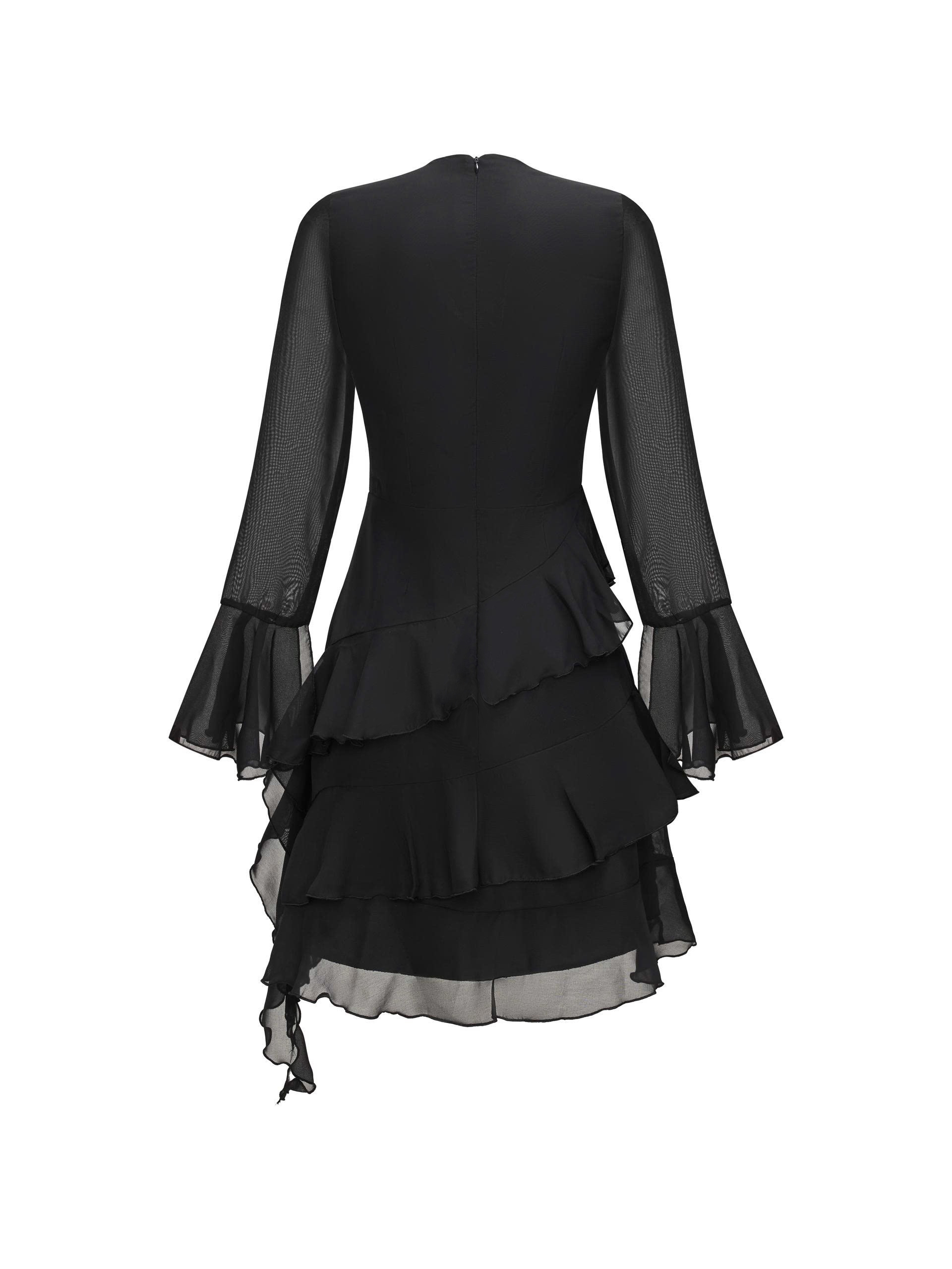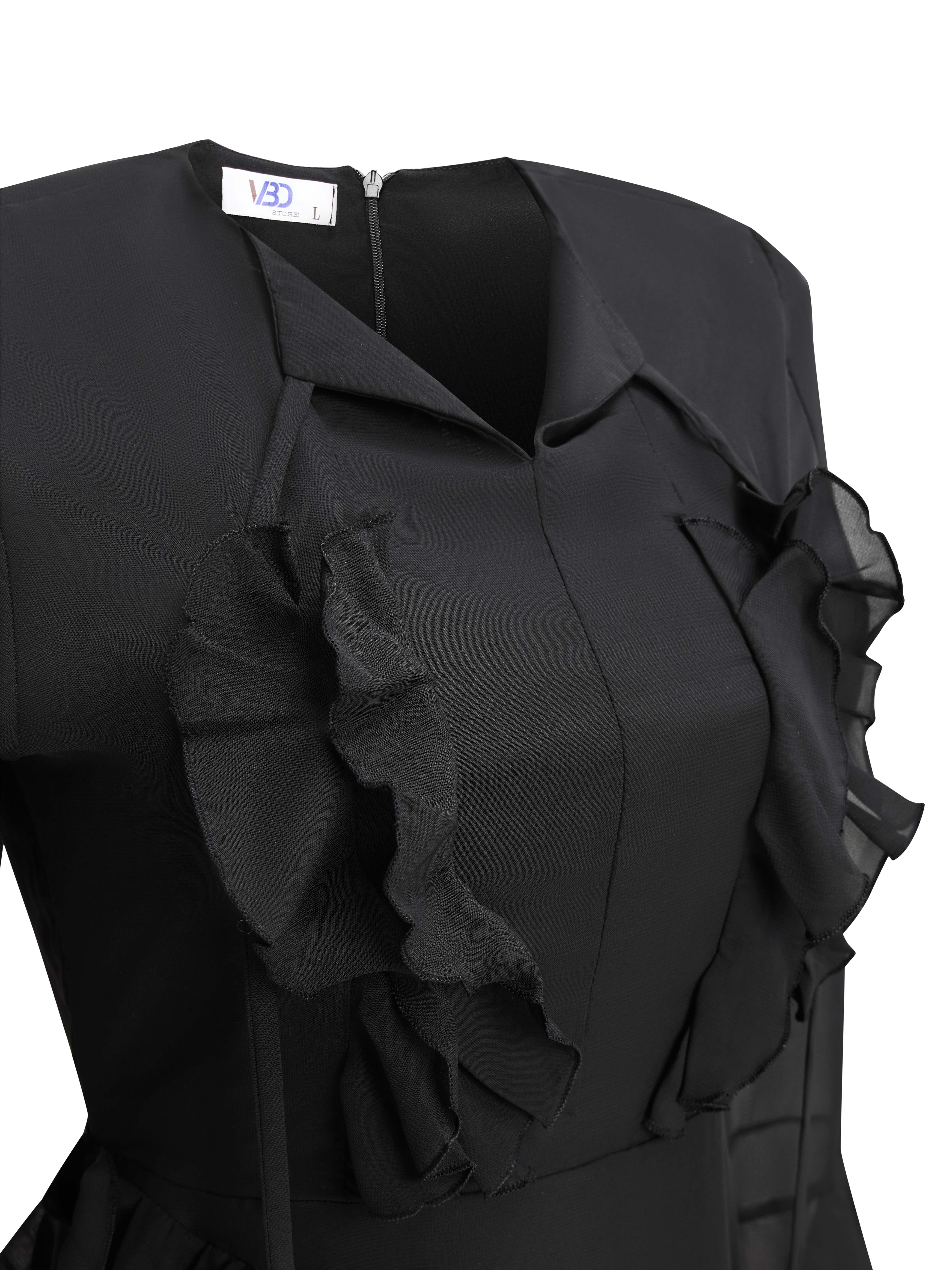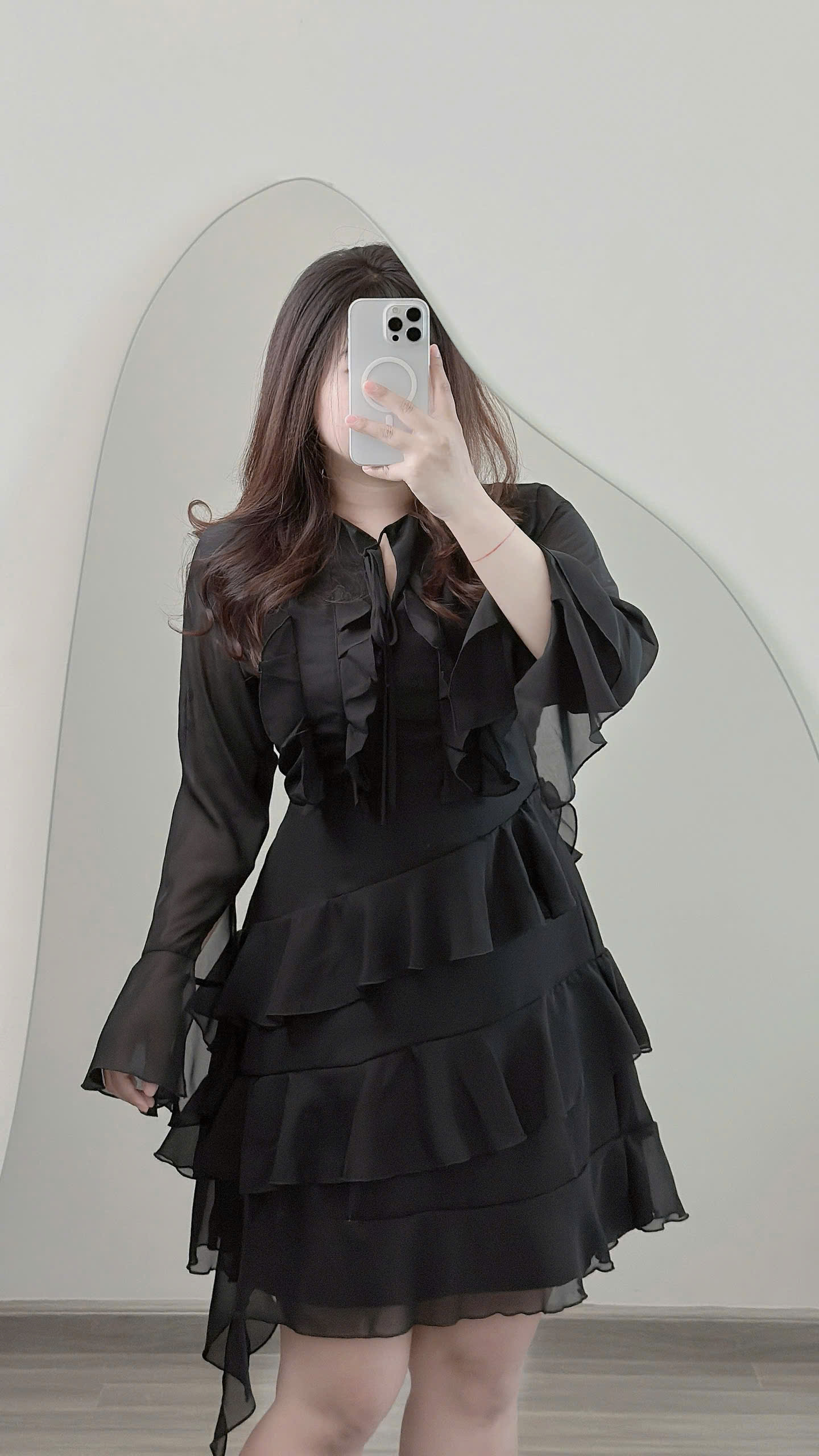 - Kiểu dáng : đầm voan 2 lớp , tay dài xòe ở phần tay , cổ kiểu cổ bẻ phối dây nơ kiểu có thể tháo hoặc gập ra tùy ý , phần tùng kiểu xoắn, dây kéo phía sau, có 1 bên xoắn dài tạo điểm nhấn