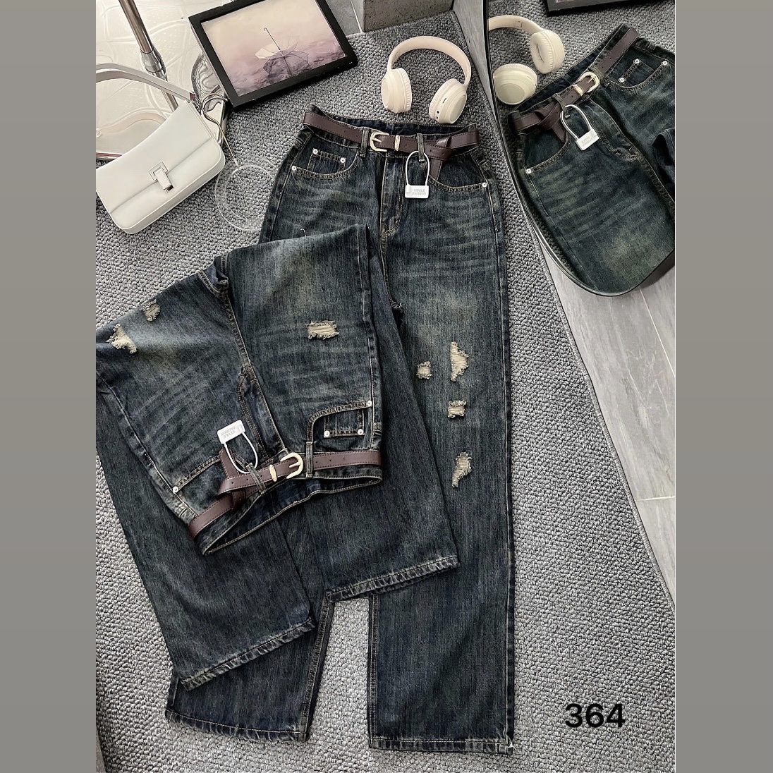 + Kiểu dáng: quần jean dáng suông , lưng cao , có túi thật trước và sau , quần rách kiểu thân trước và sau , cào nhẹ thân sau .