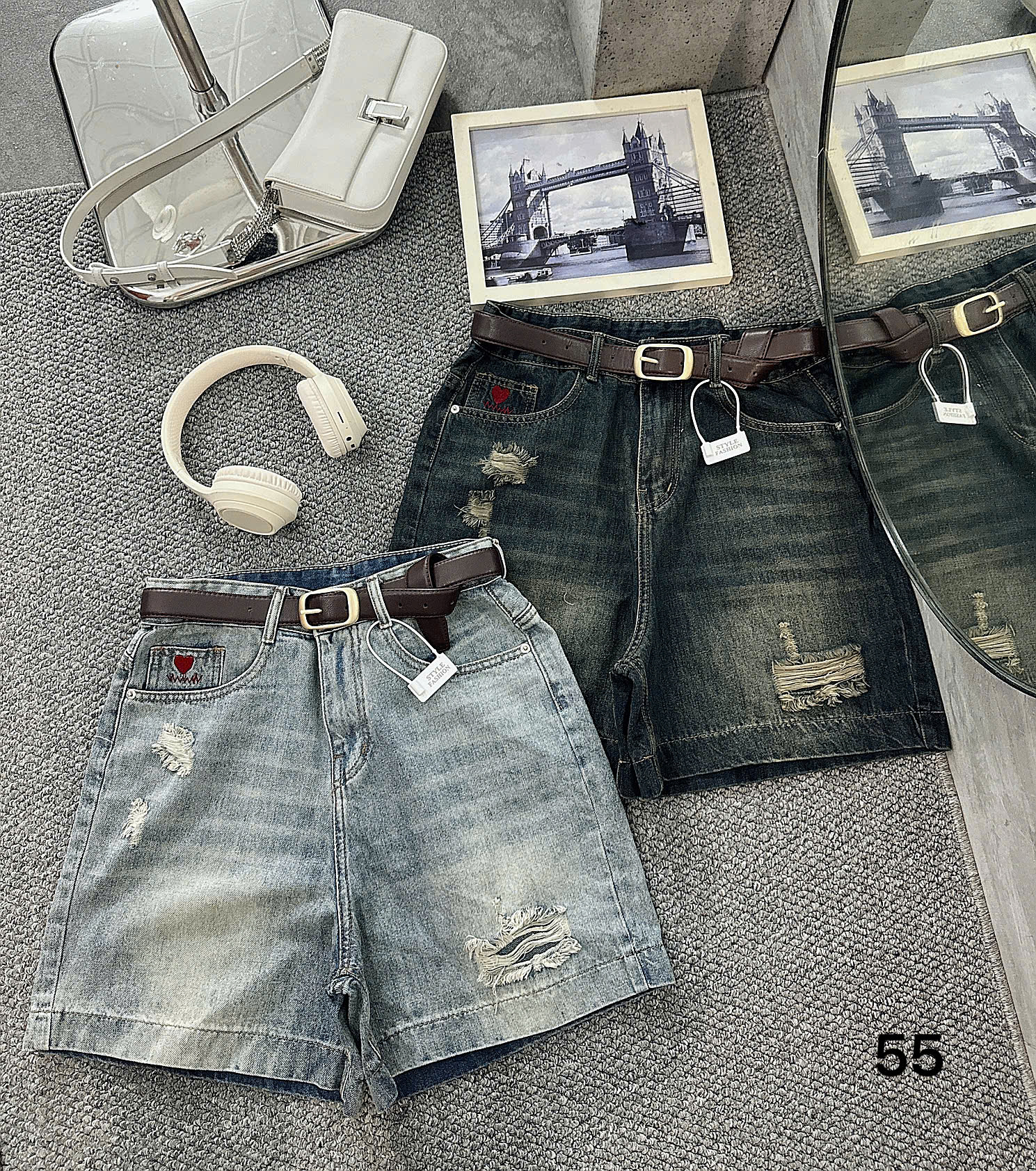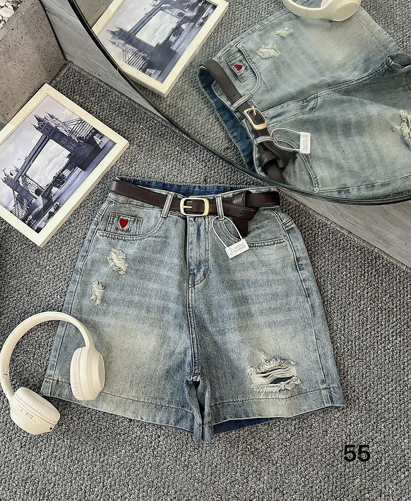 - Kiểu dáng : quần short lửng kiểu căn bản , lưng cao giúp hack dáng , có túi thật trước và sau , thân trước rách kiểu tạo điểm nhấn , quần thiết kế thêu trái tim 1 bên túi xinh xắn .