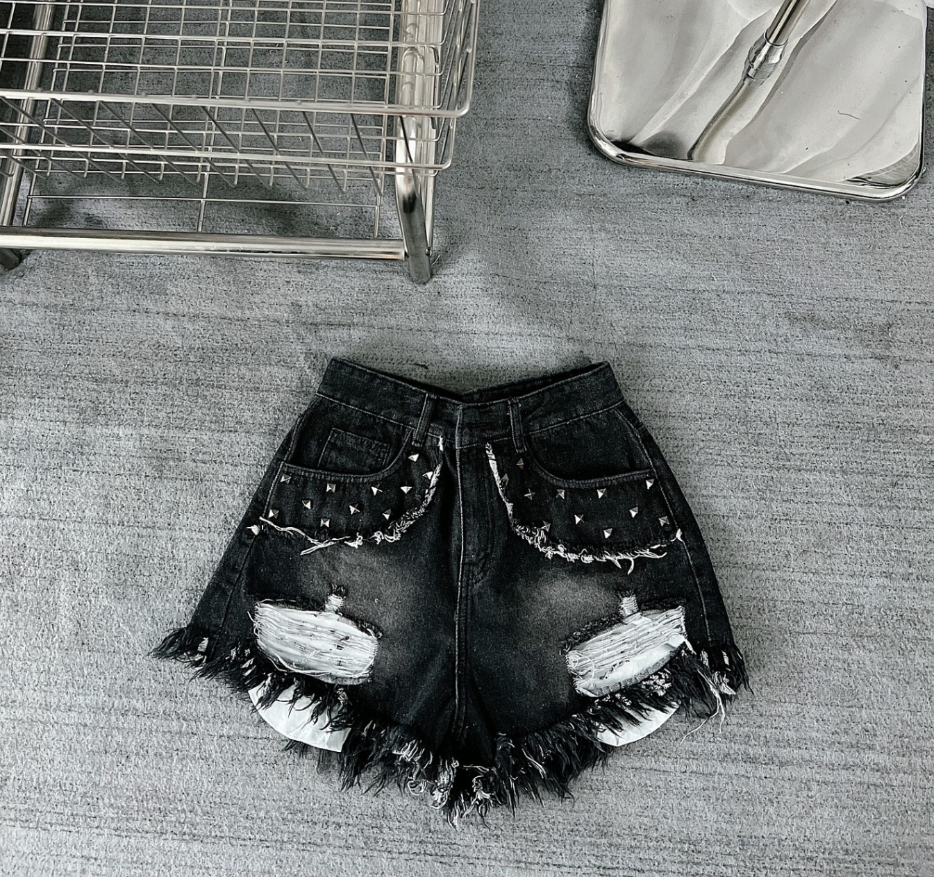 + Kiểu dáng: quần short kiểu rách , túi lòi , rách 2 bên hông , tua rua phần ống quần , lưng cao , đín hạt kiểu 2 bên túi trước tạo điểm nhấn cho quần