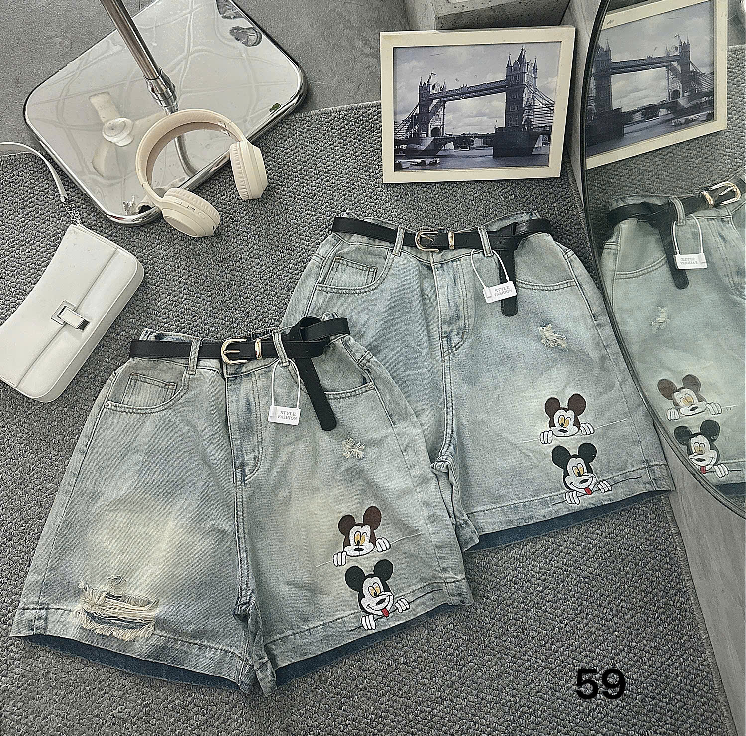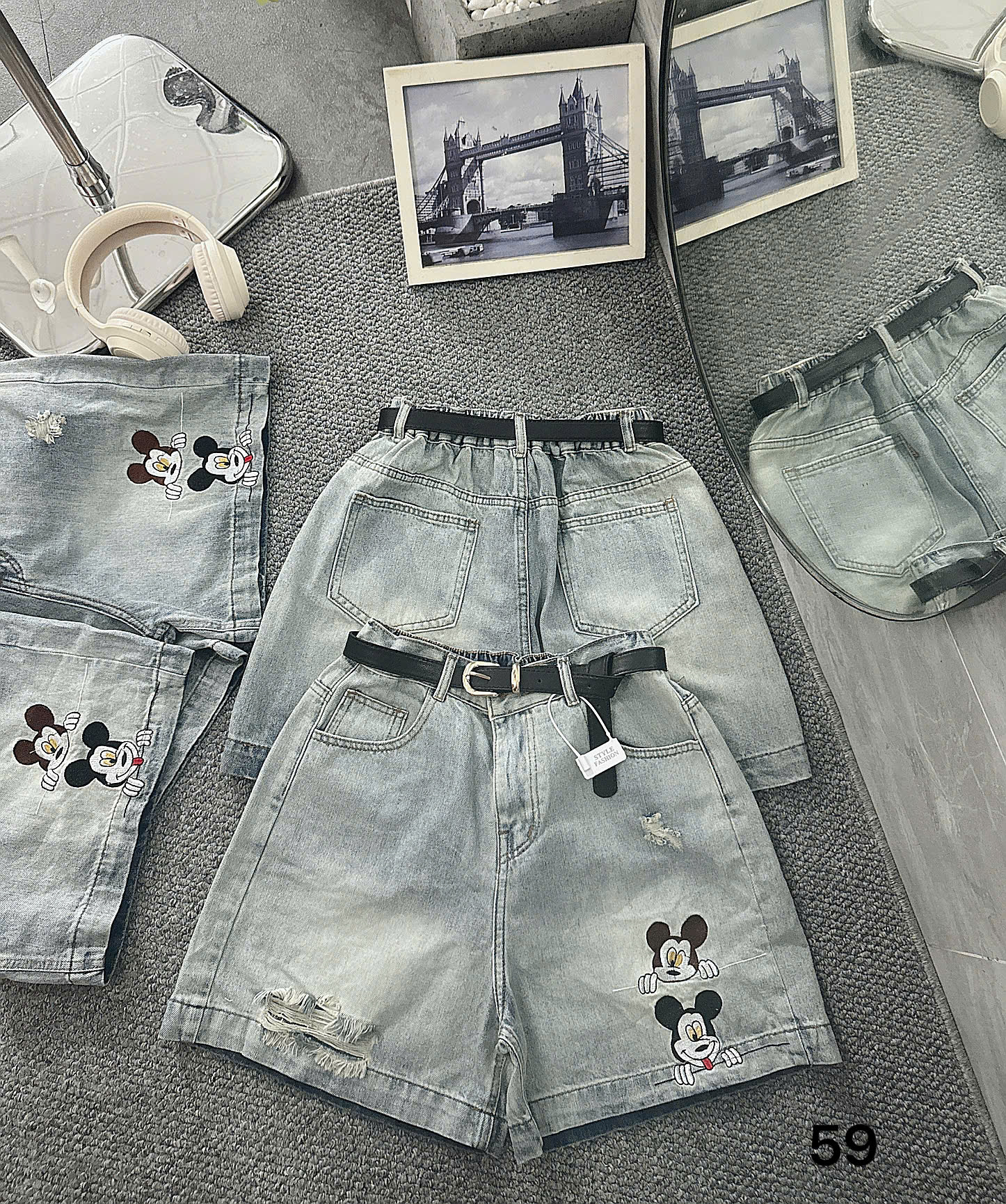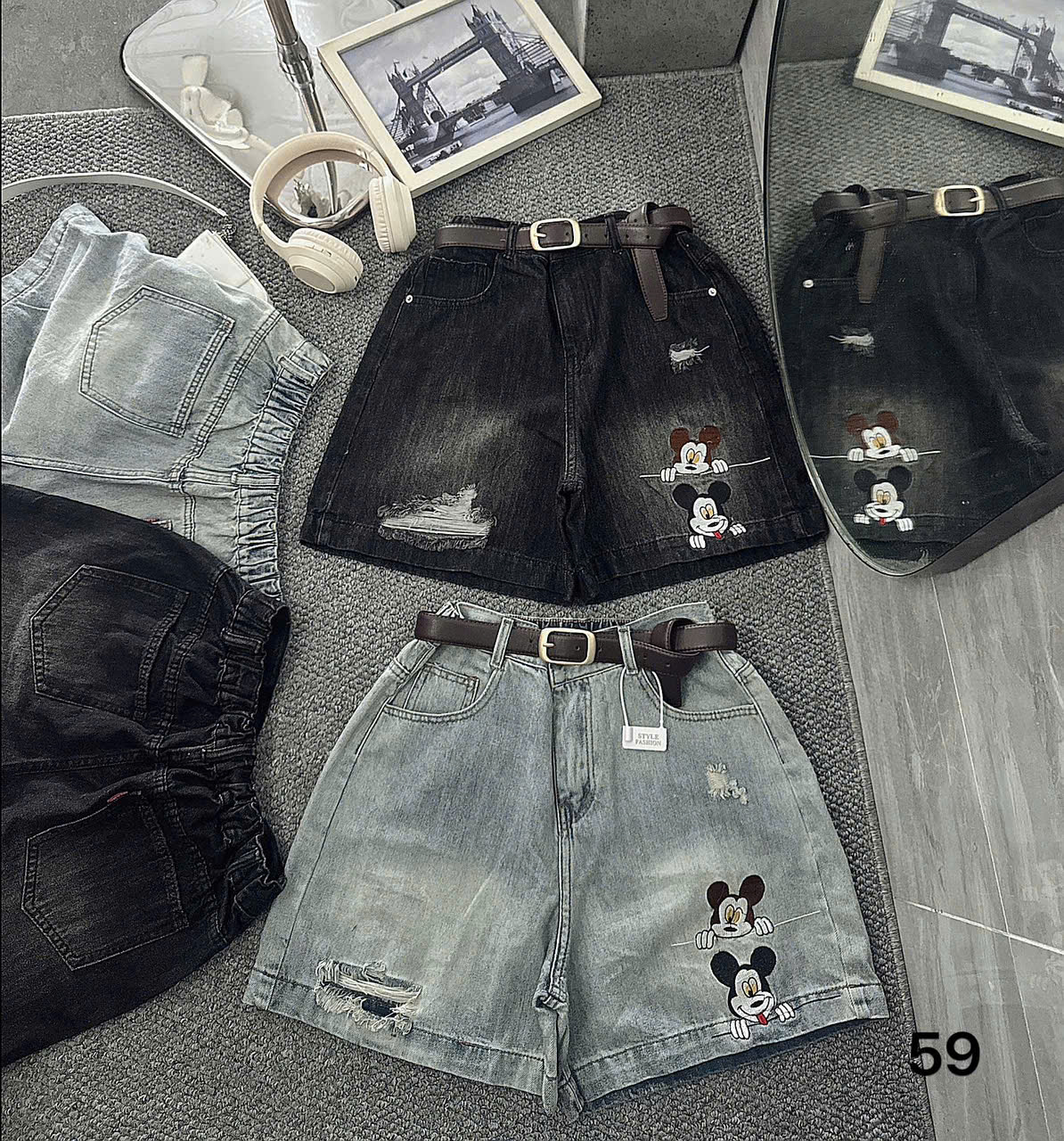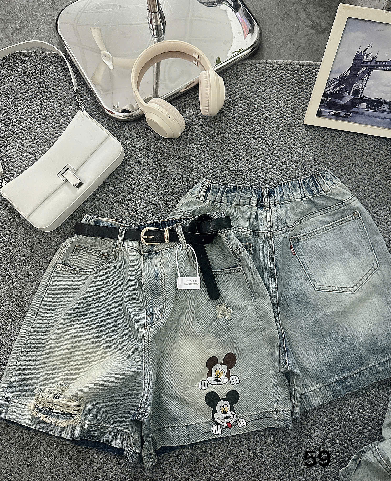 - Kiểu dáng : quần short lửng kiểu căn bản , lưng cao giúp hack dáng, lưng thun phía sau co giãn tốt giúp người mặc thoải mái hơn , có túi thật trước và sau , thân trước cào rách nhẹ ,1 bên ống quần thêu chuột xin xắn .